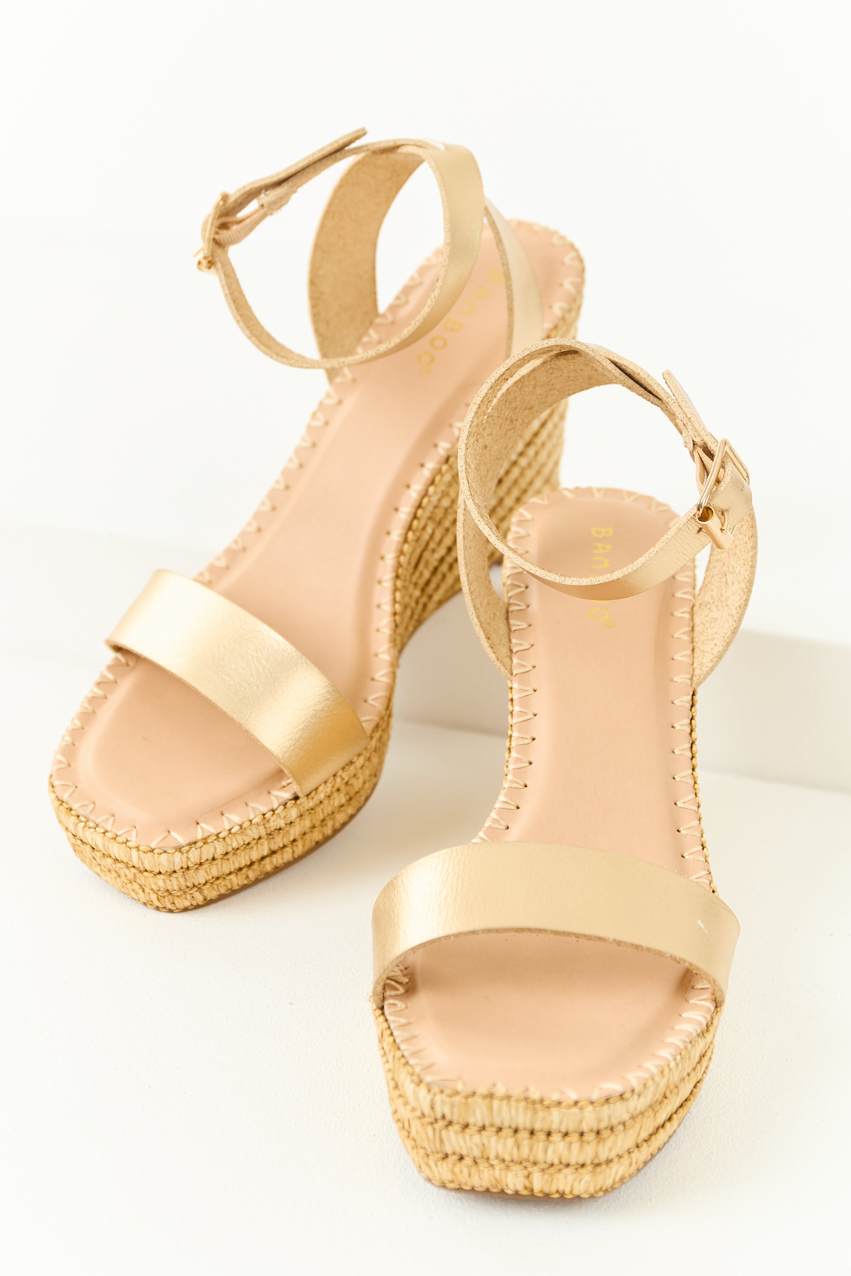 Experience style and comfort with these beige raffia platform wedges featuring gold straps . Designed with faux leather straps, an adjustable buckle ankle strap, and a slightly cushioned insole for all-day wear. The 4.25″ heel, 1″ platform, and square open toe add a touch of elegance. Measurement based on size 8. Elevate your summer look with these chic and versatile platform wedges that combine natural texture with a trendy design.