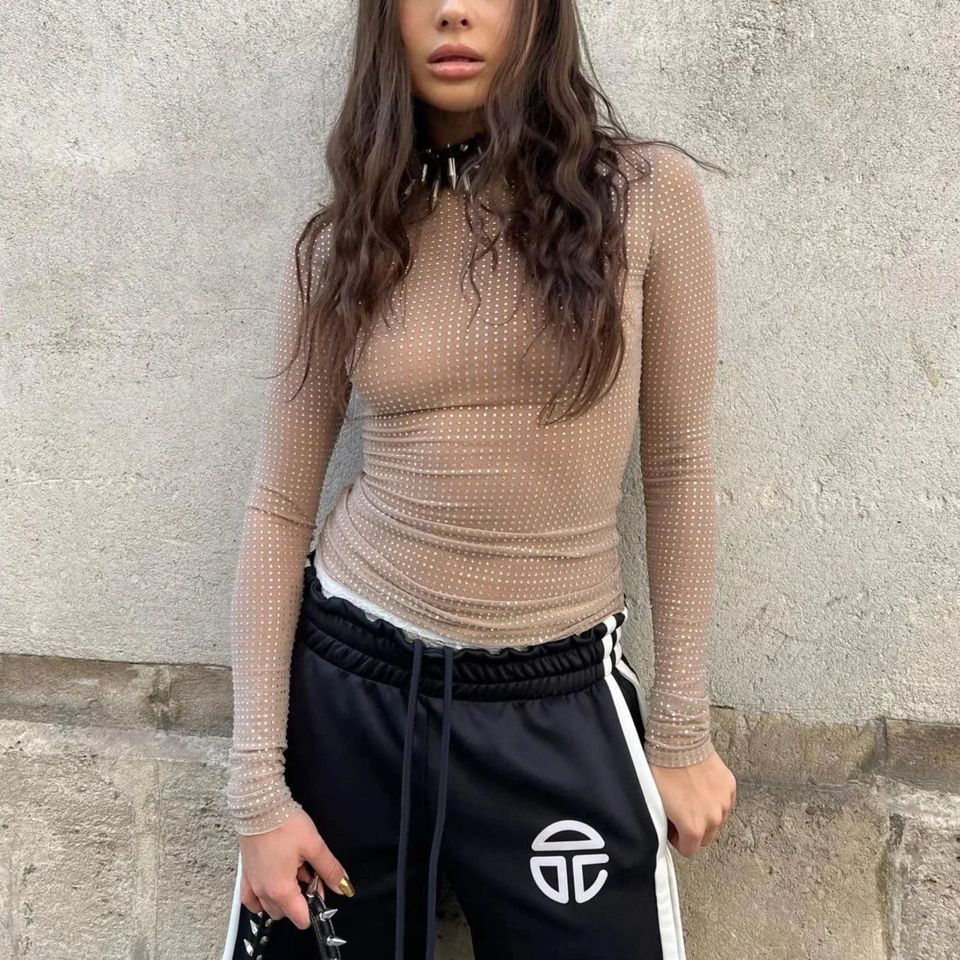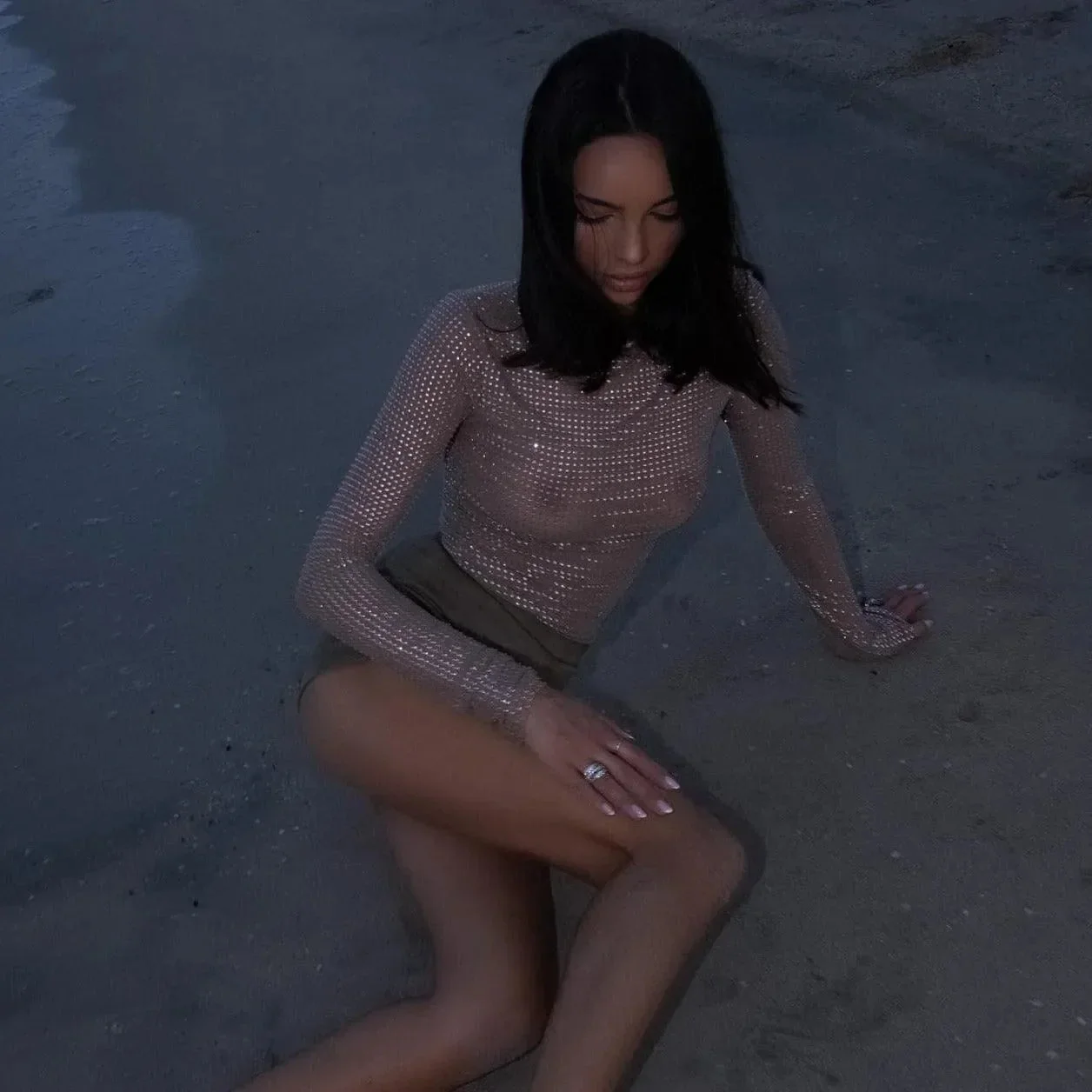 Elevate your wardrobe with this elegant beige long-sleeved crop top adorned with shimmering rhinestones that beautifully catch the light. This versatile piece seamlessly blends sophistication, comfort, and glamour, perfect for formal occasions or stylish evenings out. The fitted crew-neck style, semi-sheer design, and straight hem enhance your look effortlessly. Made from high-quality 96% Polyester and 4% Elastane for a flattering fit. Pair it with a chic skirt for a polished appearance. Dont miss adding this exquisite beige crop top to your collection for a touch of luxury. Discover more style inspiration on Instagram @mermaid_way.