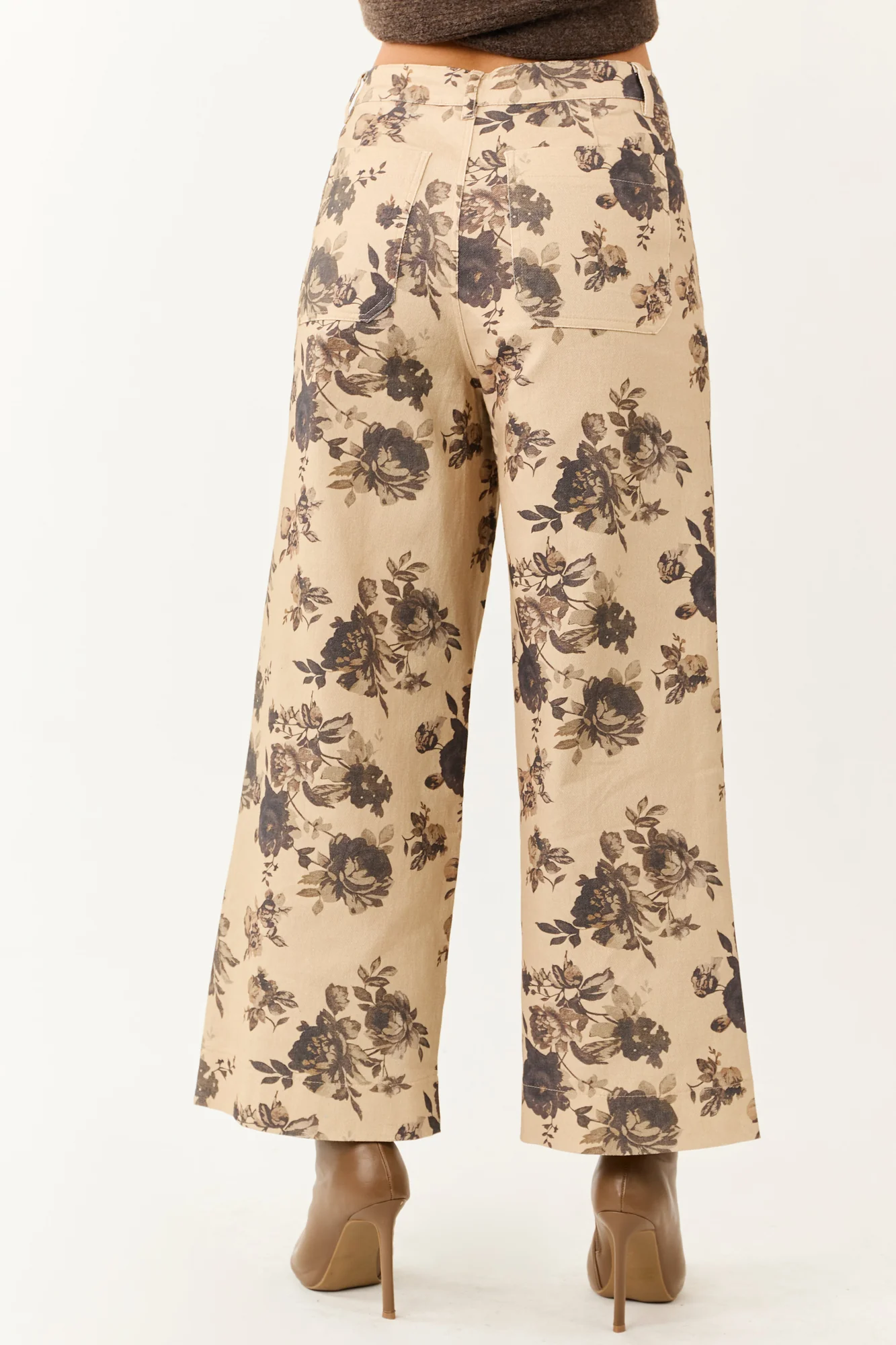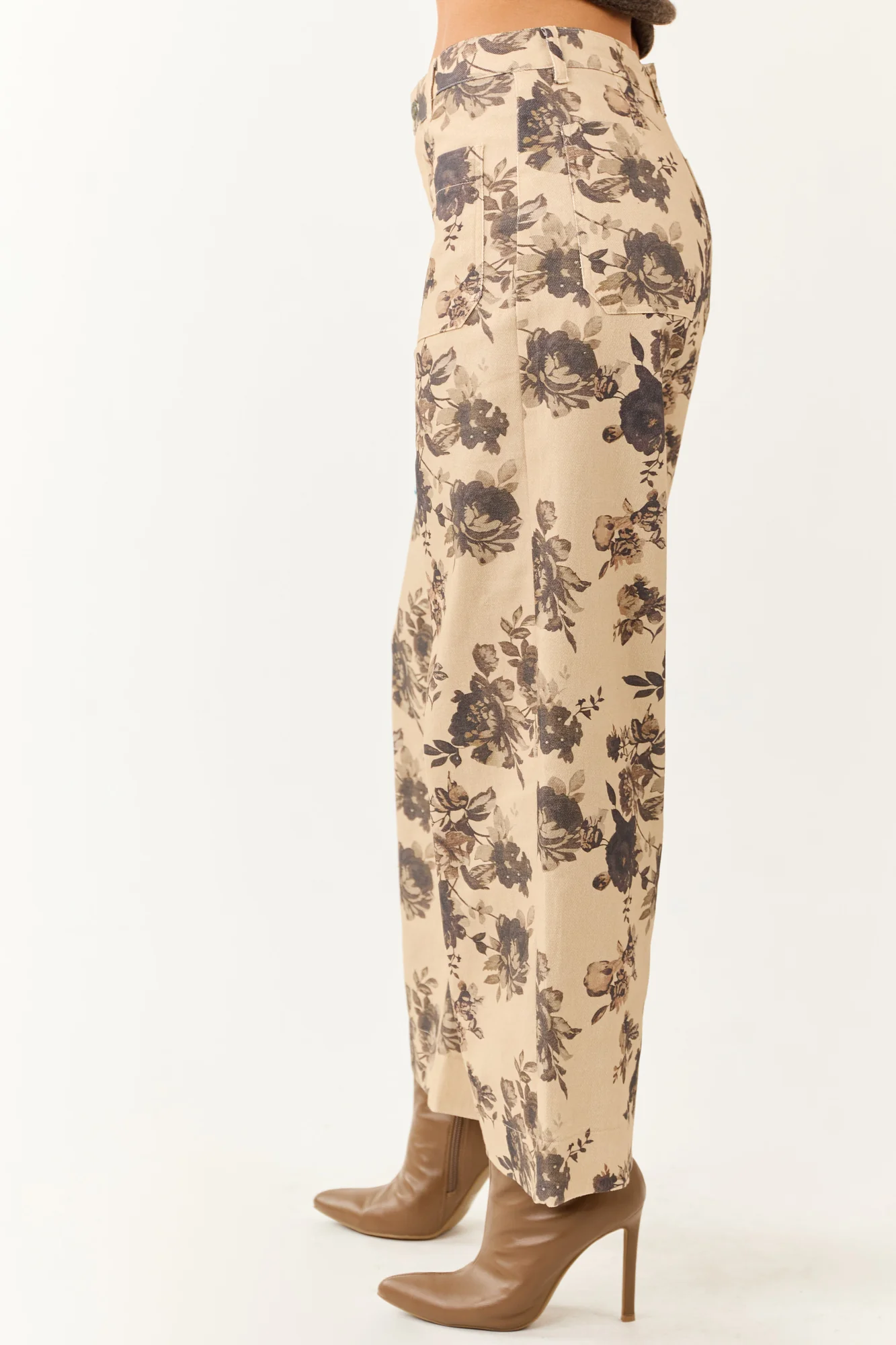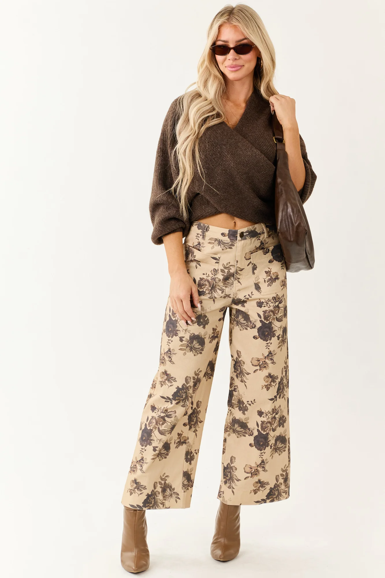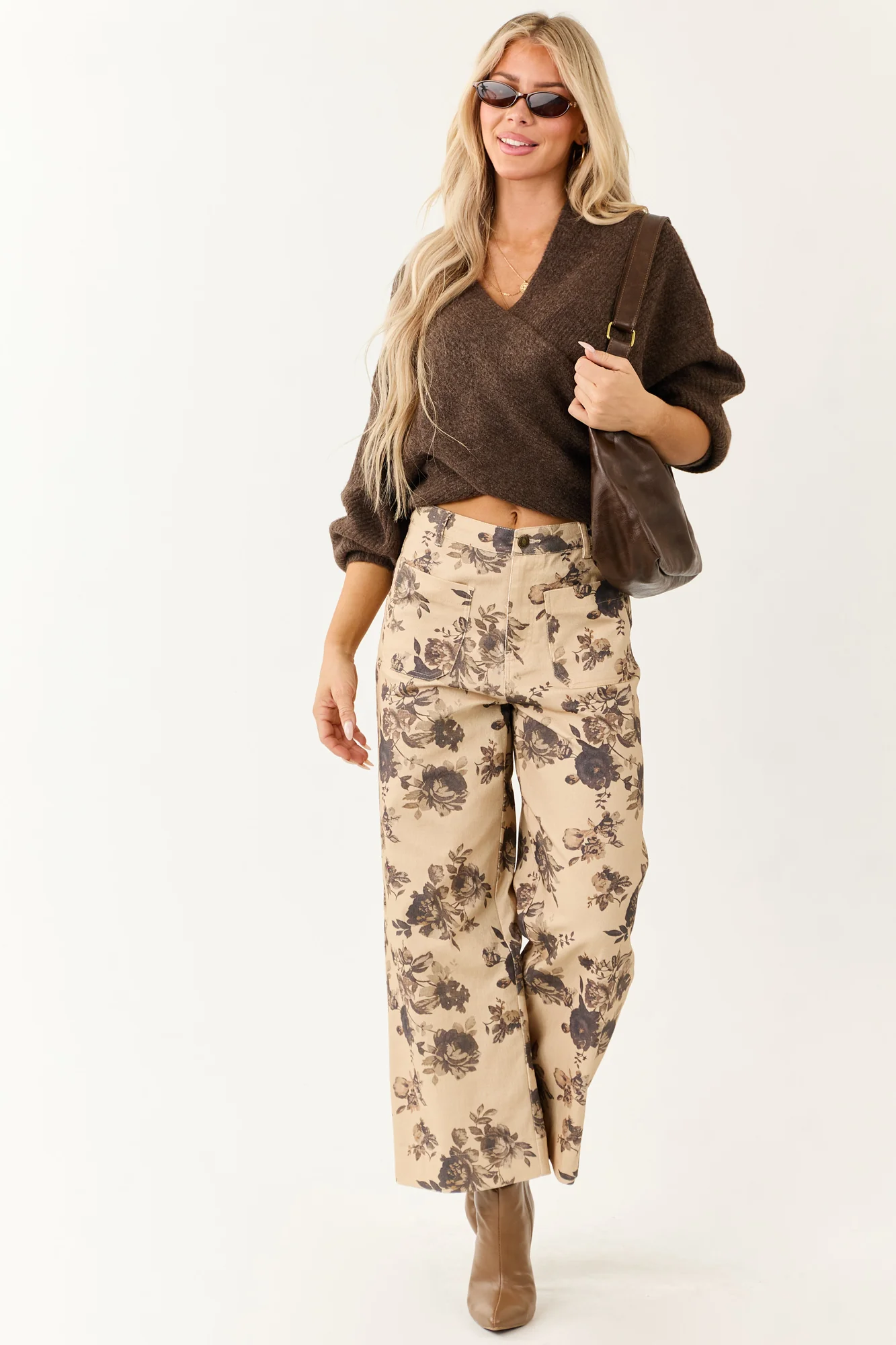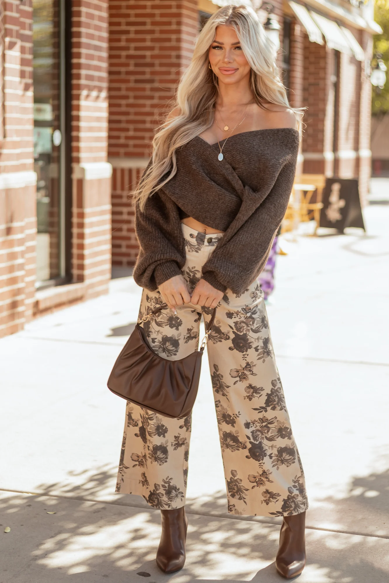 Embrace vintage-inspired style with these beige rose print high rise denim pants. Designed with a stretchy lightweight fabric featuring a soft rose print in cocoa, mocha, and light coffee shades, these pants offer a flattering high rise fit and ankle length. Complete with belt loops, four pockets, and front patch pockets. Made of 95% Cotton and 5% Spandex. Perfect for pairing with Walnut Crossover V Neck Puff Sleeve Sweater. Model is wearing a size Small.