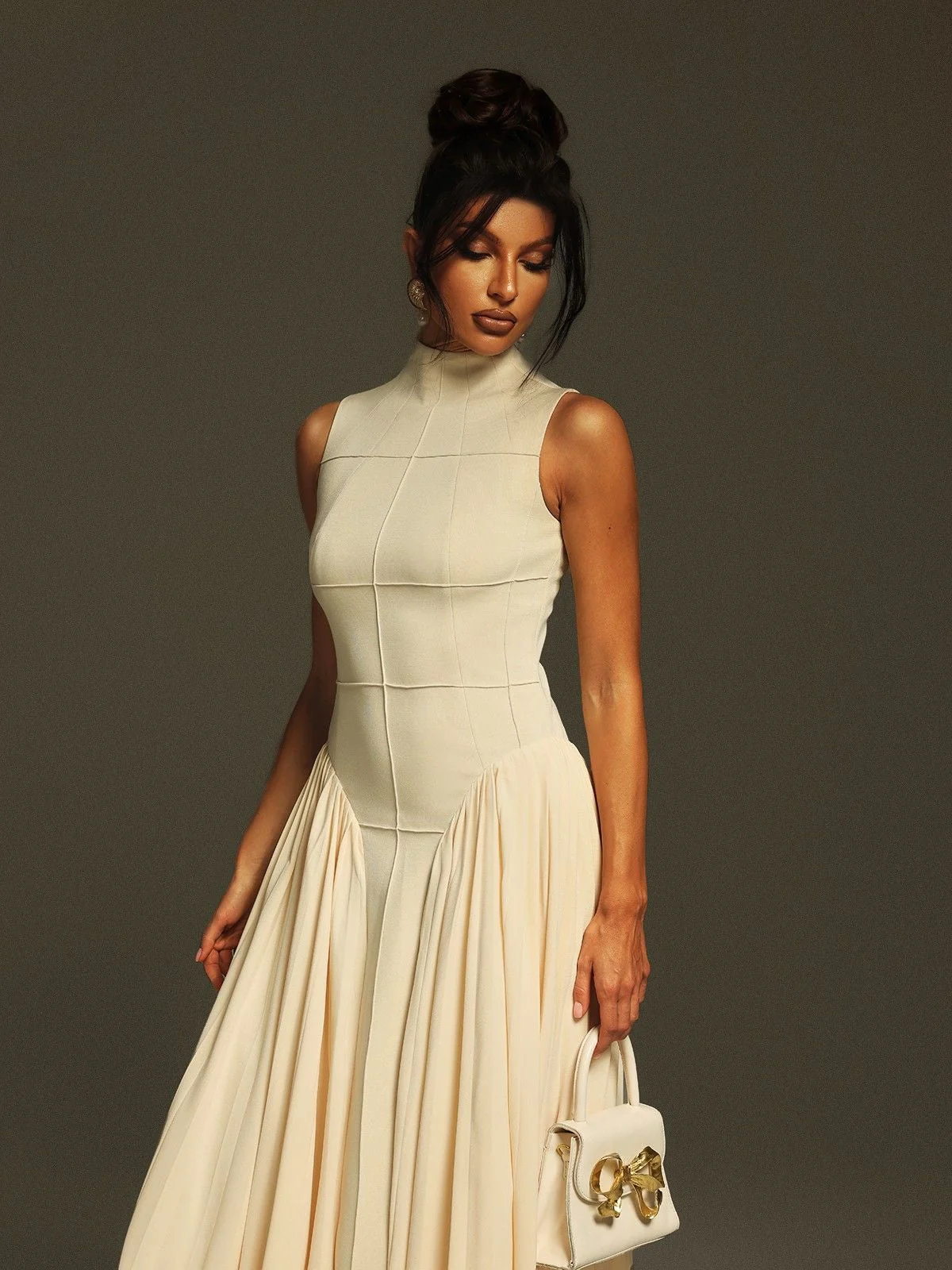 The Beige Ruched Sleeveless Midi Dress by Li Fu is a versatile piece suited for both casual and formal occasions. Crafted from lightweight 100% Polyester with a flattering ruched design, this dress offers a slim fit and slight stretch for all-day comfort. Featuring an invisible zipper at the back and a timeless design, this dress exudes elegance. Stay effortlessly stylish and comfortable with this must-have wardrobe addition. Dry clean only. Please note that color may vary due to lighting. Available in sizes S, XS, M, L, and XL.