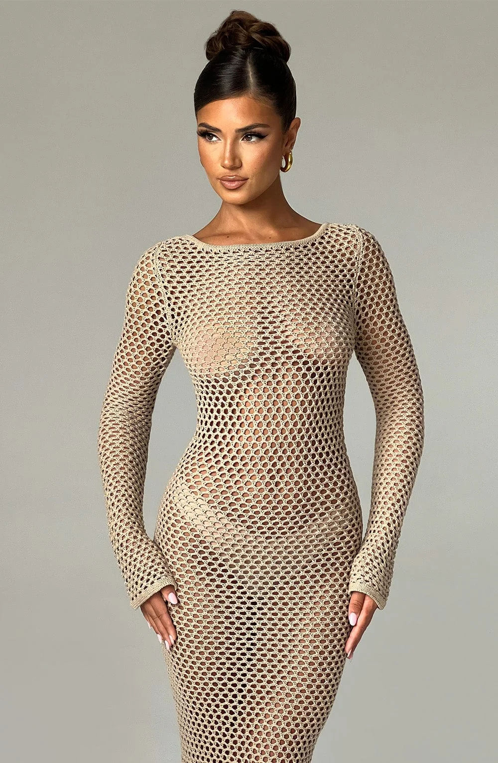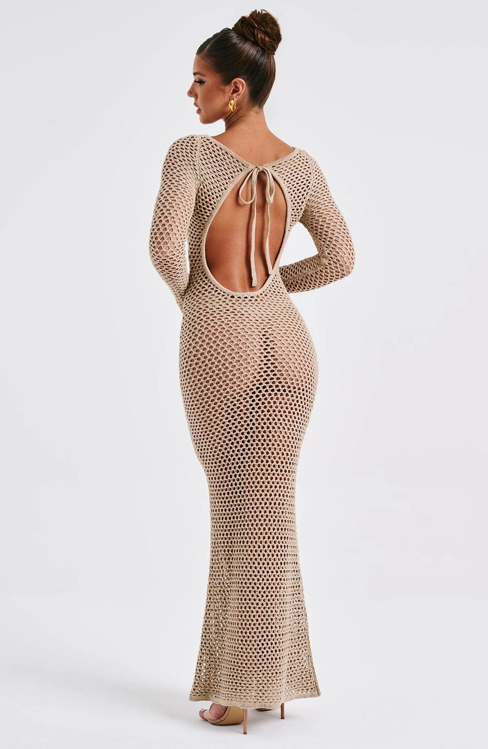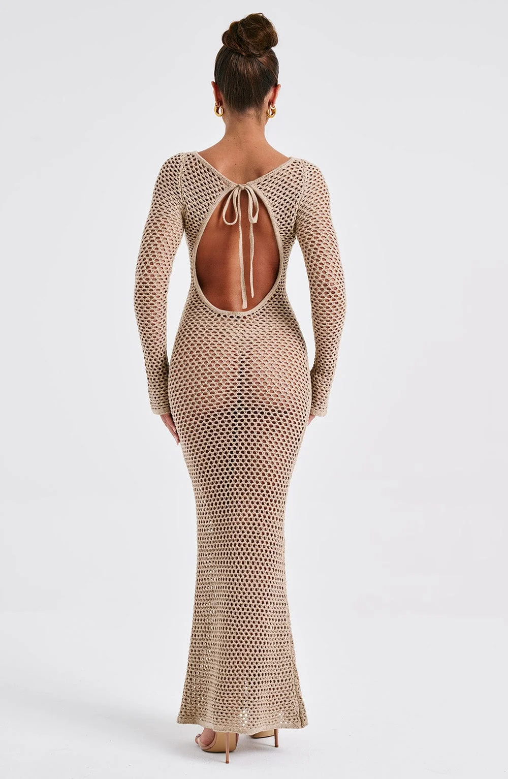 Indulge in the elegance of our Moana beige sheer knit maxi dress, ideal for long days and nights. Featuring a captivating low back, high neckline, and flattering long flared cuffs, this premium design effortlessly enhances your look. Crafted from sheer knit fabric, this maxi dress includes a tie at the top of the neck for added charm. Complete your ensemble with soft, textured hair, luxurious golden accessories, and stylish heeled sandals. This timeless piece is maxi length and perfect for various occasions. Model wearing size XS. F-cup size available.