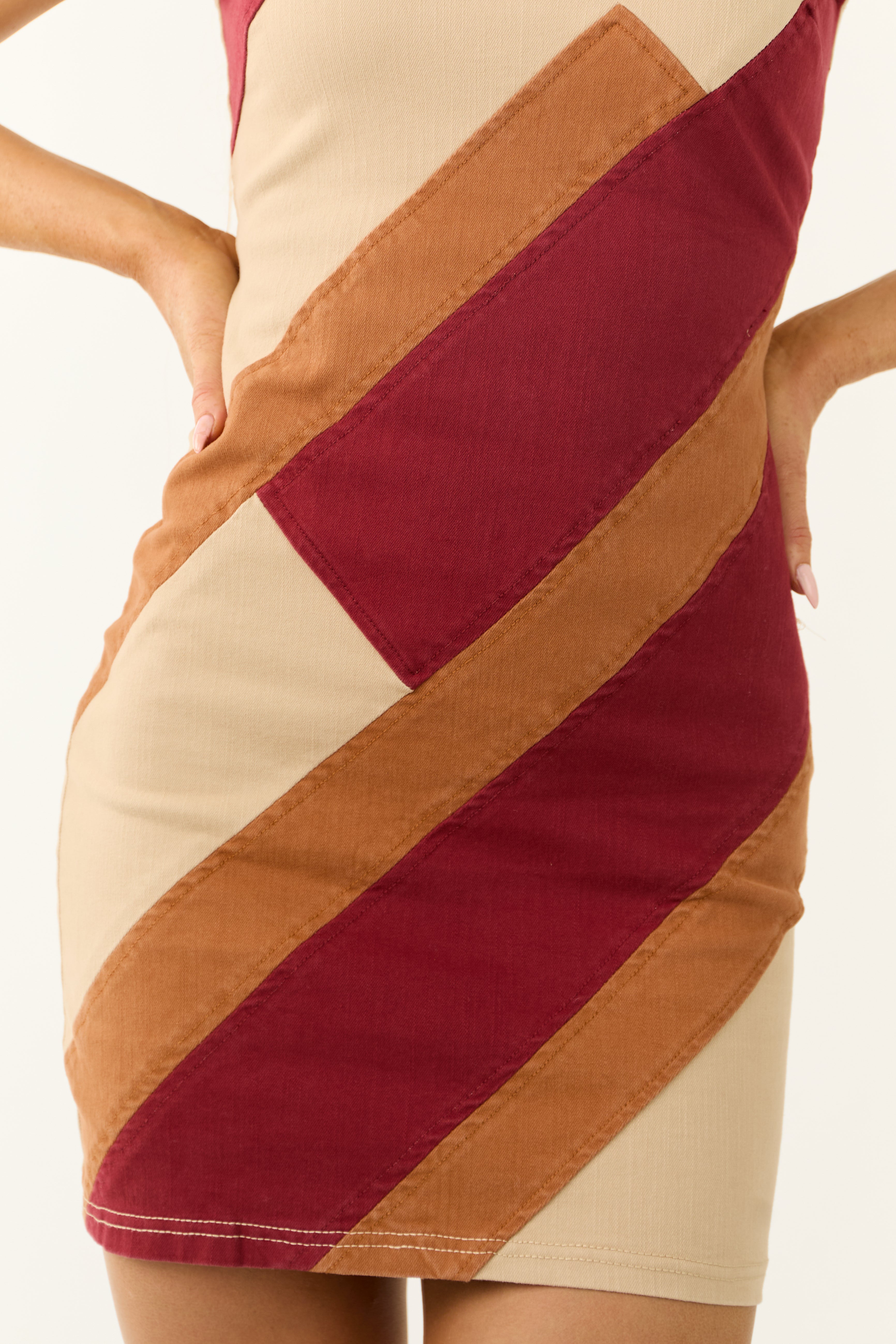 Elevate your style with our Beige Sleeveless Denim Colorblock Sheath Dress. This comfortable dress features colorblock patches in stunning Ruby and Tawny shades, a chic square neckline, and a flattering sheath fit. Made from semi-stretchy denim, this dress is perfect for any occasion. Add a touch of sophistication to your wardrobe with this unique piece. Note: Hand wash cold, do not bleach, hang to dry for best results.