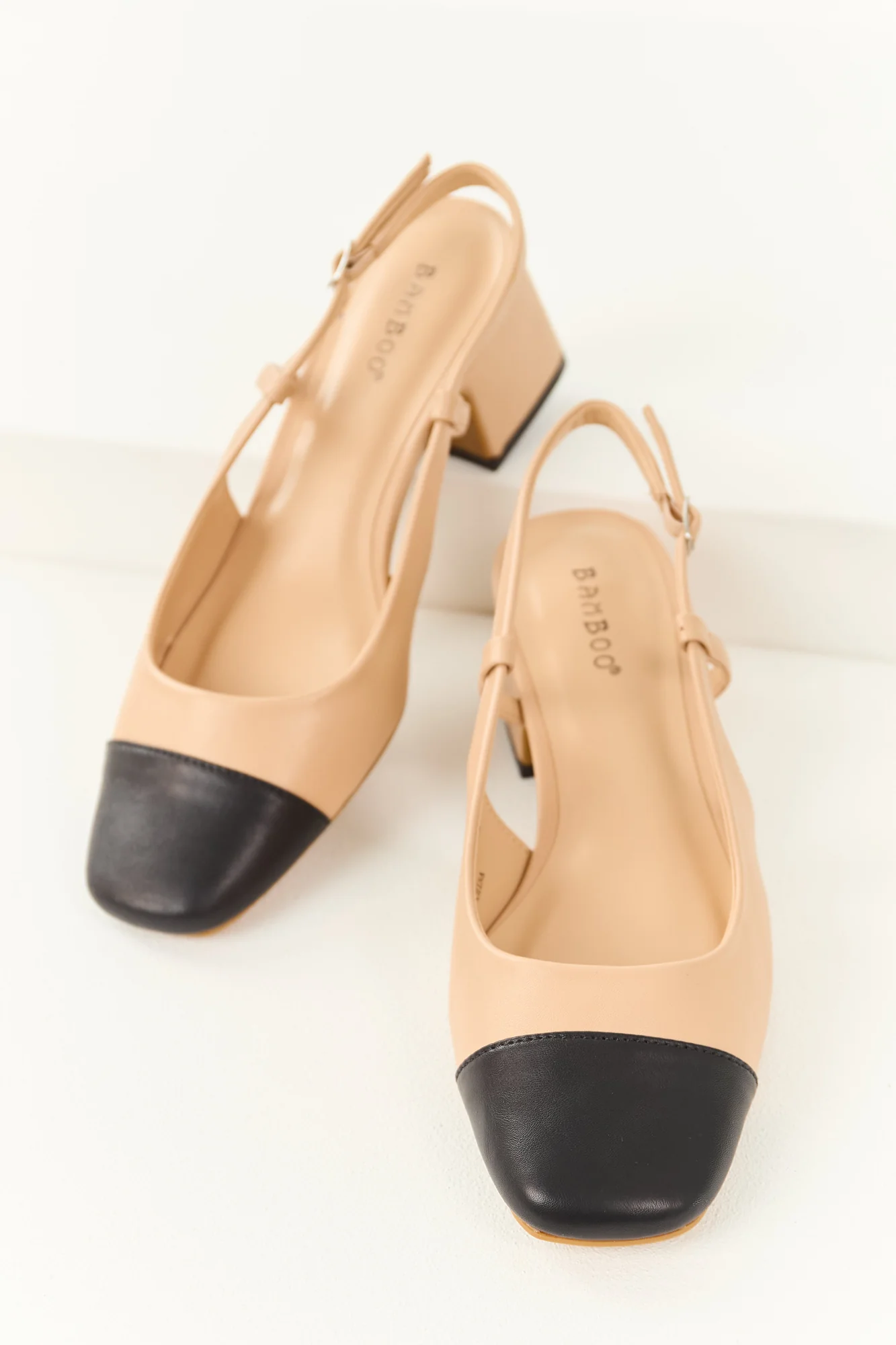 Elevate your style with these beige and black contrast chunky heels. Crafted from faux leather, these shoes offer a perfect blend of modern edge and timeless polish. The adjustable slingback heel straps, lightly cushioned insole, and chunky block heel provide both comfort and style. Measurement details: Shaft – 3″, Heel – 2.5″, Circumference – 18″. Available in various sizes.