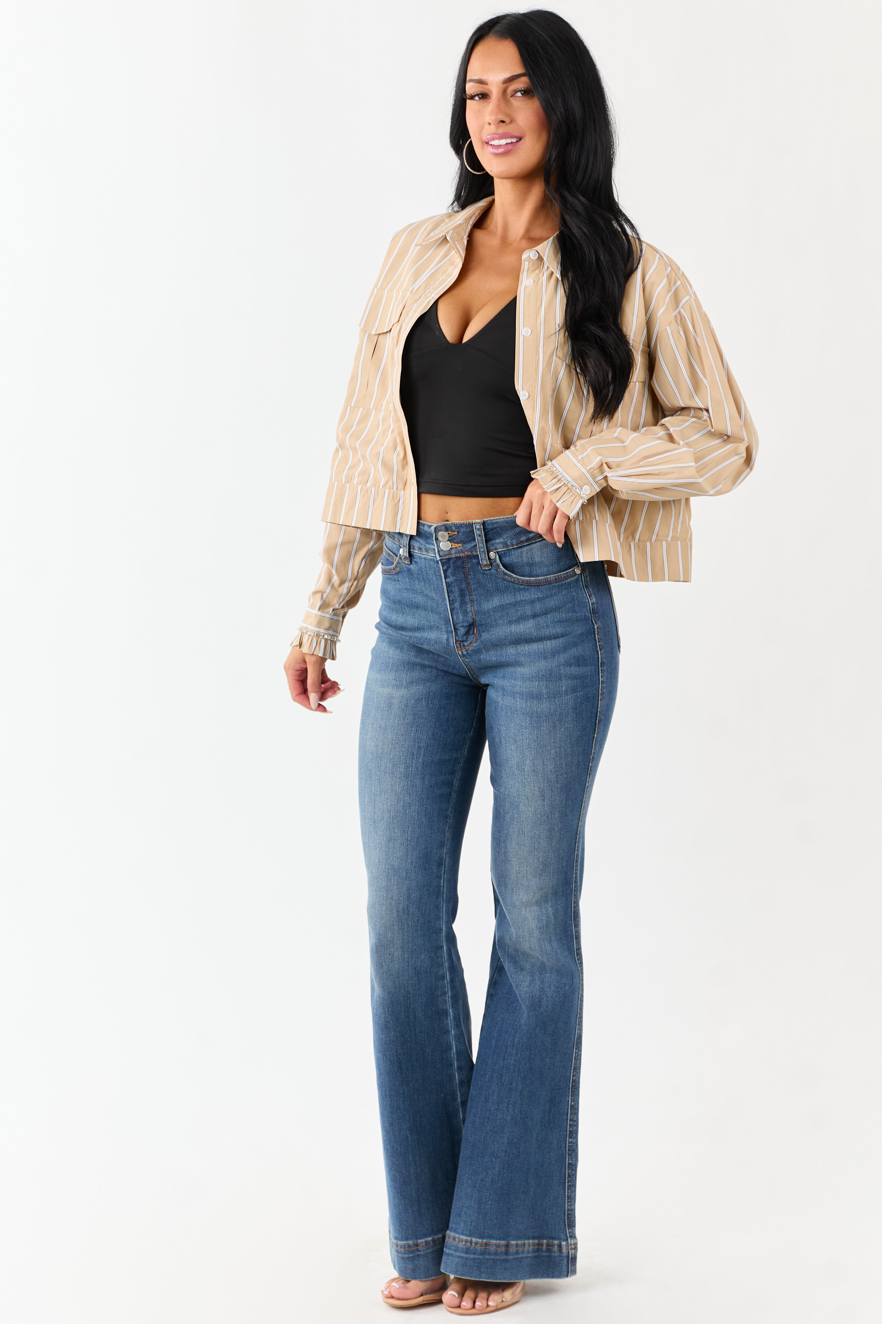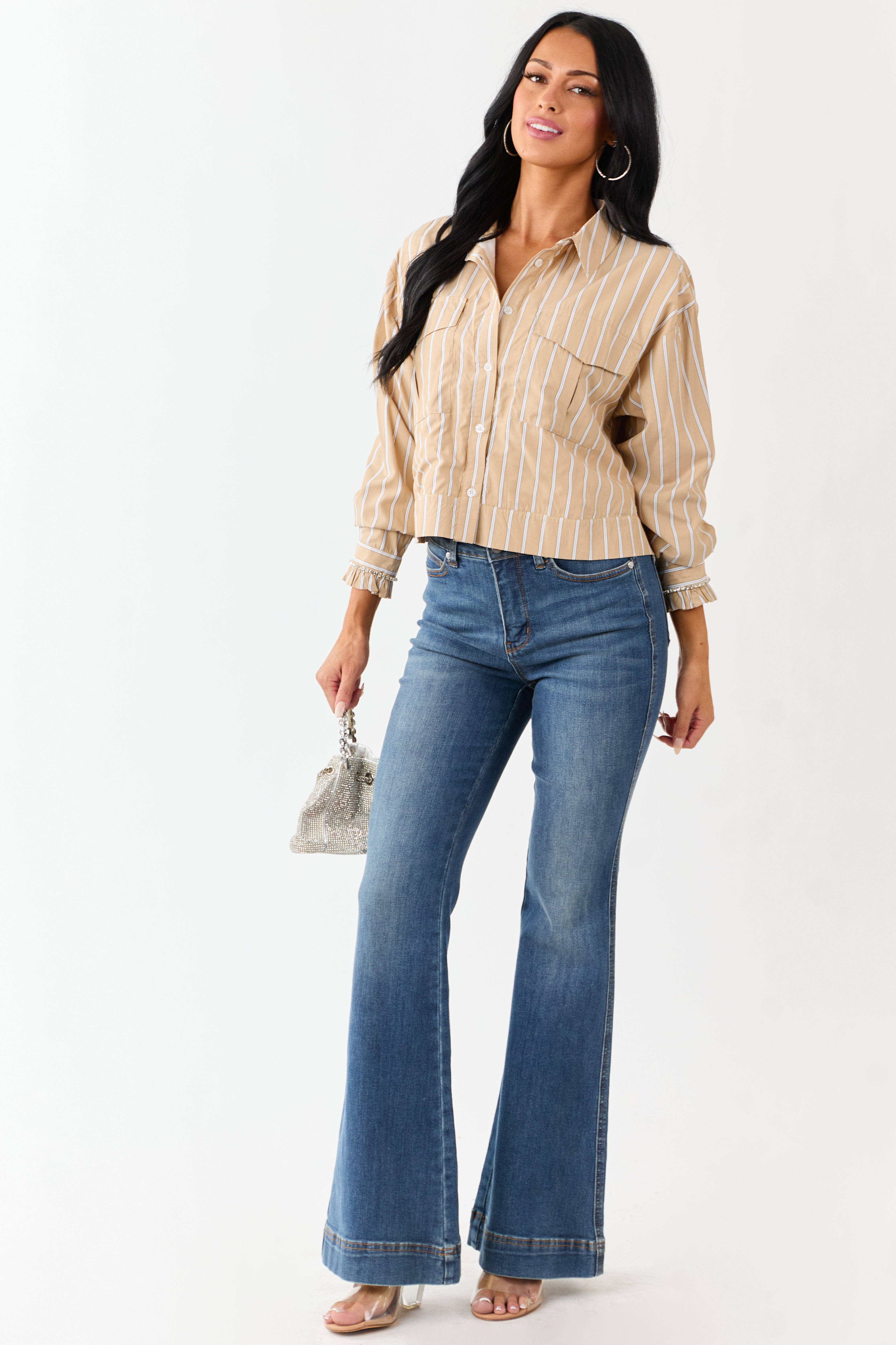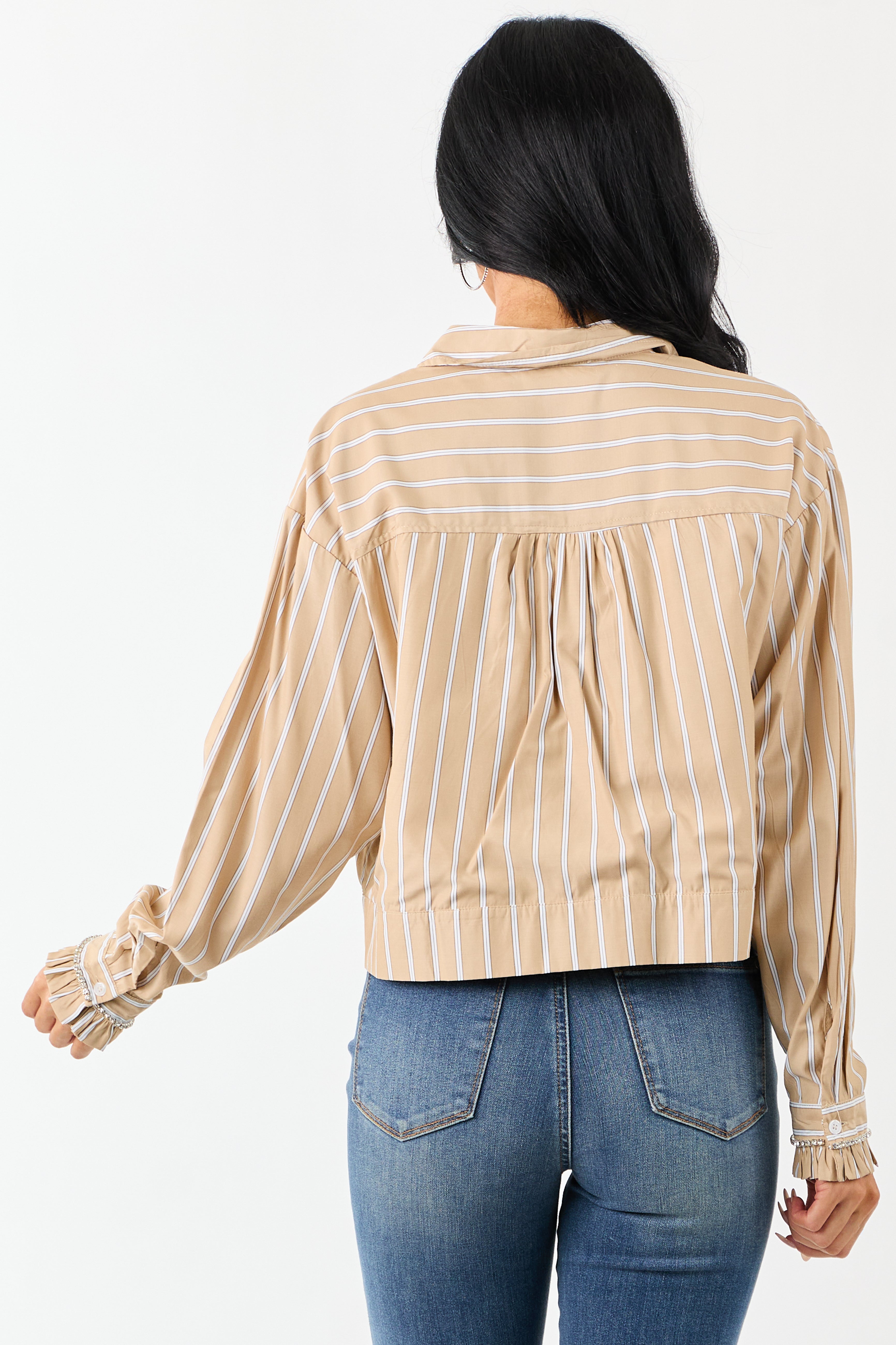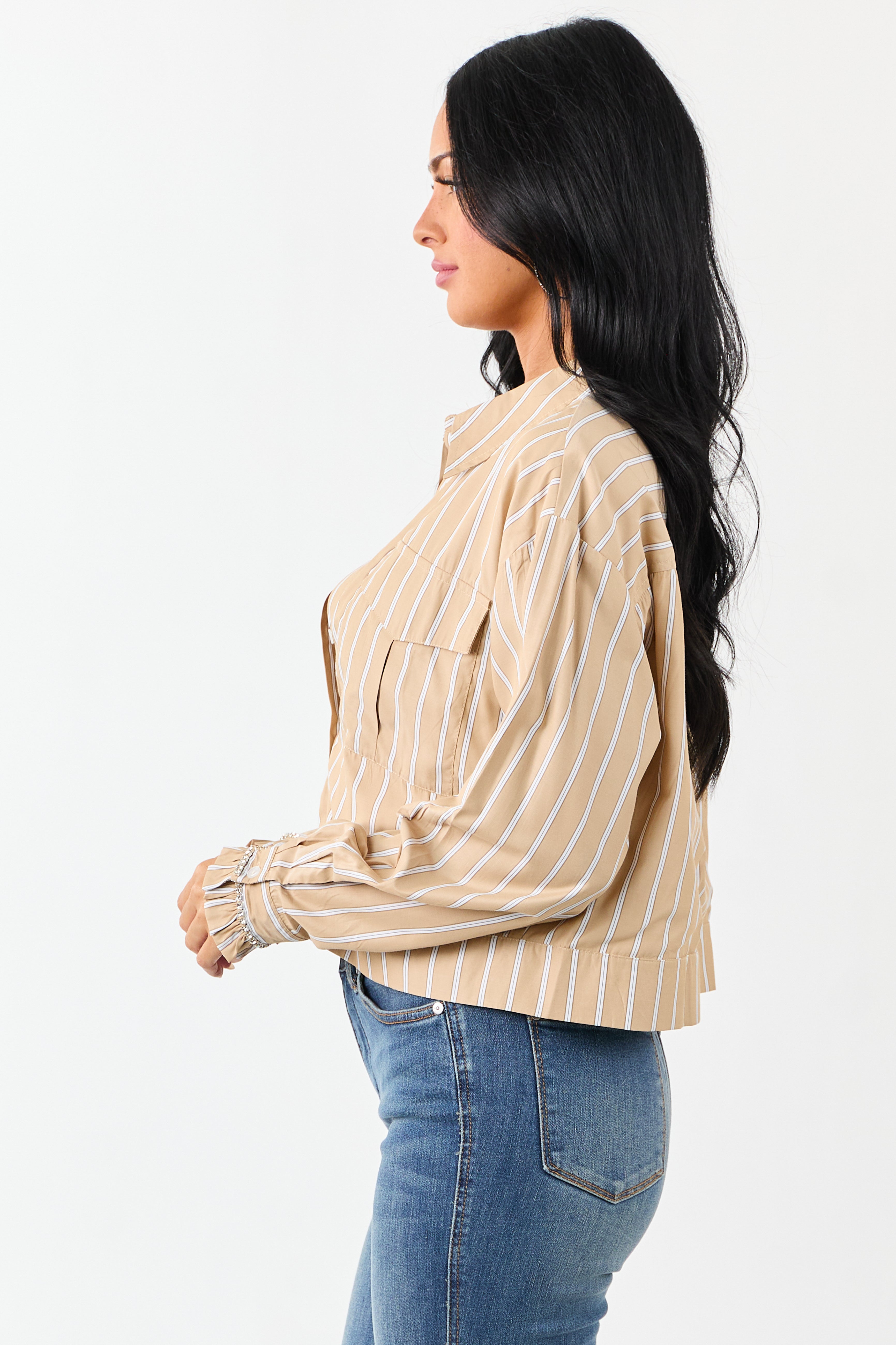 This beige cotton top in S M L sizes features stripes in taupe, white, and black, button cuffs with rhinestone ruffle trim, chest pockets, and a slightly cropped length for a stylish look. Made of breathable non-stretchy cotton with a boxy fit, this top is perfect for any casual setting. The relaxed fit top offers a pop of rhinestone attitude on the cuffs and is lined with 100% polyester for added comfort. Imported. Model is wearing a size Small. Model’s profile: Size 1, Height 59″, Bust 34″, Waist 26″.