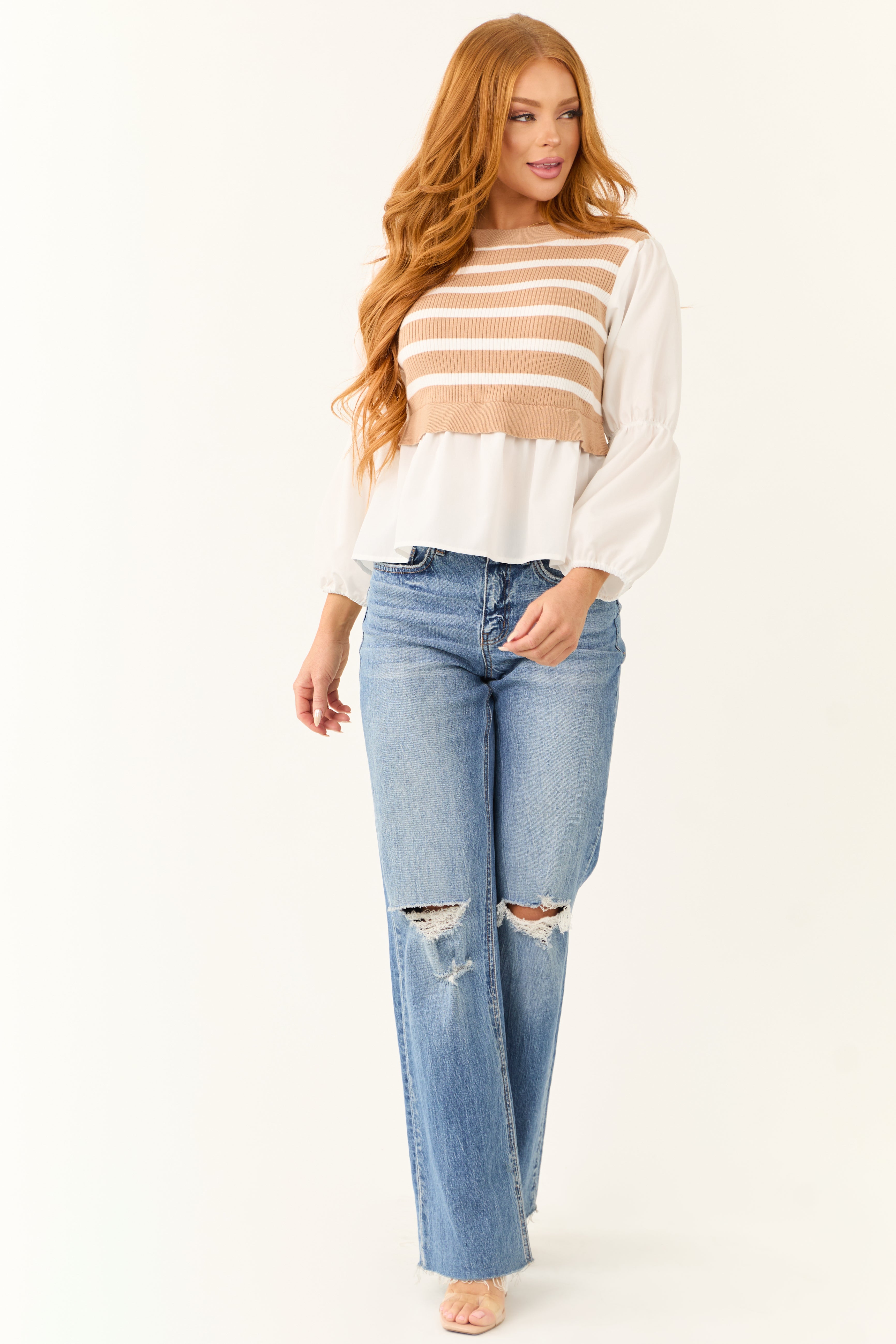 Stay stylish and warm with our Beige Striped Sweater Vest featuring a mix of cozy ribbed knit and elegant woven fabric. This versatile vest boasts sleek stripes in Black and Ivory, a flattering high neckline, chic long puff sleeves with elastic cuffs, and a charming ruffle hem. Made of quality materials for comfort and durability. Hand wash recommended. Ideal for daytime wear in fall and winter seasons. Available in sizes S, M, L. Bring fashion and comfort together in this must-have piece + Moon.