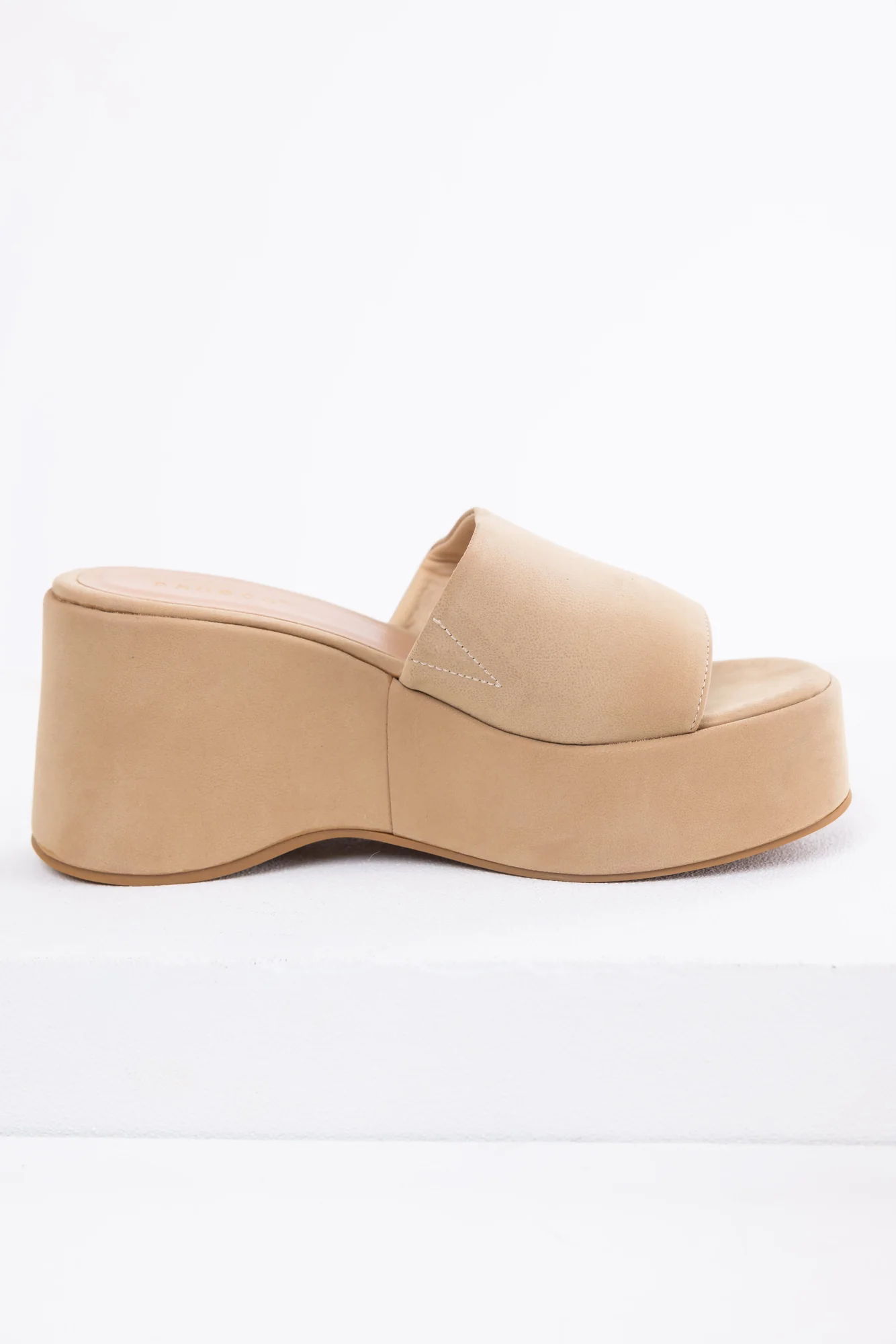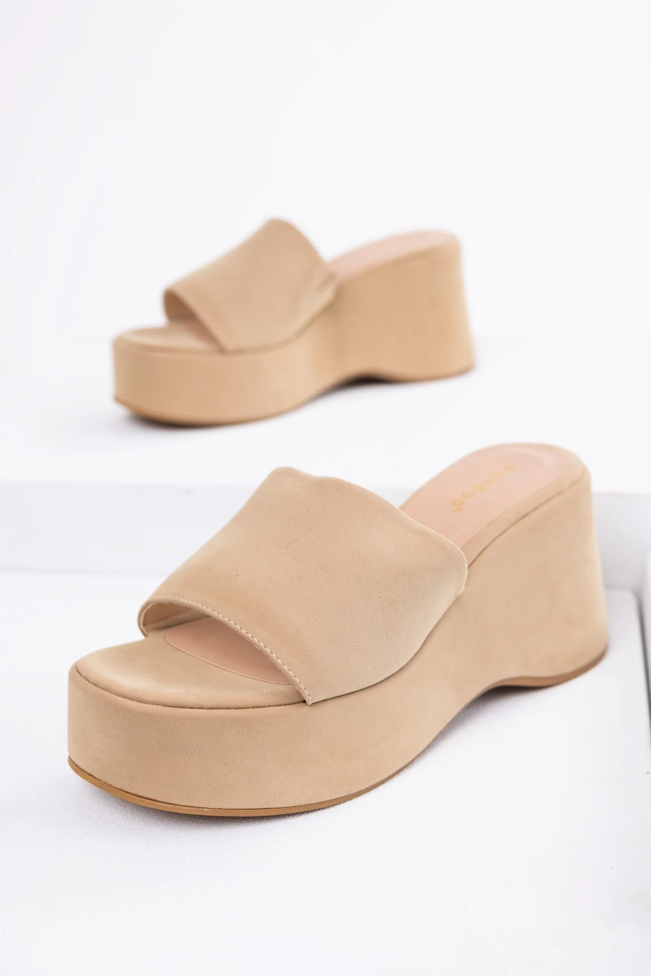 Experience ultimate comfort with these beige suede platform wedge sandals. Crafted from quality nubuck suede, they feature an open toe, wide single band, and a rounded toe for all-day wear. The 1.5″ platform and 3.25″ heel provide the perfect lift, while the 3″ strap ensures a secure fit. Available in multiple sizes for the perfect fit. Add a touch of elegance to your ensemble with these imported wedge sandals.