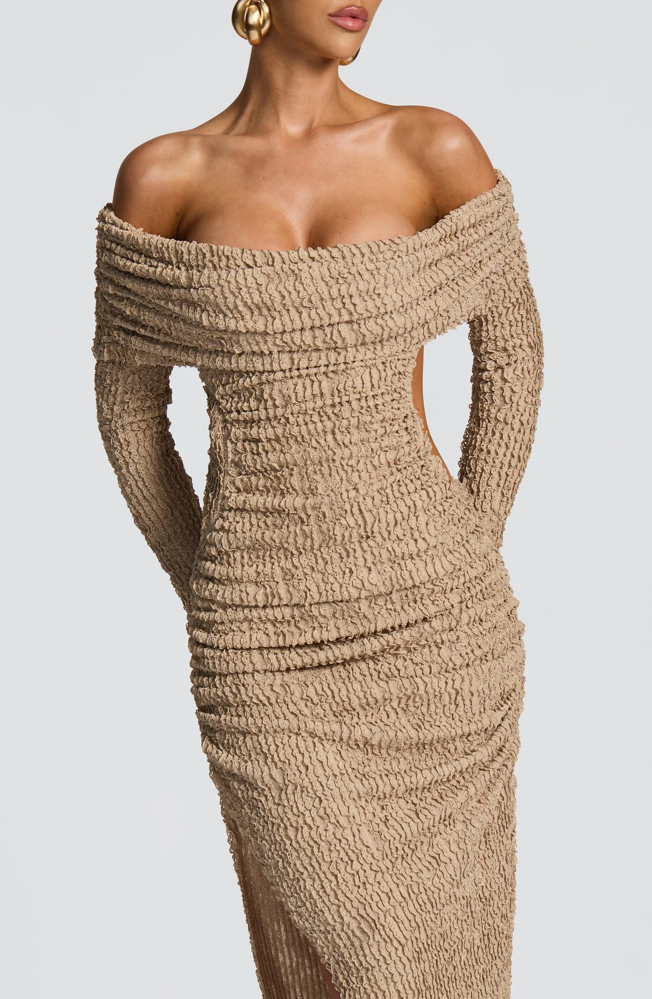 Tags: bardot neckline, beige dress, formal dress, midi dress, Textured Fabric