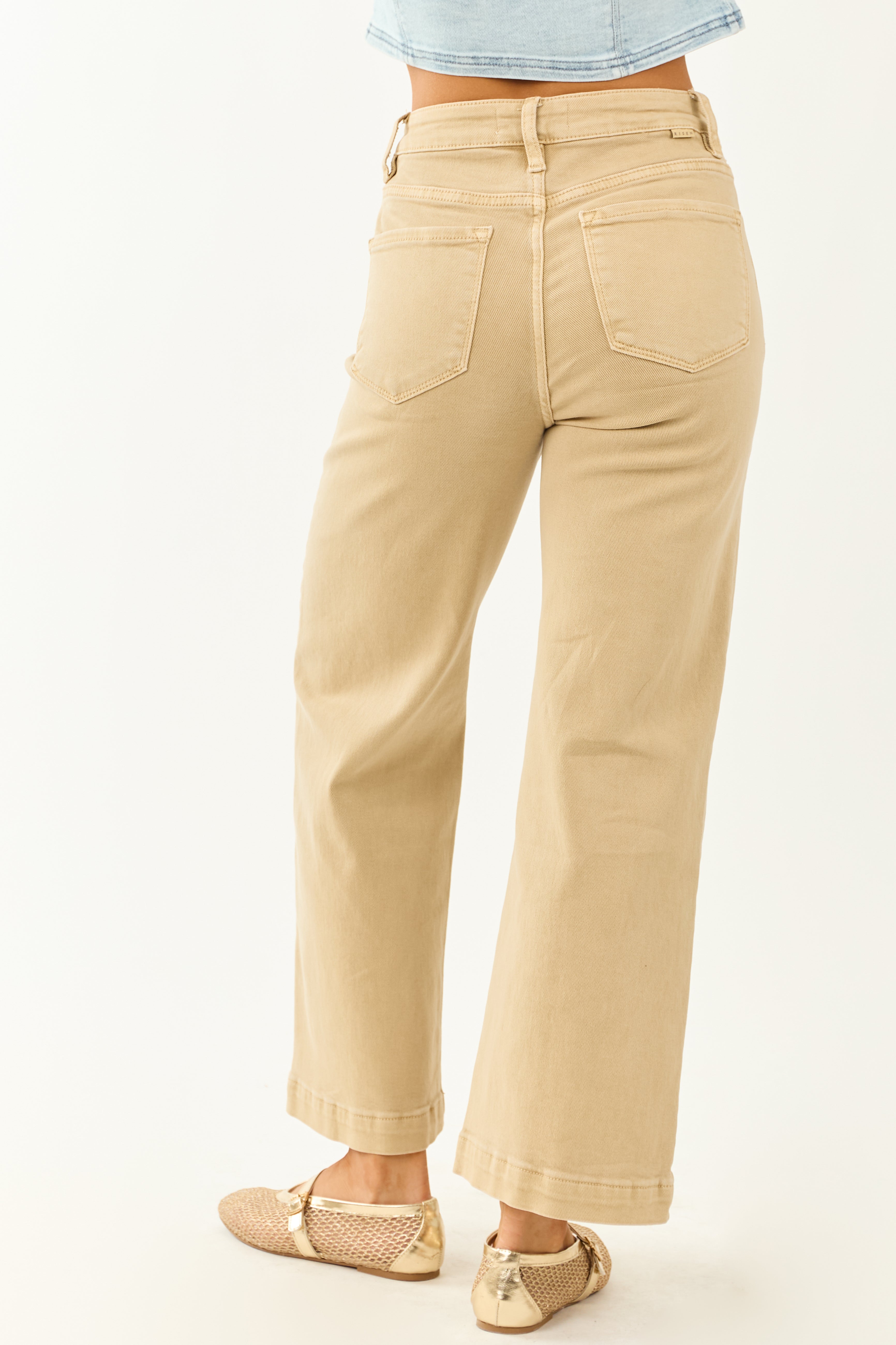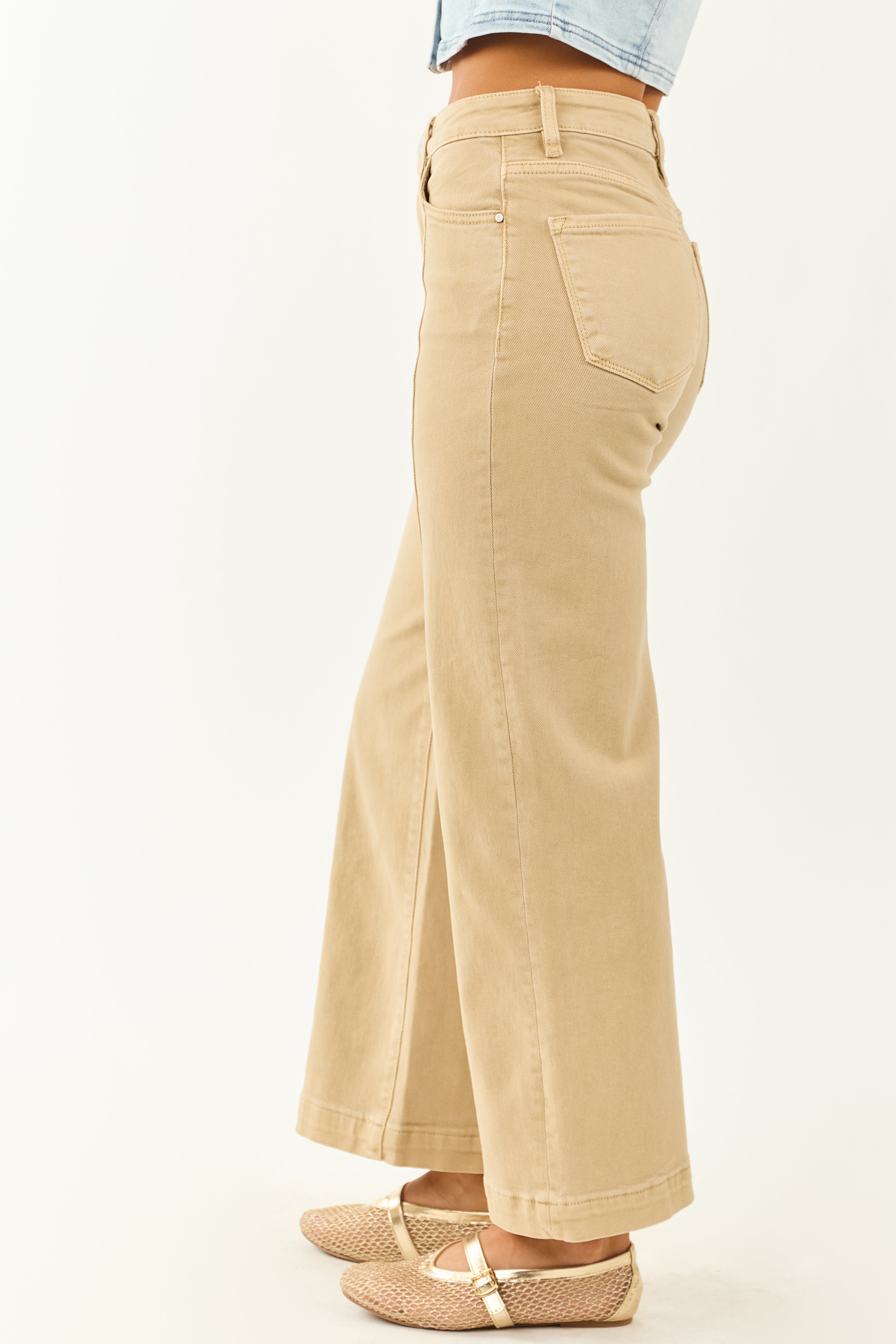 Discover the ultimate comfort in these smooth and sculpted Beige Tummy Control Stretchy Wide Leg Jeans with built-in tummy control and forgiving waistband. Made of stretchy denim for a sleek look, featuring a high rise and ankle length design. Includes 5 functional pockets, zipper front with button closure, and belt loops. Imported, 98% Cotton, 2% Spandex. Waist: 25-33″, Hip: 32-40″, Inseam: 27″. Available in multiple sizes. Model is wearing size 3/26, Height 57″, Bust 35″, Waist 26″.