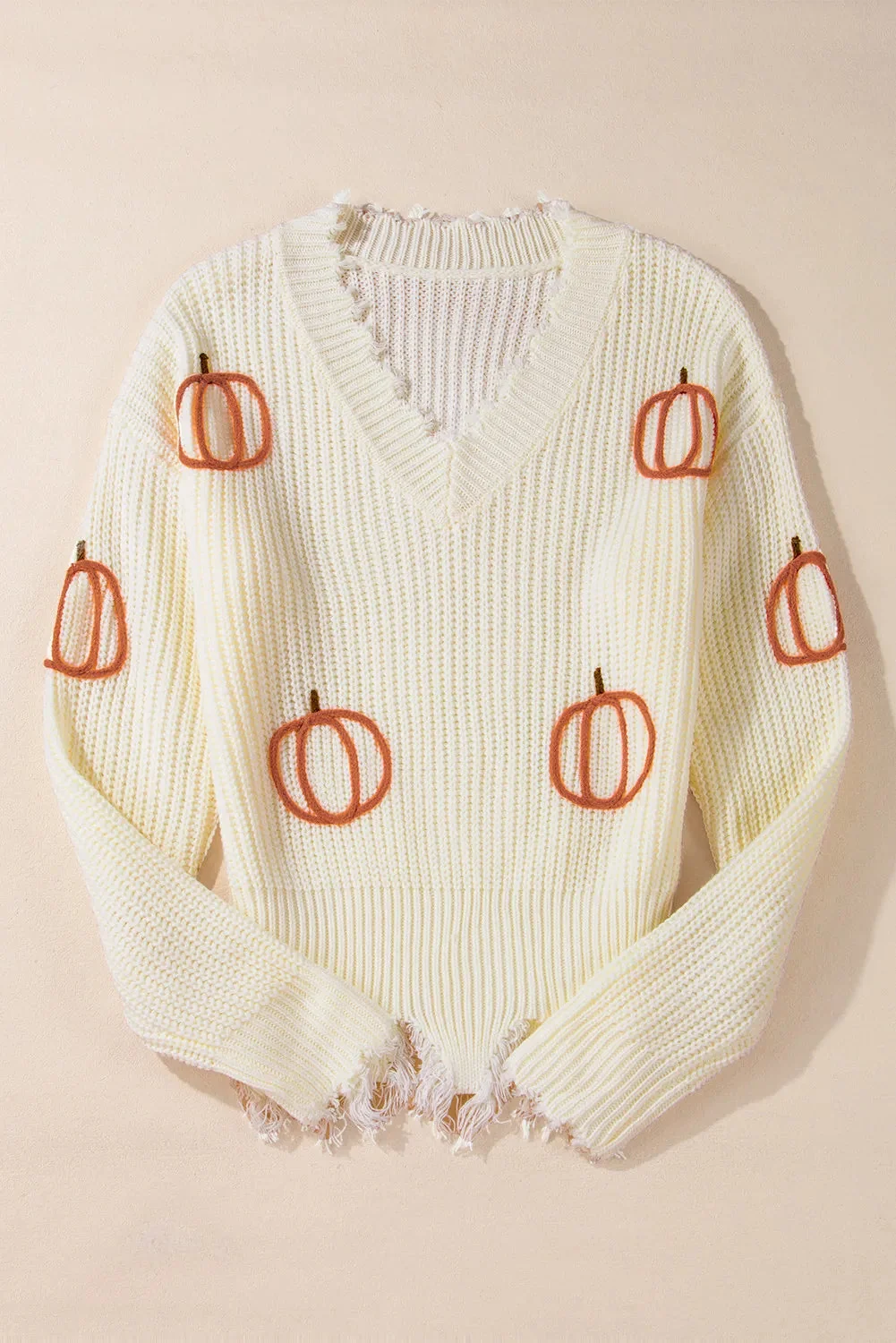 Stay cozy and stylish in our Beige V-Neck Long Sleeve Sweater with a unique raw hem finish. Made of 100% acrylic, this sweater offers a slightly stretchy fit for comfort. Machine wash cold and tumble dry low for easy care. Perfect for fall weather, this imported sweater comes in sizes S to XL. Treat yourself to the ultimate comfort and style!