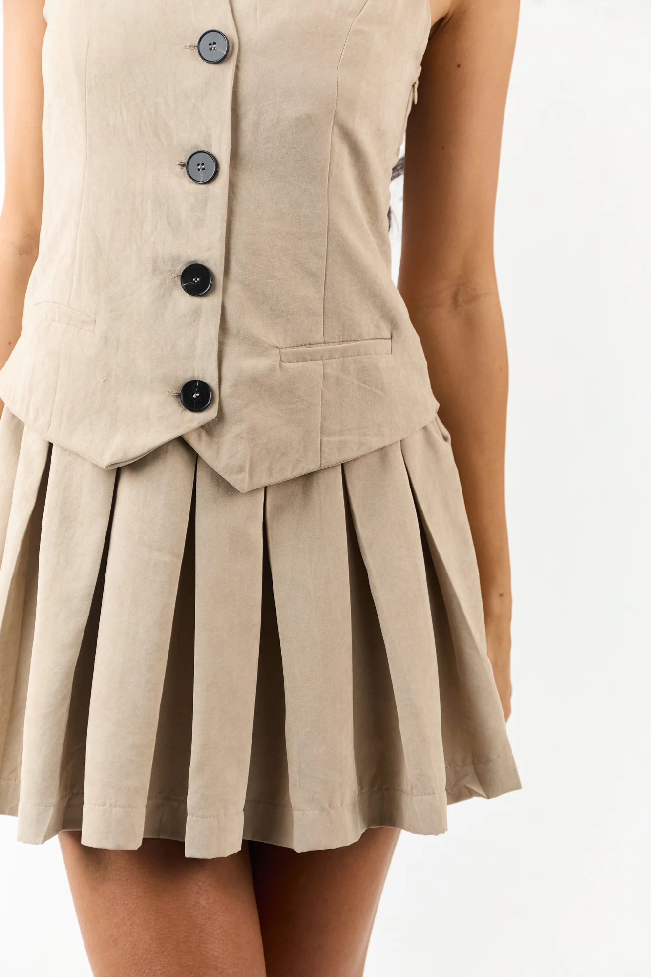 Upgrade your wardrobe with our Beige Vest Style Mini Dress featuring a button-down front, pleated skirt design, and a flattering fit. This dress is effortlessly stylish and comfortable, mimicking a two-piece set. Crafted from 97% Polyester and 3% Polyamide with a soft textured finish, it offers all-day ease. The hidden side zipper, faux front pockets, and back button strap detail add unique charm. Stay chic and trendy with this versatile dress. Size Chart: XS (Numeric Size 0/2), S (Numeric Size 4/6), M (Numeric Size 8/10), L (Numeric Size 12/14), XL (Numeric Size 16/18). Measurements: Bust – 31-32″ (XS) to 39-40″ (XL), Waist – 23-24″ (XS) to 31-32″ (XL). Length approximately 33″ for size SM. Lining: 100% Polyester. Imported. Model wears a size Small (Height 59″, Bust 34″, Waist 26″).
