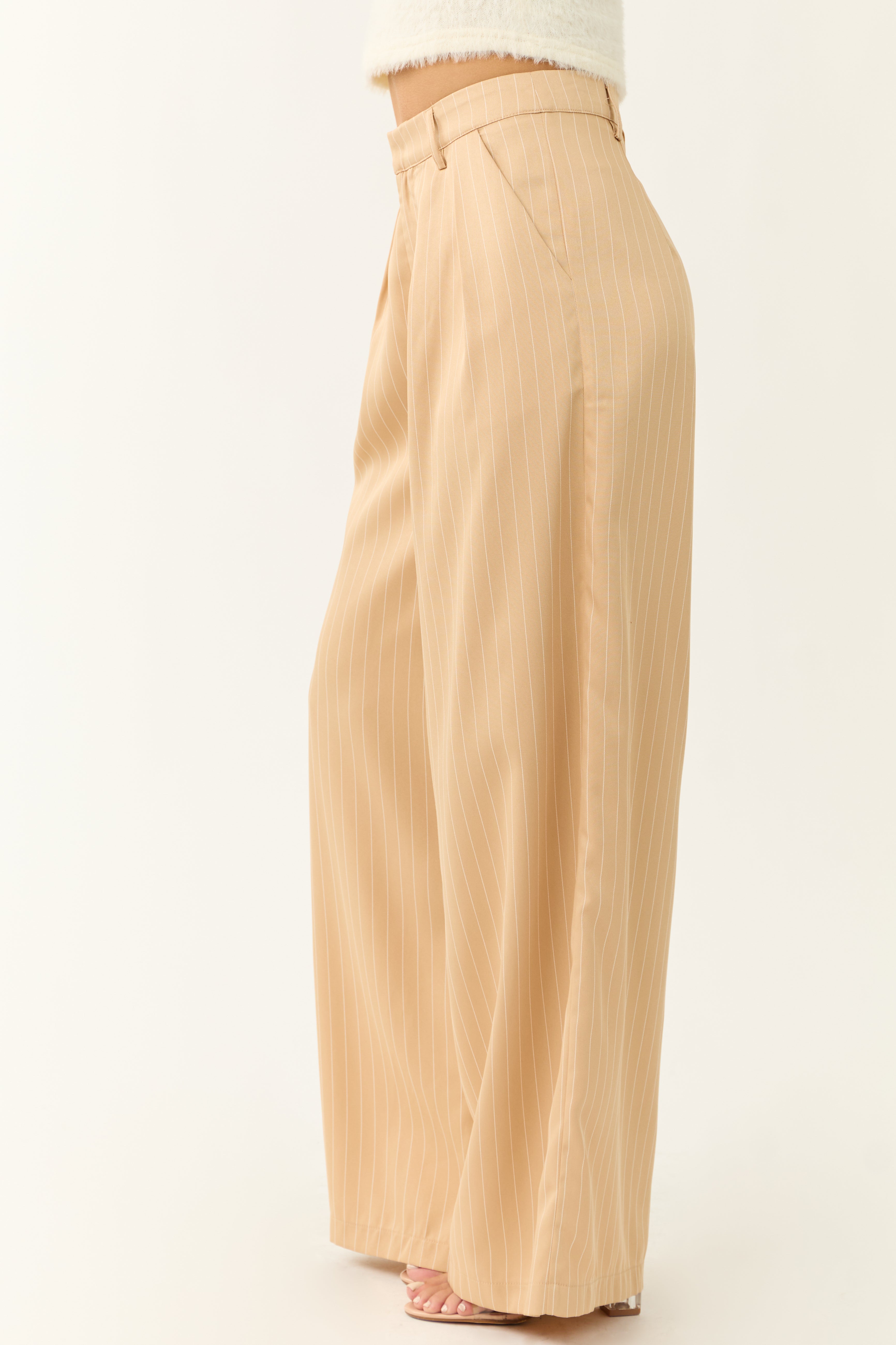 Achieve a sophisticated look with our Beige Wide Leg Formal Pants. Crafted from high-quality non-stretchy woven fabric in an elegant vertical pin stripe design. These pants feature a high-waisted fit with a zipper fly, hook closure, and belt loops. Designed with 2 side pockets, vertical pleats, and a front rise of 13 inches and back rise of 15 inches. Available in sizes S, M, and L with waist options of 28, 29, and 30 inches, and inseam lengths of 29.5, 30, and 30.5 inches. Perfect for various occasions, these pants add a touch of class to your wardrobe. Care instructions: Hand wash separately in cold water, avoid bleach, and lay flat to dry.