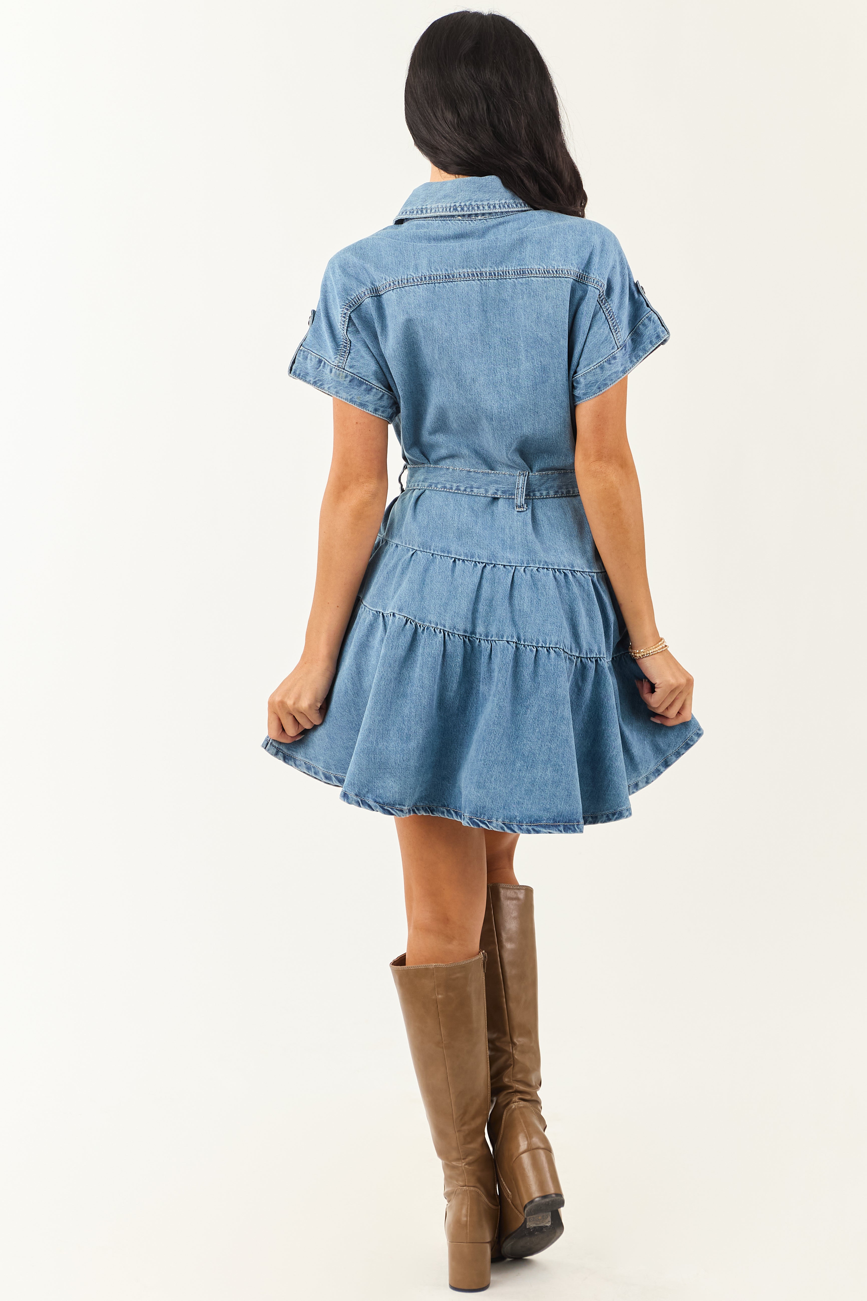 Step up your style game with this Belted Tiered Denim Mini Dress in Blue. Crafted from a blend of 50% Cotton and 50% Lyocell, this non-stretchy denim dress features an adjustable waist tie, decorative sleeve button tabs, and side slits for a chic look. Transition effortlessly from a shift fit to a cinched fit with the optional waist tie and stay comfortable all day long. This dress is a versatile addition to your wardrobe, suitable for a range of occasions. Enjoy the casual elegance of this tiered silhouette dress perfect for the fashion-forward woman.