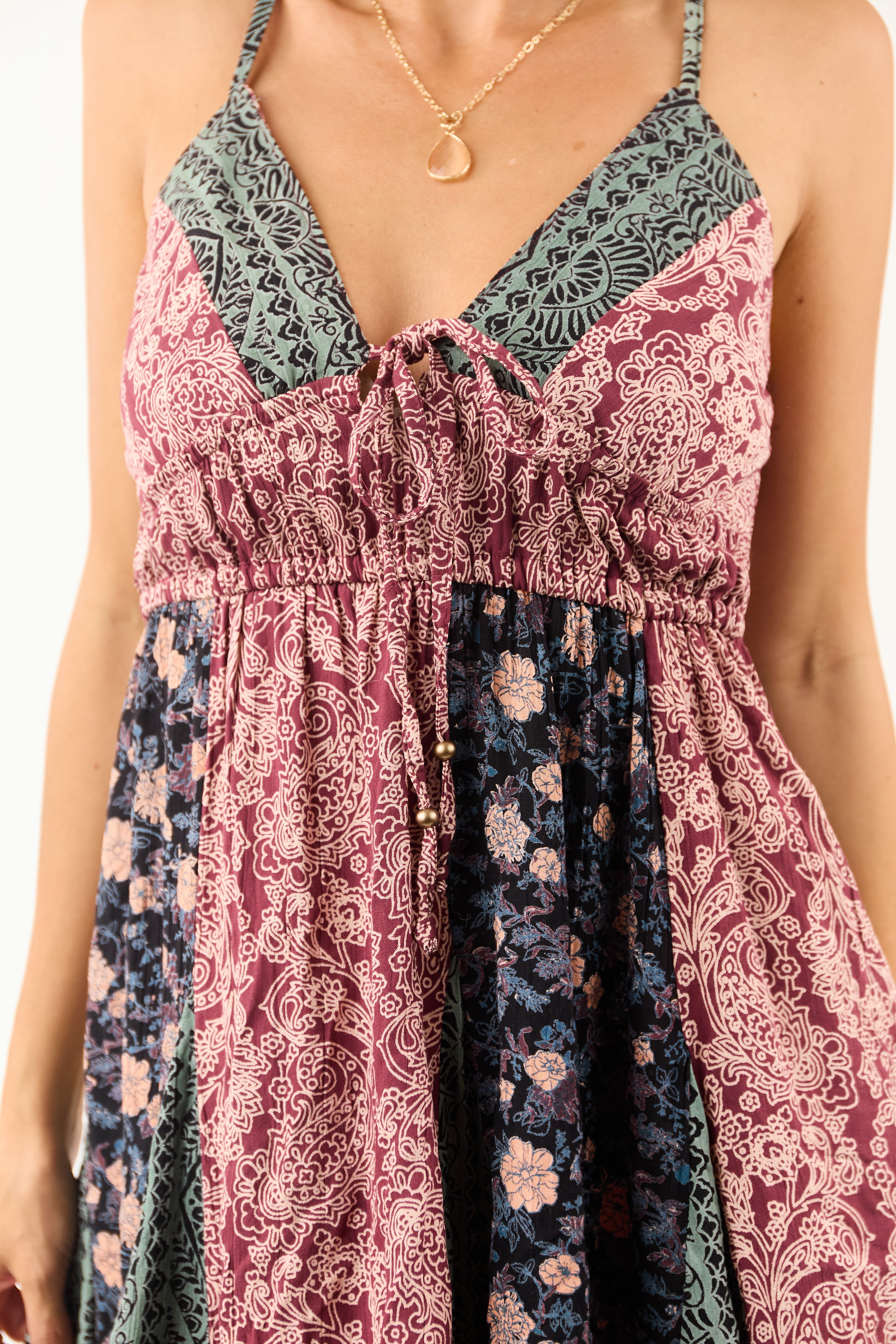 Dazzle in this flowy mini dress with a deep v neckline and vibrant multi-color print. Showcasing hues of Berry, Blush, Black, Juniper, Steel Blue, and Peach, this dress is sure to turn heads wherever you go. Perfectly tailored for comfort, the dress features a stretchy smocked back, adjustable spaghetti straps, and an elastic waistband. Make a statement in this chic and trendy piece that brings together style and charm effortlessly. Embrace the unique floral colorblock design that adds a touch of elegance to your wardrobe. Unlined and made of 100% Rayon for a soft and luxurious feel. Imported. Note: Each item is unique due to the cutting and sewing process, ensuring you a one-of-a-kind look. Models are wearing sizes S and L.