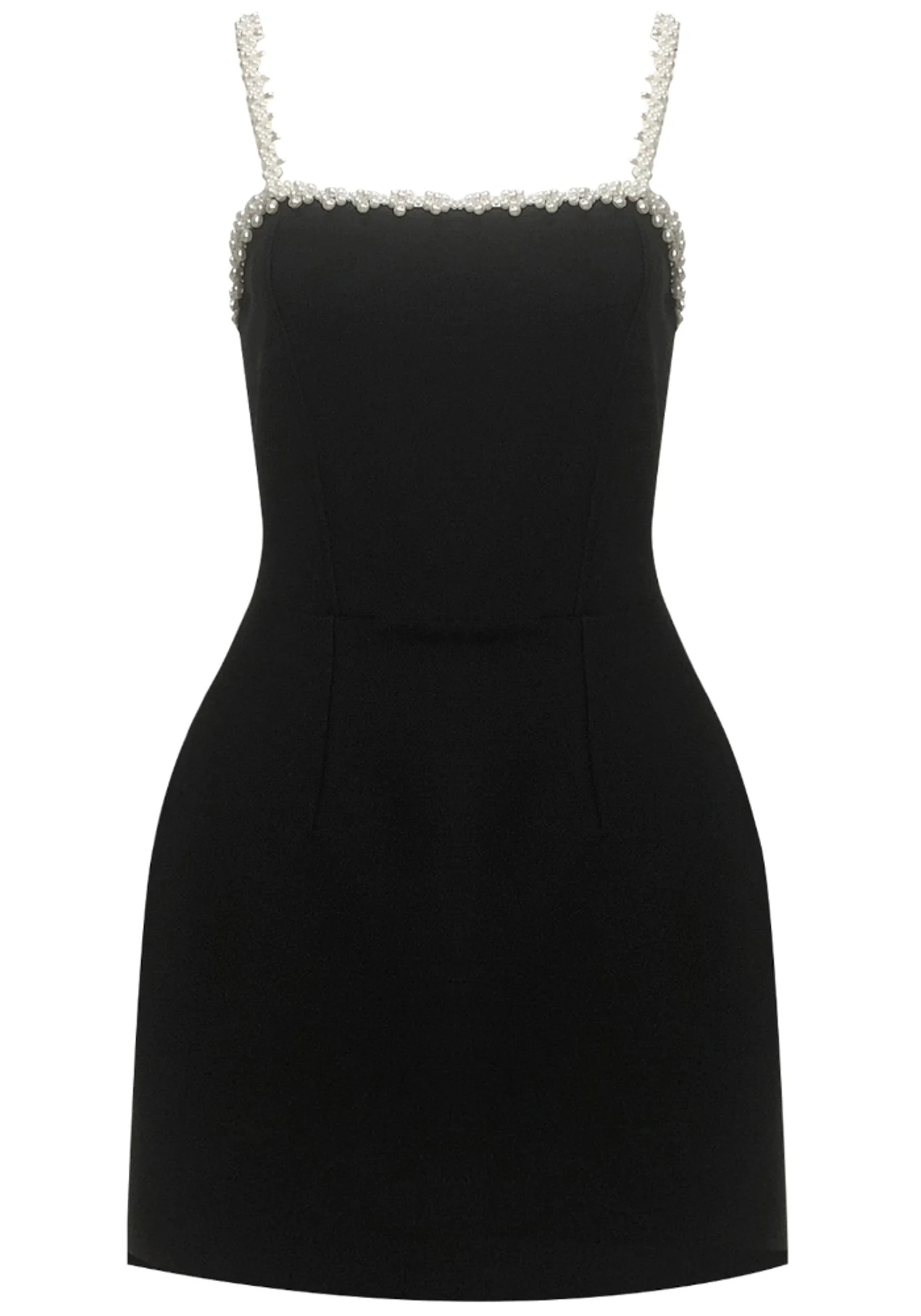 This stunning black A-line mini dress features a V-neck, sleeveless design with adjustable spaghetti straps and elegant pearl embellishments. Crafted from high-quality 90% Rayon, 9% Nylon, and 1% Spandex for anti-wrinkle, vibrant colors, and exceptional durability. The YKK zipper ensures reliable closure. Care instructions provided for lasting beauty. Add this versatile piece to your wardrobe for a chic look. Color may vary slightly in images.