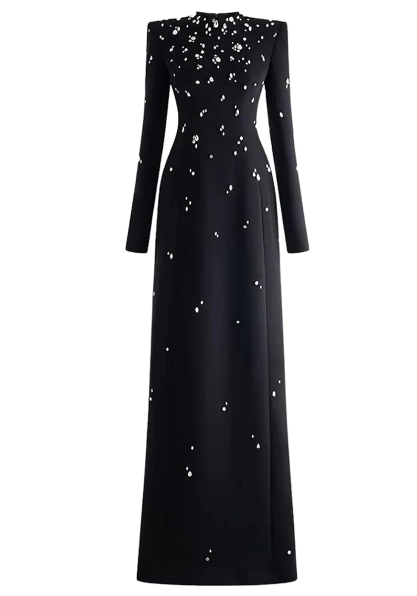 Indulge in elegance with our Black A-Line Maxi Dress. Crafted with long sleeves, O-neck design, and dazzling rhinestones. This dress features a concealed back zipper and is suitable for gentle dry cleaning only. The full-length design exudes sophistication, ensuring you stand out at any event. Please consult our size chart for accurate fitting guidance. Enhance your wardrobe with this timeless piece today!