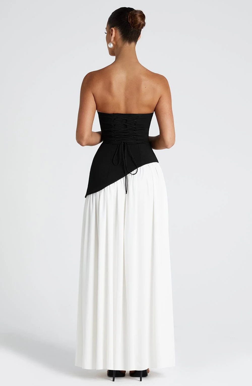 Elevate your evening look with the stunning Black and White Strapless Maxi Dress. This elegant dress in classic colors features a striking strapless bodice with an asymmetrical hem, perfect for a structured yet graceful fit. The flowing contrast georgette skirt drapes beautifully and is enhanced by a thigh-high split for added allure. Complete your outfit with the included chiffon scarf for a touch of sophistication. Crafted from non-stretch crepe, this dress is fully lined and features a lace-up back, princess seams, and an invisible zipper. Get ready to make a statement at any formal event with this glamorous maxi dress.