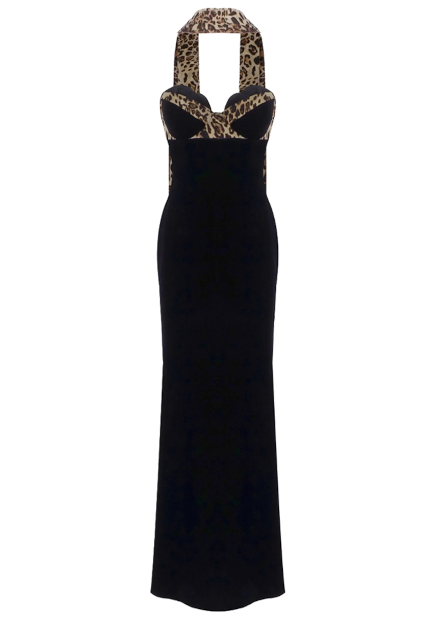 This stunning black velvet maxi dress features an elegant animal print design with a flattering strapless and sleeveless style. The bustier detail adds a touch of sophistication, while the scarf and YKK zipper enhance both style and practicality. Made from a blend of polyester, cotton, and velvet, this dress undergoes delicate sewing and hemming for lasting quality. Care instructions included. *Color may vary slightly due to lighting. Unleash your inner elegance with this timeless piece.