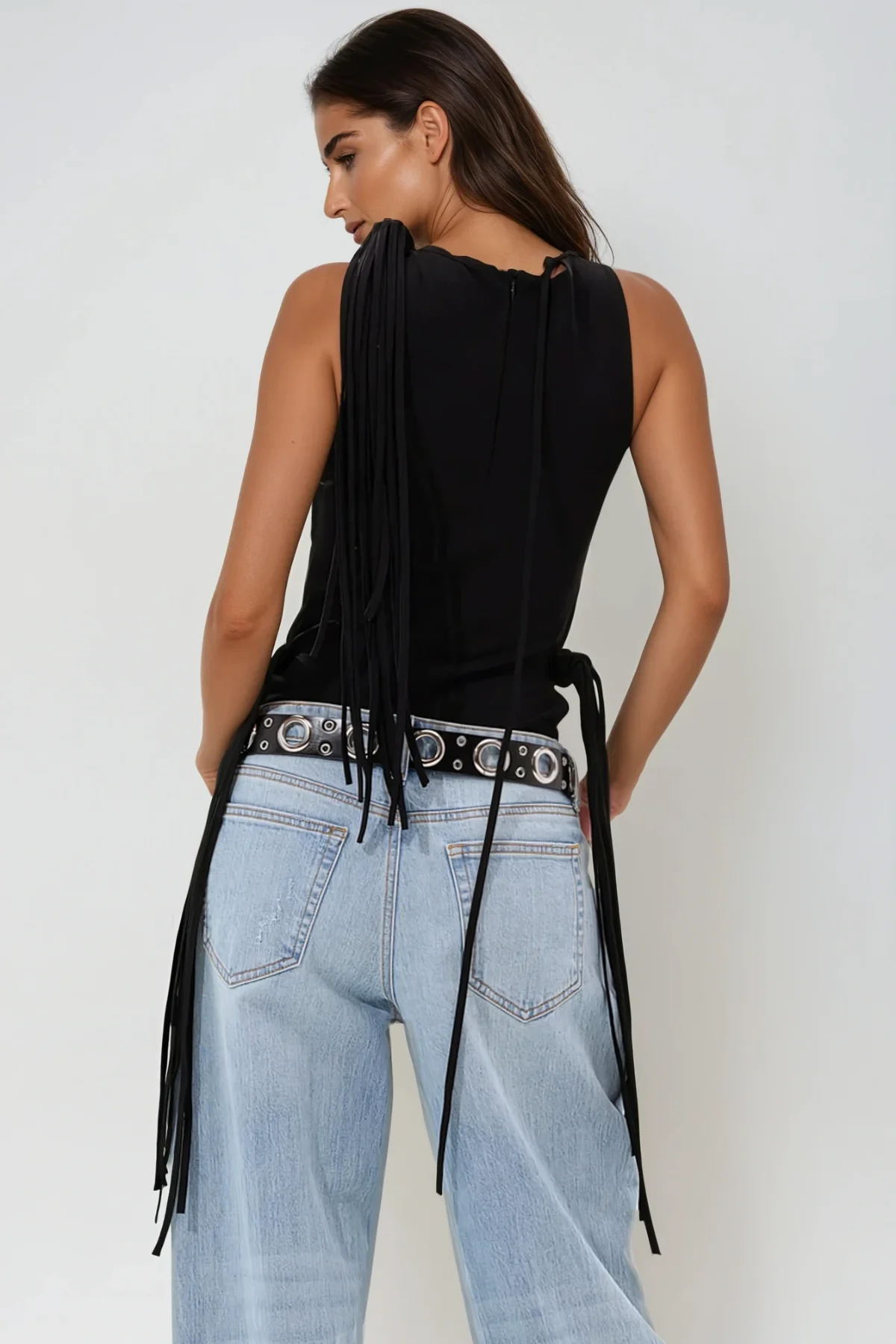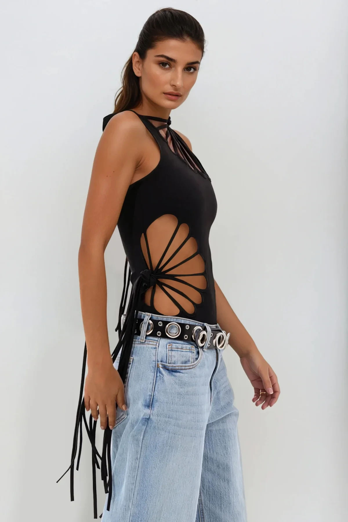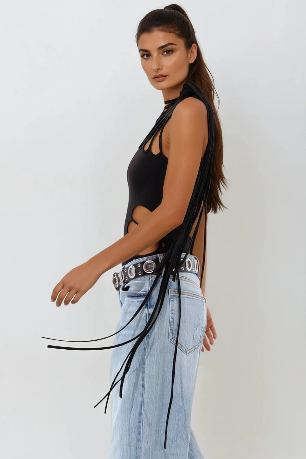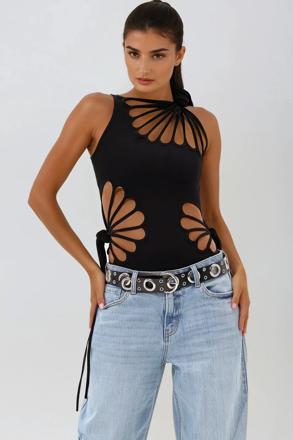 Indulge in the modern allure of the Black Asymmetric Cutout Bodysuit designed . With a daring asymmetric silhouette and striking cutouts that accentuate your figure, this bodysuit combines trendsetting style with a comfortable, figure-enhancing fit. Whether layered or worn solo, it blends geometric aesthetics with contours that highlight your natural beauty. Crafted for a snug yet flexible feel, it exudes confidence and fashion-forward flair. Stretch Factor: Slight Stretch. To maintain its richness, gently machine wash. Actual product color may vary due to image lighting.
