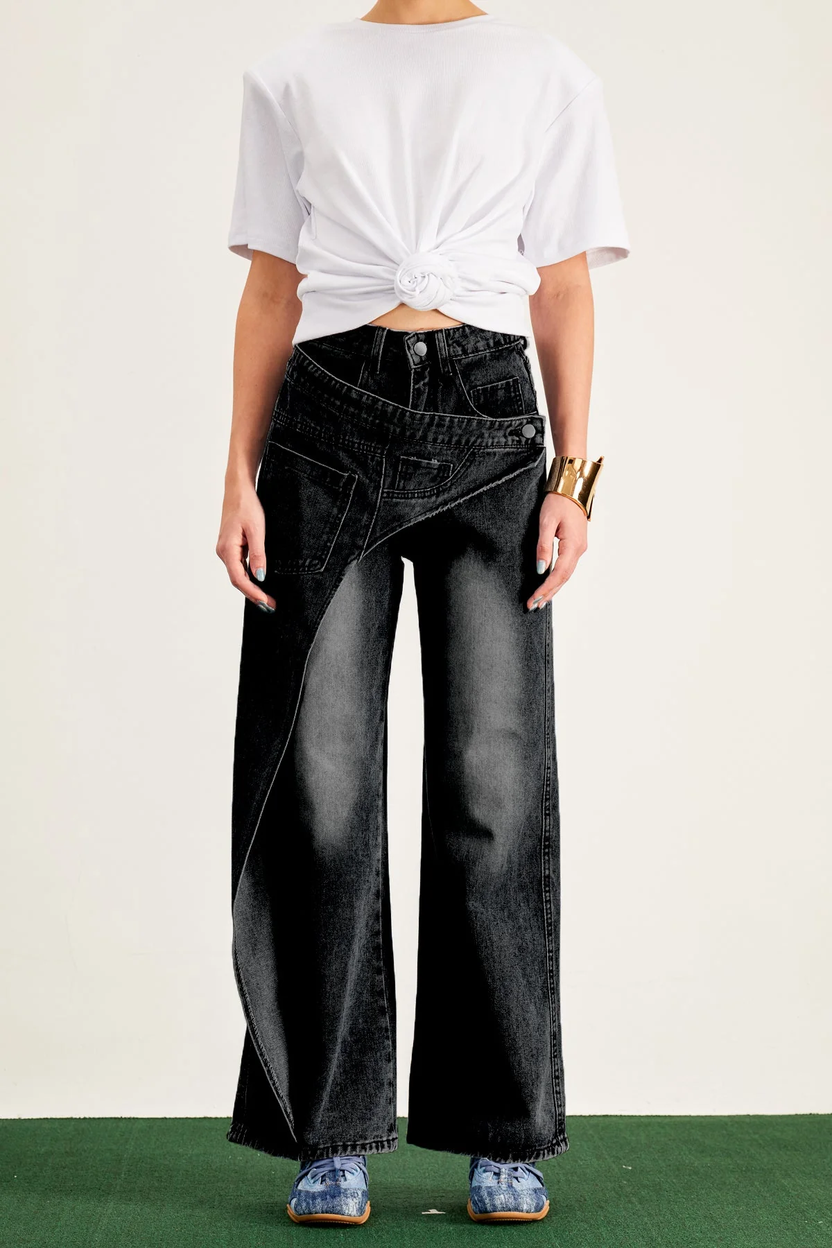 Introducing the Black Asymmetric Deconstructed Jeans – a must-have for the fashion-forward. Crafted with a unique design, these jeans offer a modern twist on a classic style. Made of high-quality materials for durability. Elevate your denim game! Material: 50% Polyester, 50% Cotton. Stretch Factor: Non-stretch. Care: Gentle machine wash. Please note, color may vary due to lighting. Discover the ultimate blend of style and durability with these versatile jeans.