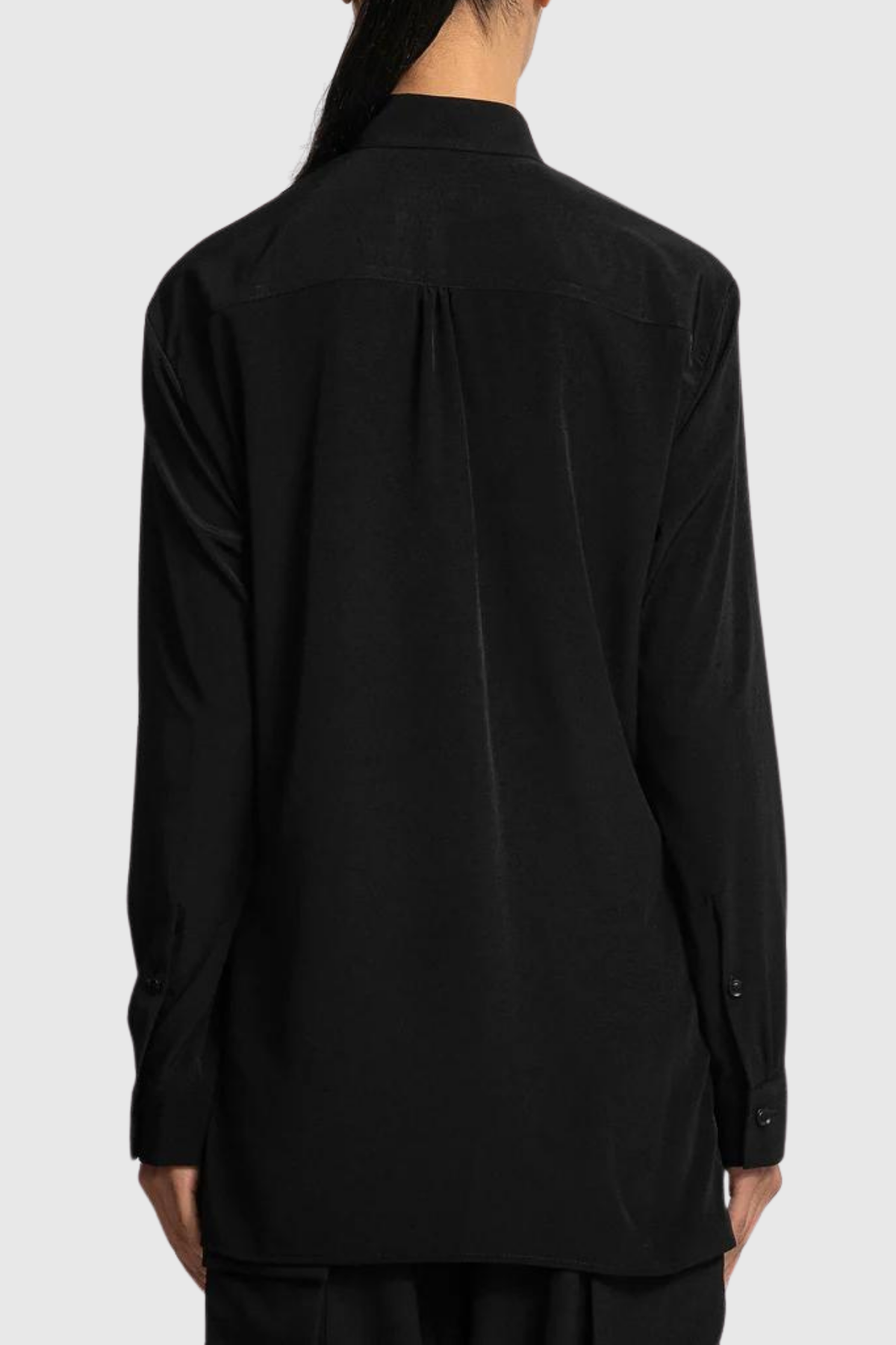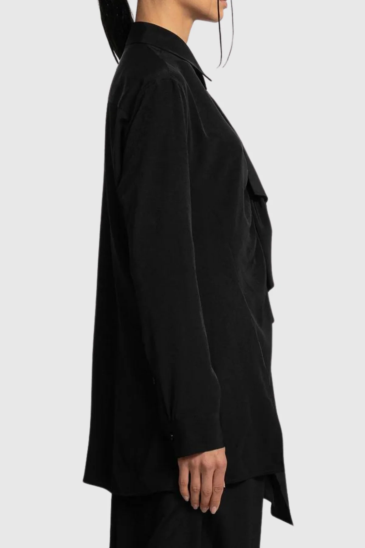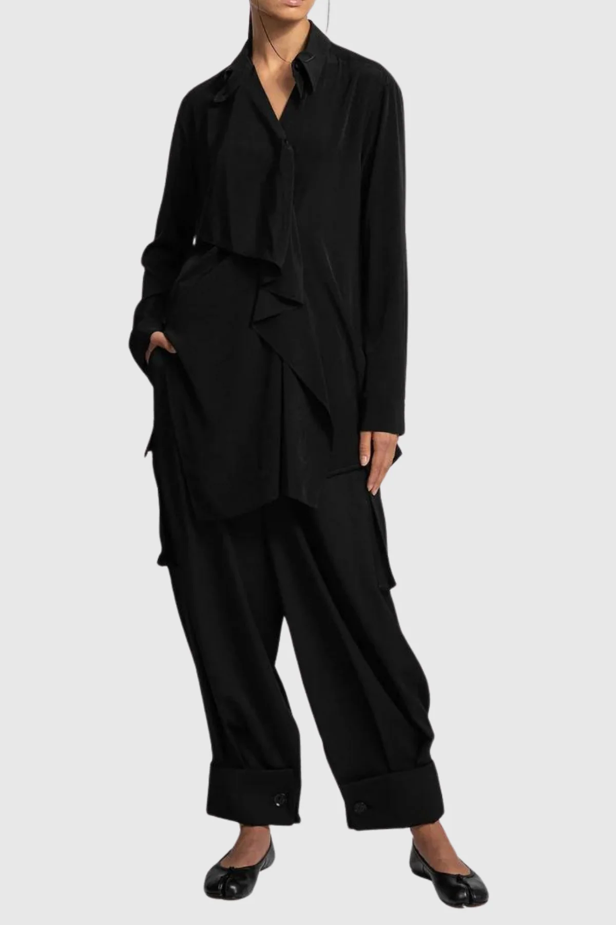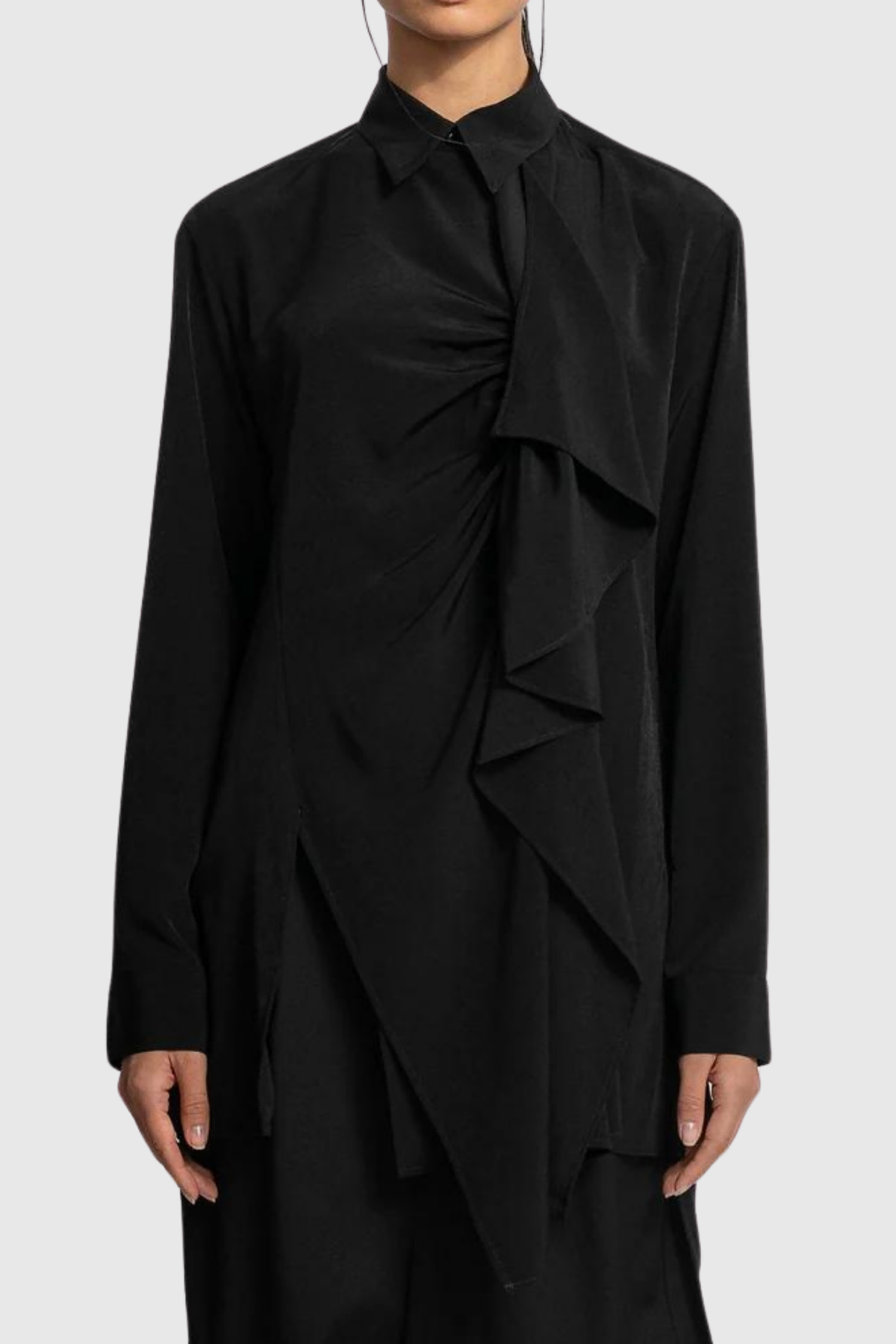 Elevate your style with this black asymmetric ruffle shirt . The dramatic design adds a unique touch to your outfit, crafted from high-quality 100% polyester for comfort. Perfect for making a fashion statement on any occasion. This shirt is a must-have for those seeking elegance with a touch of drama. Color may vary in different lighting conditions.