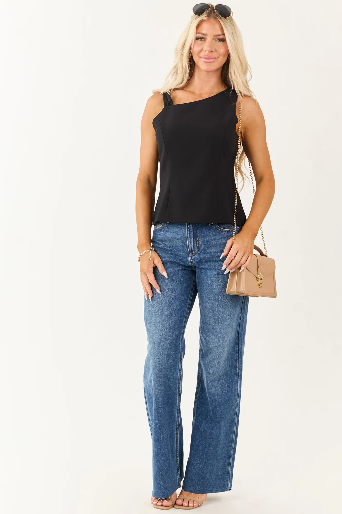 This sleek and classy black tank top features a flattering asymmetrical neckline with gold ring twist strap detail. Perfect for any occasion, this top pairs effortlessly with Black Faux Pocket Front Overlay Mini Skort. Crafted from 75% Polyester, 20% Rayon, and 5% Spandex, lined with 90% Polyester and 10% Spandex for ultimate comfort. The back zipper with hook and eye closure adds a touch of sophistication. Get this imported piece now and elevate your wardrobe!