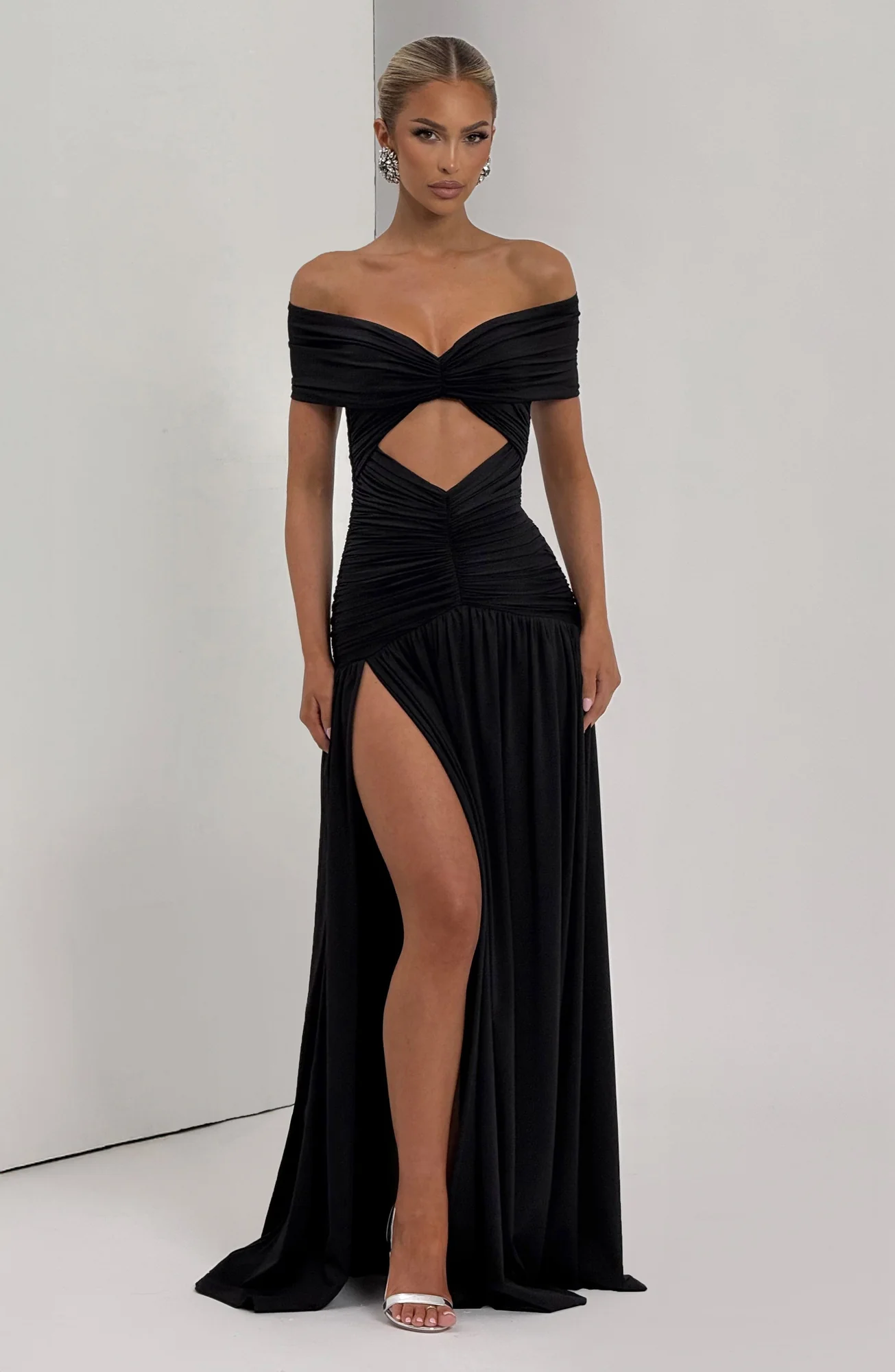 Black Bardot Neckline Maxi Dress with Thigh-High Split