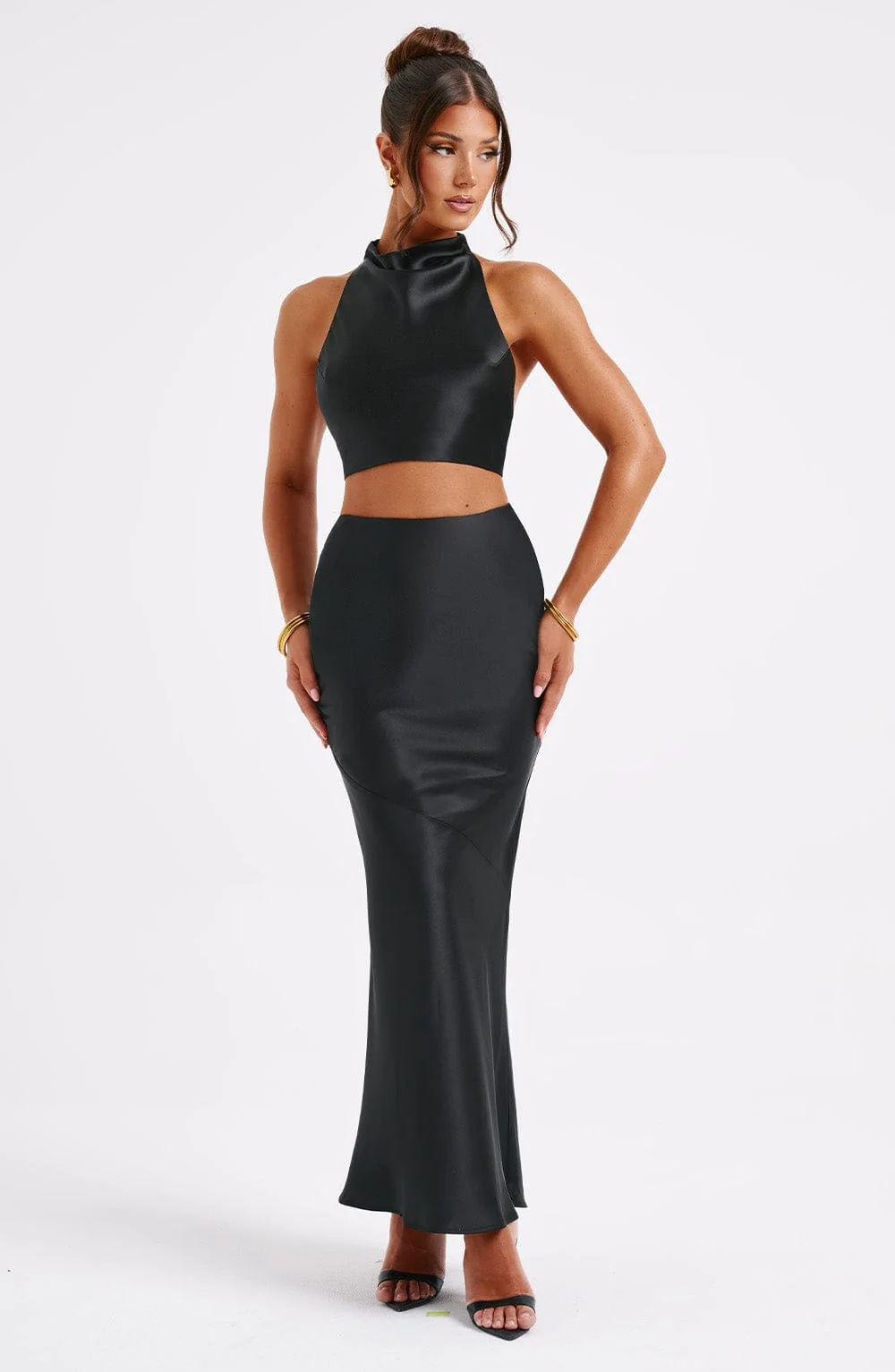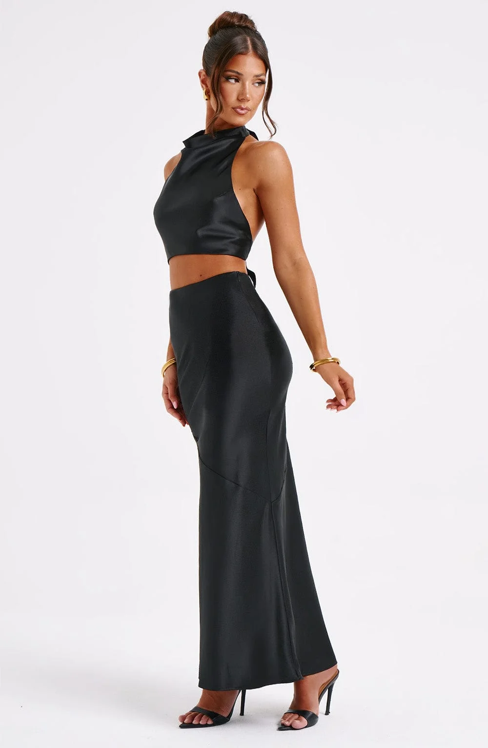 Indulge in the elegant fluid drape of our Black Bias Cut Satin Maxi Skirt for Women. Designed with a high waist for a flattering fit, this premium satin skirt flows effortlessly, hugging your figure with grace. This versatile piece is a must-have for any wardrobe, ideal for formal events and everyday glamour alike. The model is wearing size XS. Available in multiple sizes: XS, S, M, L, XL, XXL.