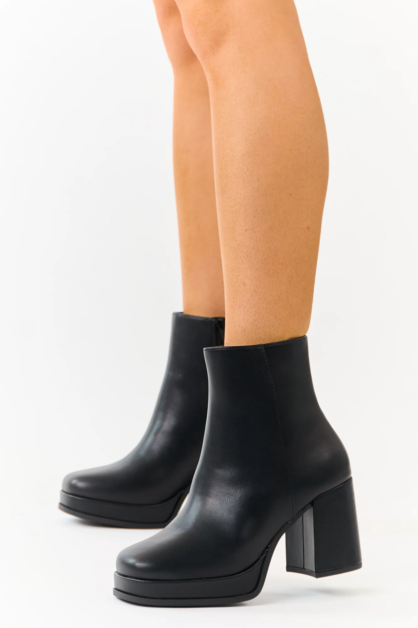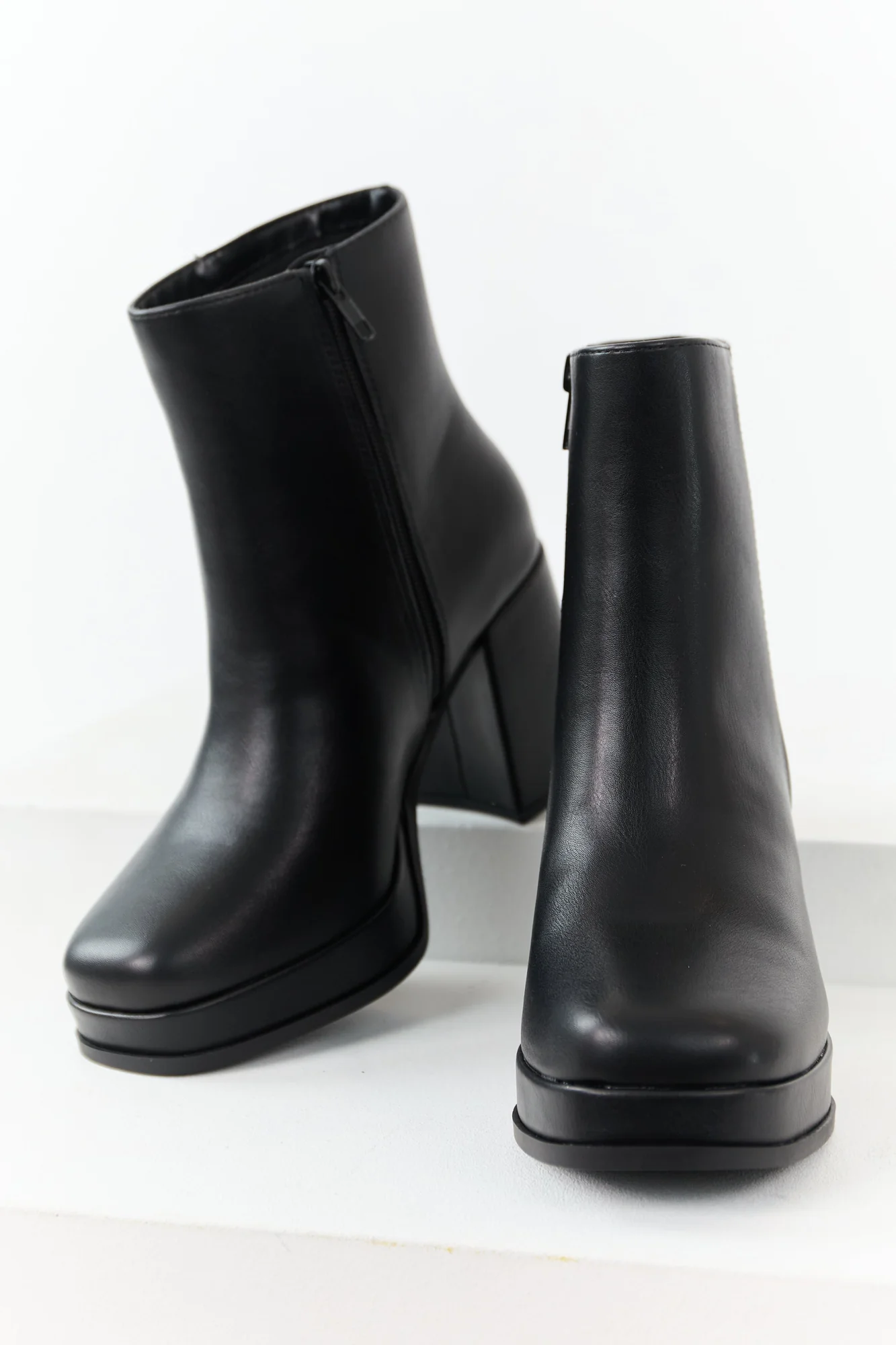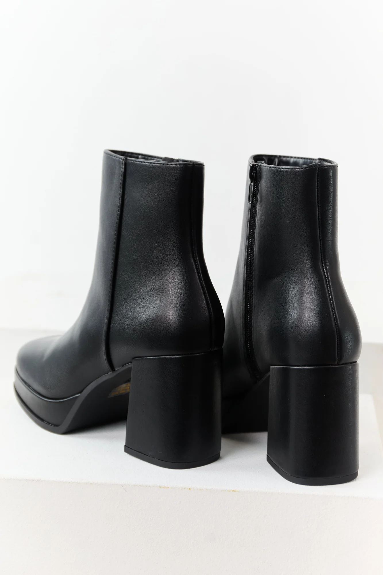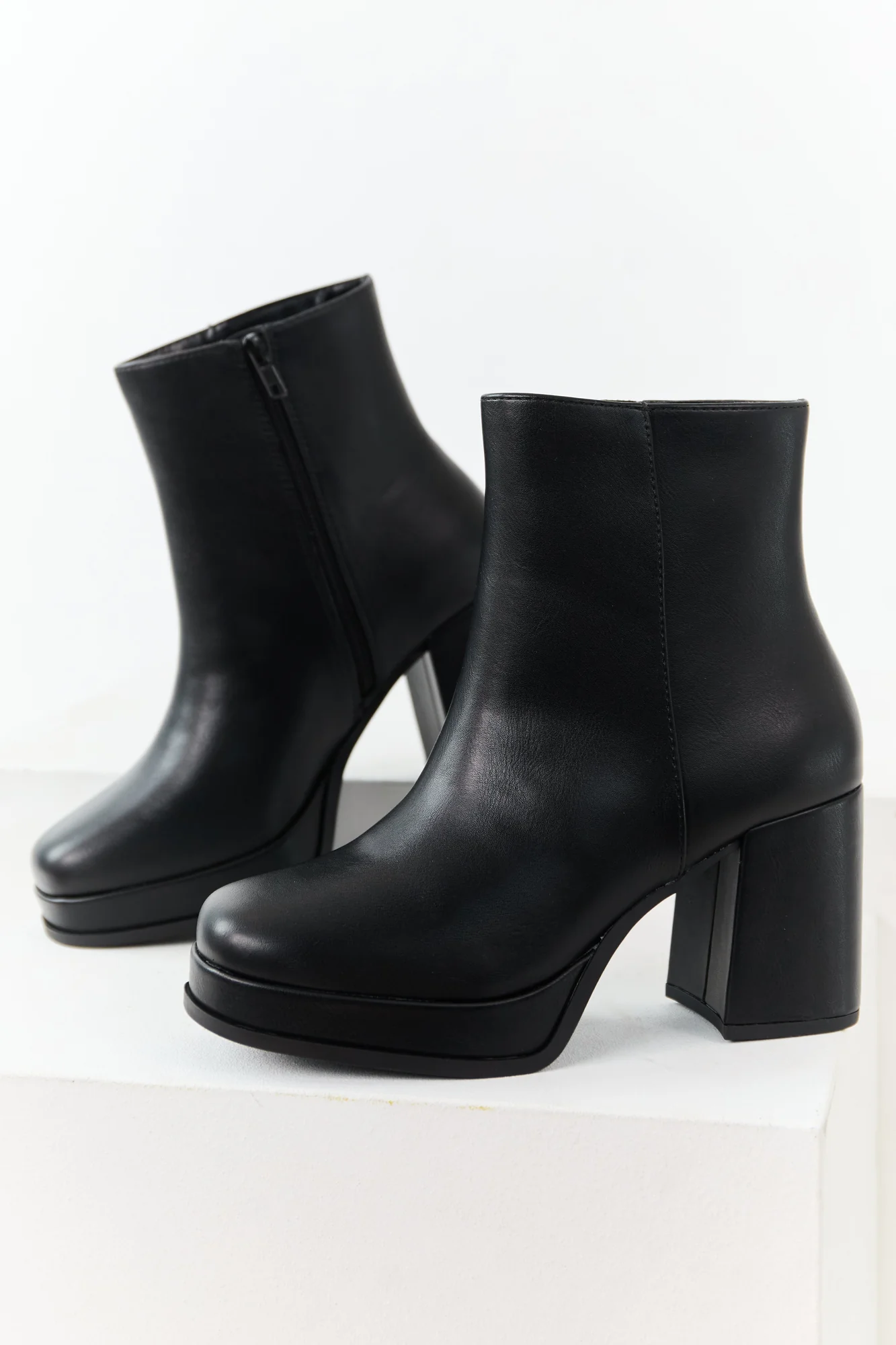Step out in style with these elegant black faux leather block heel round toe booties. Crafted from non-stretchy material, these boots feature a side zipper for easy wear. The Shaft measures 7 inches with a circumference of 11 inches, while the heels stand at 3.5 inches with a 1-inch platform for added comfort. Elevate your shoe collection with this imported product, perfect for any occasion and outfit, available in different sizes.