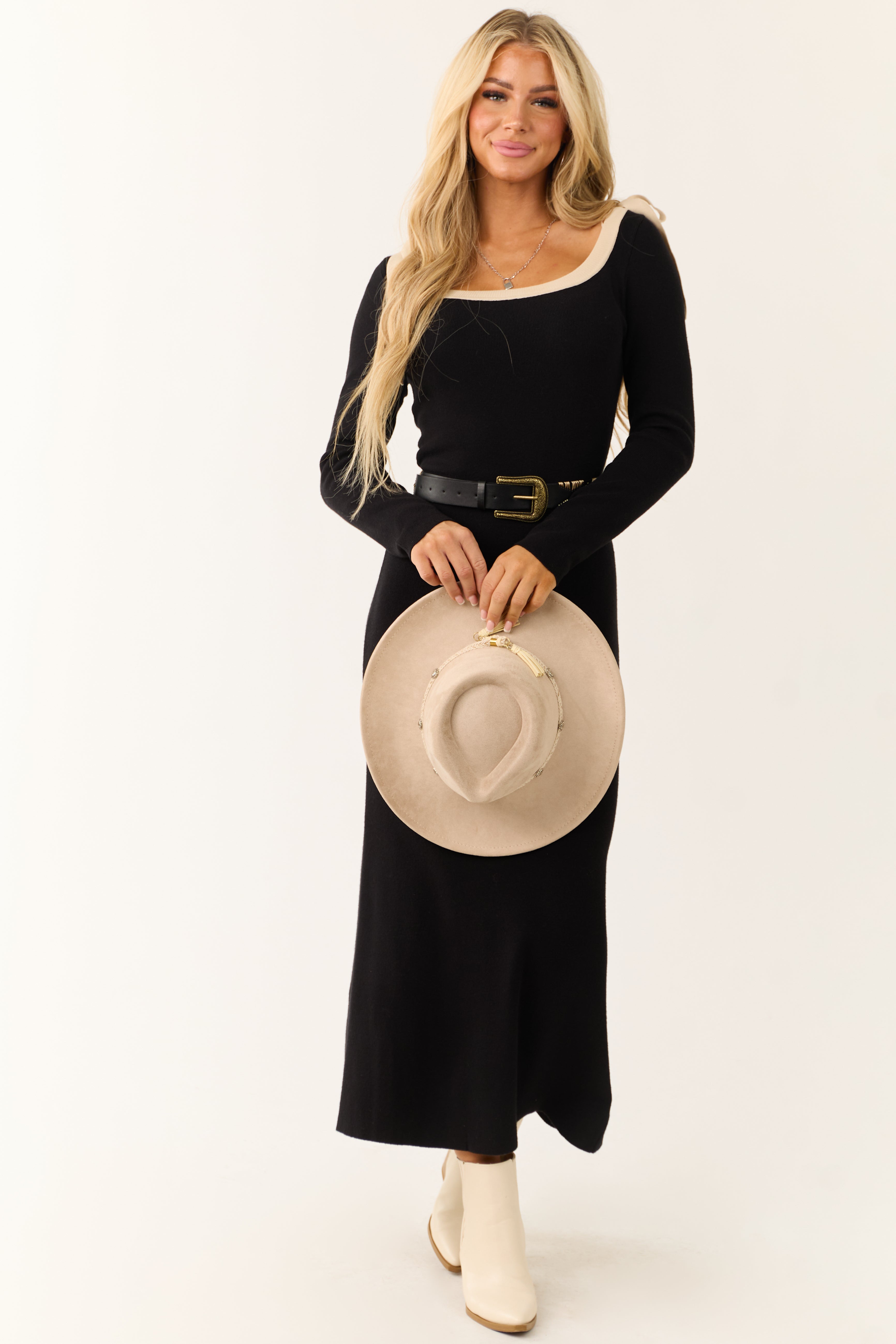 Indulge in elegance with this black maxi dress featuring exquisite bow shoulder details and a chic almond contrast neckline. This bodycon fit dress offers super stretchy comfort in a knit blend of 50% Viscose, 28% Polyester, and 22% Nylon. Perfect for date nights, it boasts a scoop neckline, long sleeves, and an unlined finish for a sophisticated look. Belt not included. Available in sizes S, M, and L. Care instructions: Hand wash cold, hang dry, iron low if necessary. Model size: Small.