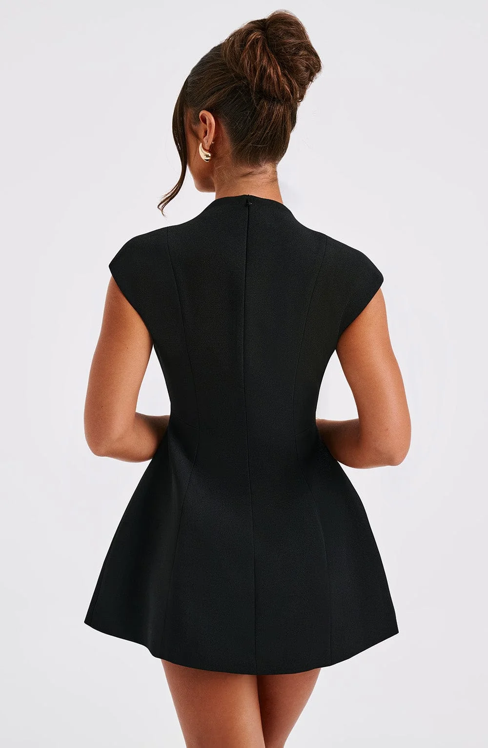 Elevate your style with the chic Black Bubble Hem Mini Dress. This seasons must-have features cap sleeves, a deep plunge neckline, and front pockets. Crafted from premium non-stretch crepe, it hugs your figure and flares into a bubble shape skirt. Whether for date nights or special occasions, this dress is a timeless wardrobe essential. Available in sizes XS to XXL.
