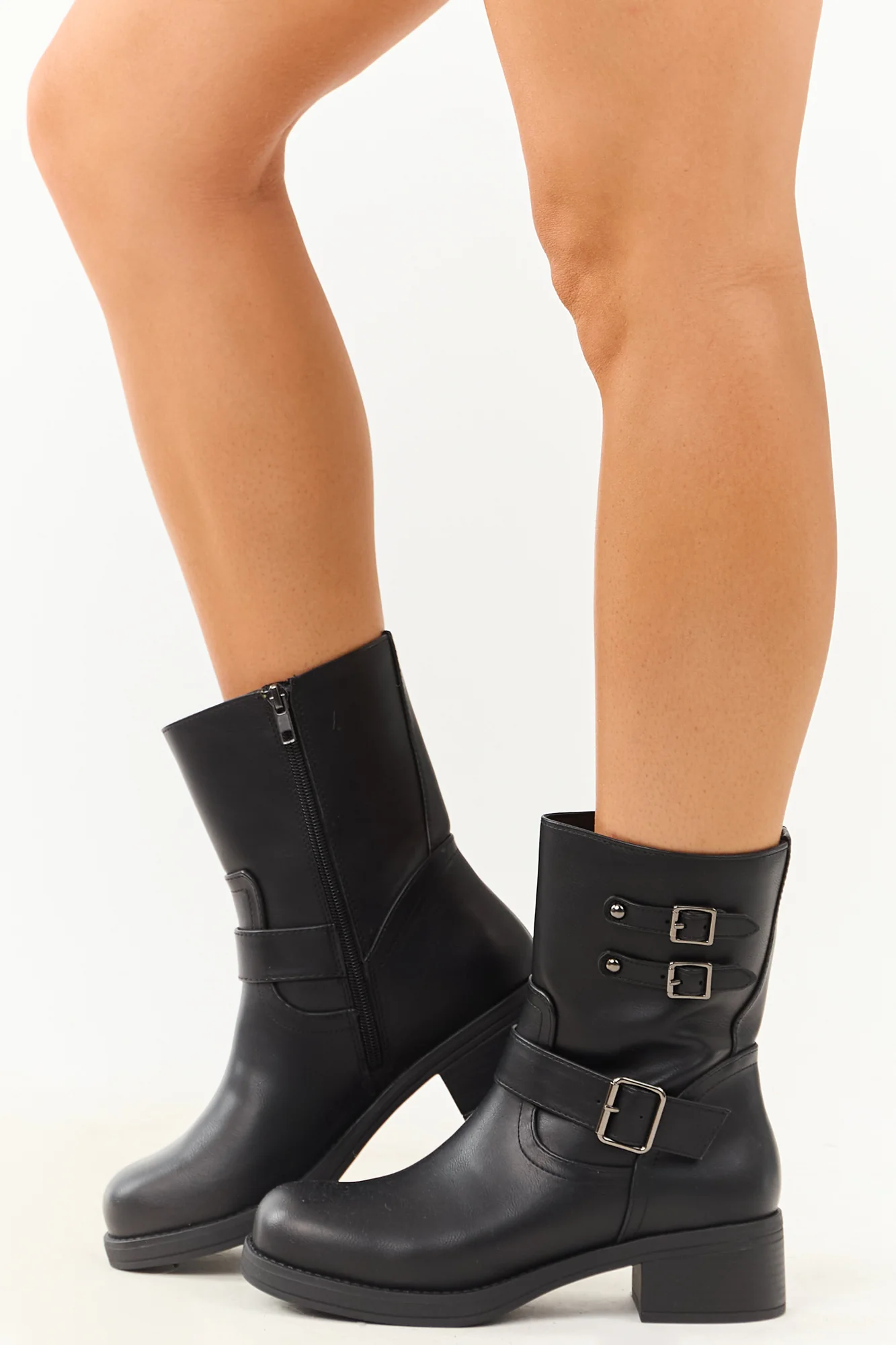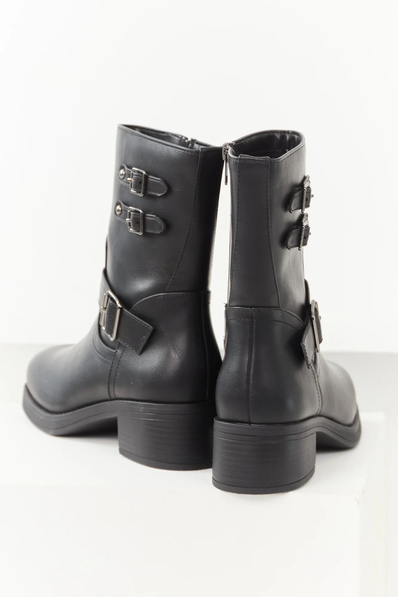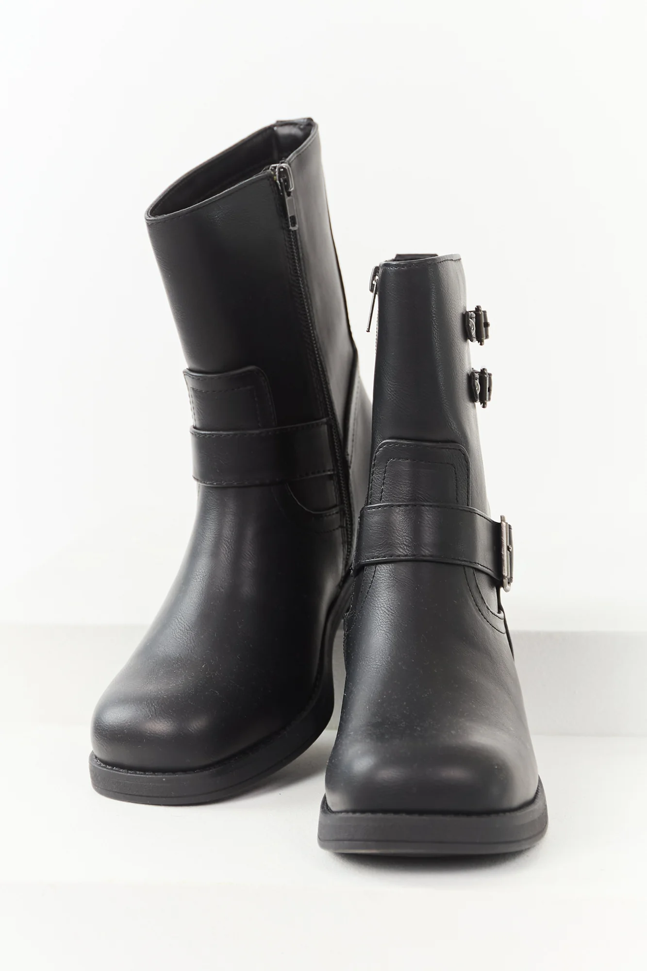 Step up your style with these Black Block Heel Boots! Crafted from non-stretchy faux leather, featuring buckle detail, side zipper, square toe, and a comfortable 2″ heel with a 0.5″ platform. Imported with a 9″ shaft and a 13″ circumference. Elevate your look this season! Available in sizes 7 to 11. Product measured on size 8 for reference.