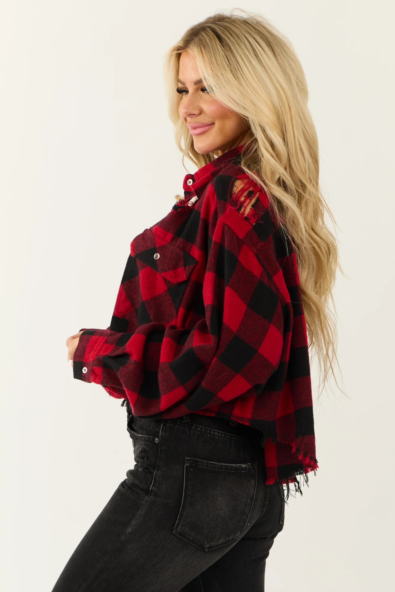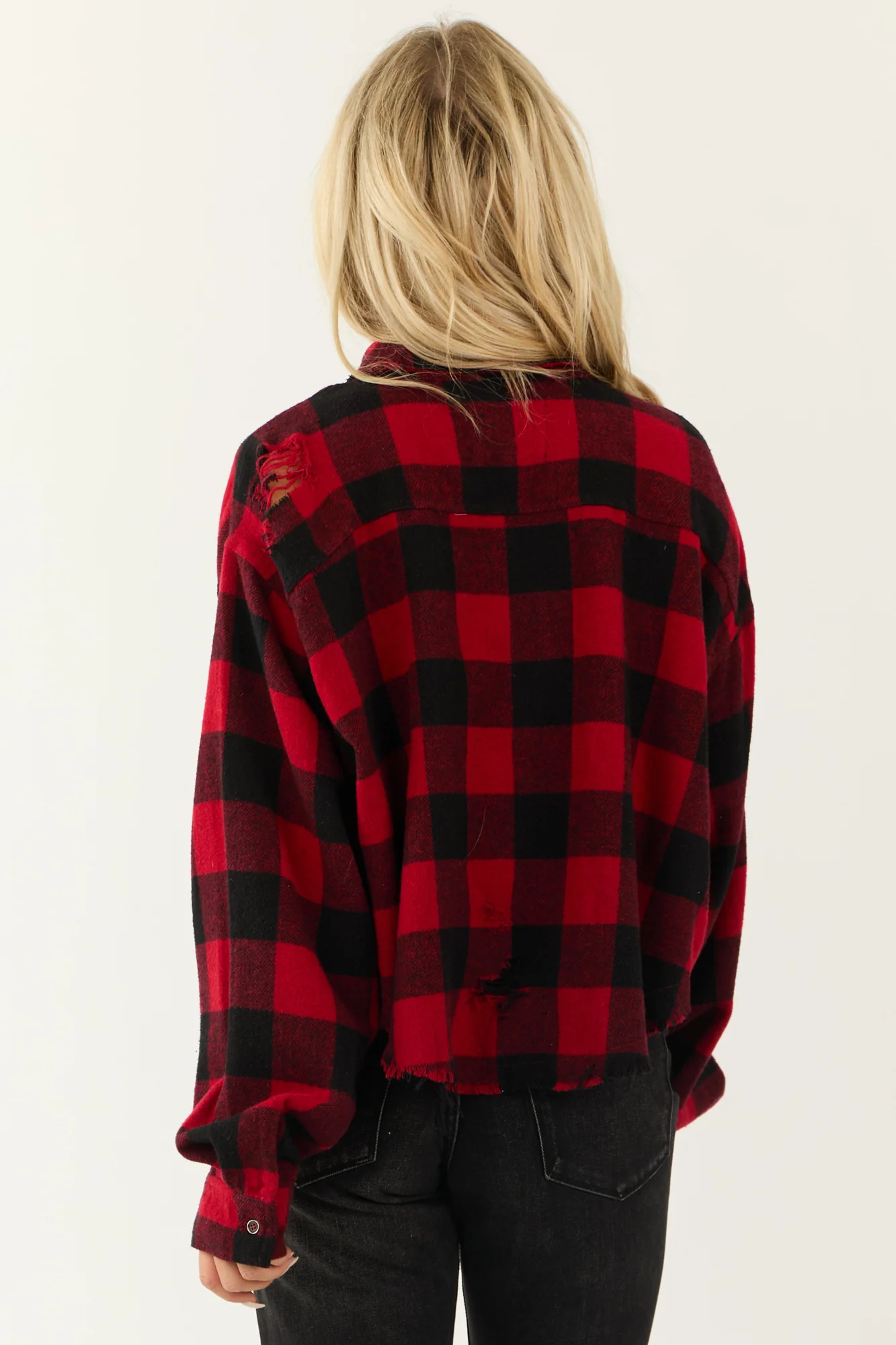 This stylish Black Buffalo Plaid Distressed Shirt comes in sizes S, M, and L, featuring a wide fit, non-stretchy woven fabric, collared neckline, and semi-cropped length. It showcases distressed details, a button-down front, banded button cuffs, buttoned chest pockets, and a distressed high-low round hemline. With drop shoulders and long wide sleeves, this trendy shirt is unlined and made of 100% Polyester. Hand wash cold, line dry. Perfect for casual or daytime wear.