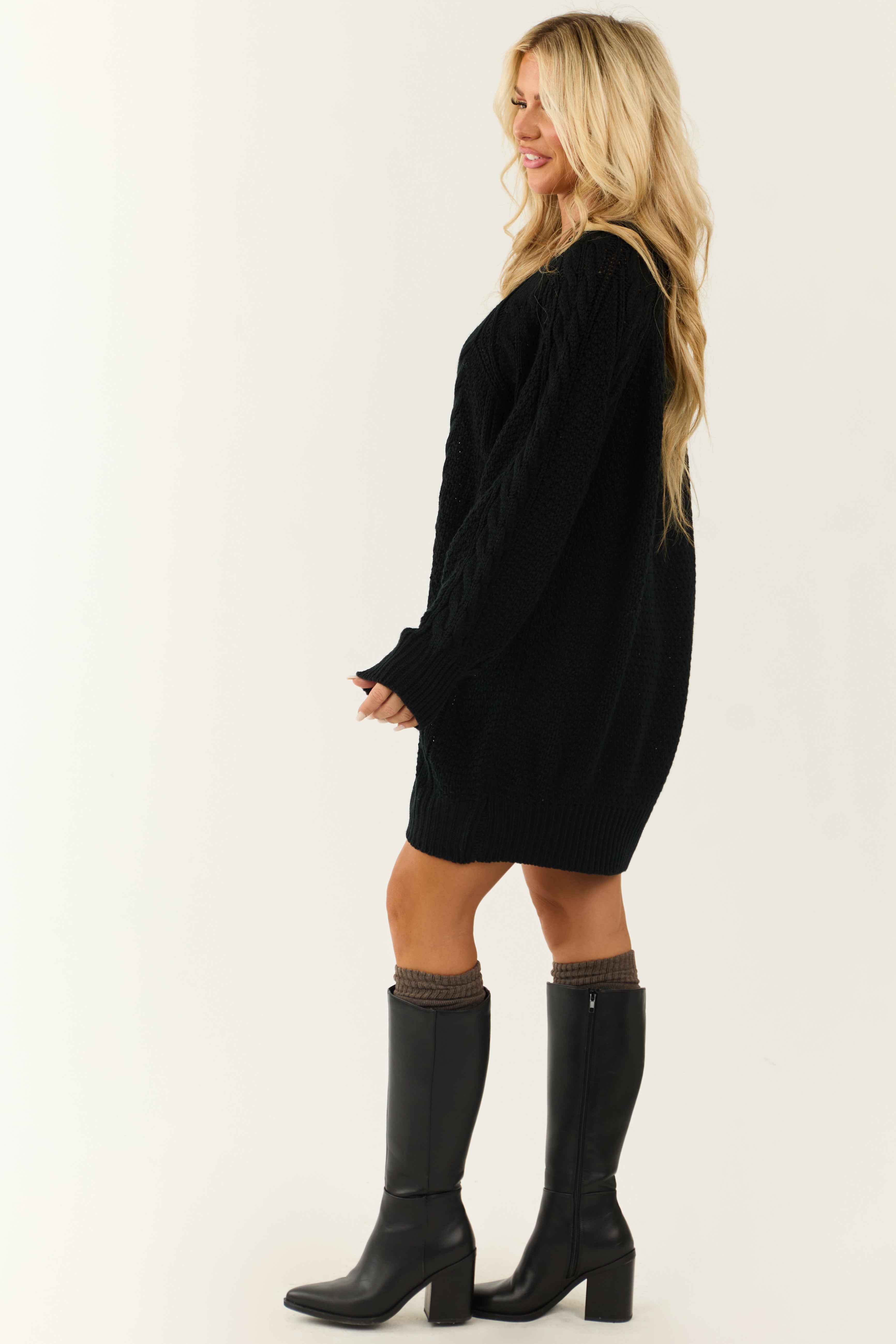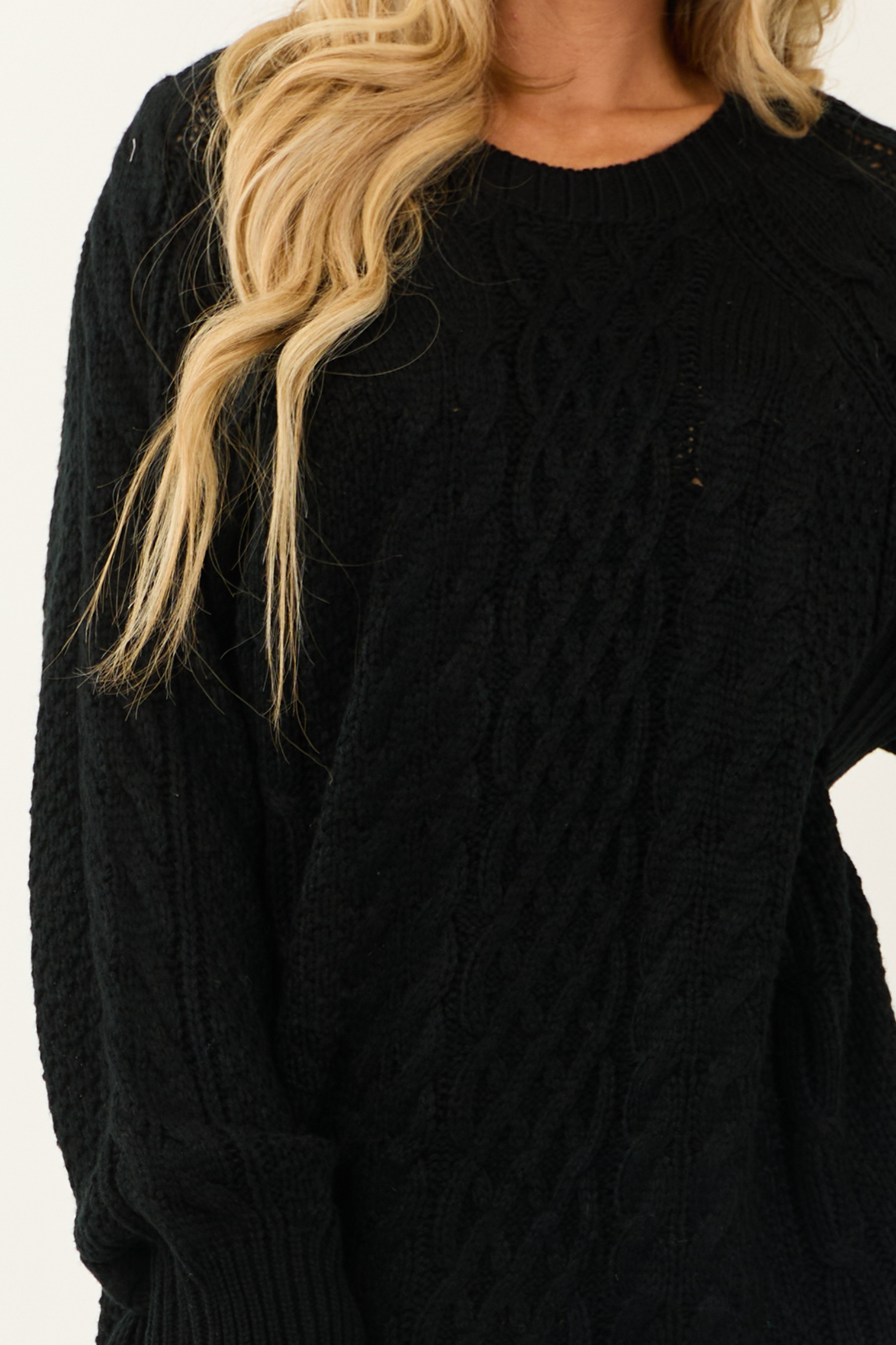 This black sweater dress features a shift fit with stretchy cable knit fabric for comfort. The raglan sleeves and banded cuffs add stylish details. Made of 100% Acrylic, this dress comes in sizes S, M, and L, fitting large and measuring 22-23in sleeve length, 52-54in bust, and 24-28in length. Ideal for daytime or date night, it pairs well with various accessories. Note: Dry clean only to avoid color bleeding. Model #1 is Size 1, 57, wearing a Small. Model #2 is Size 1, 58, wearing a Small.