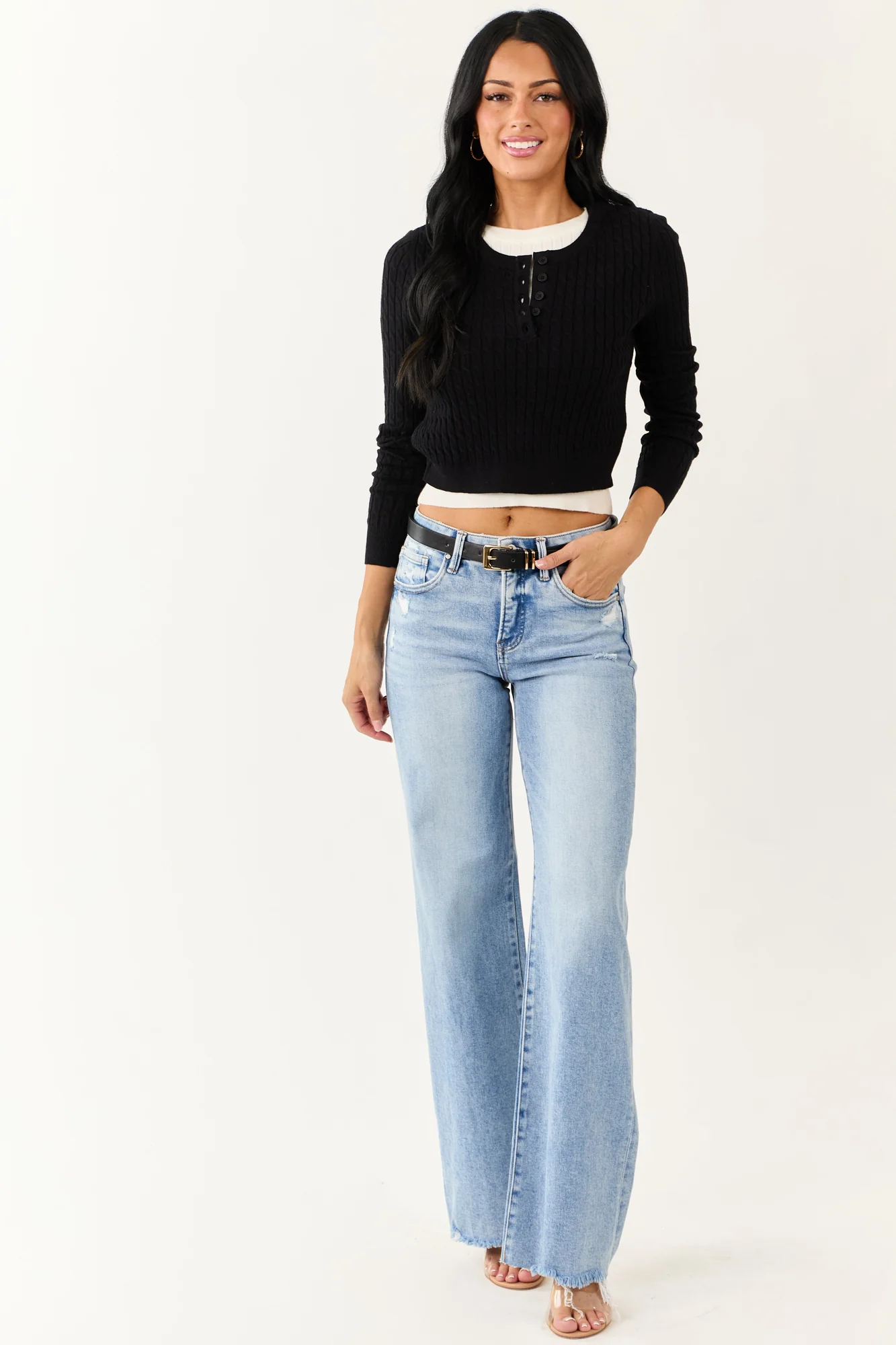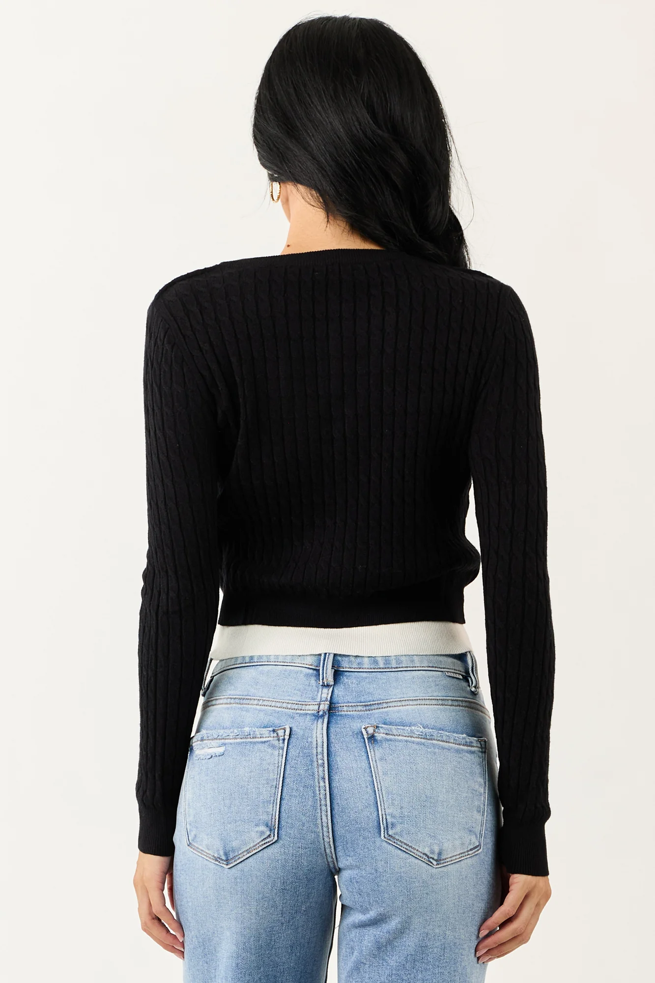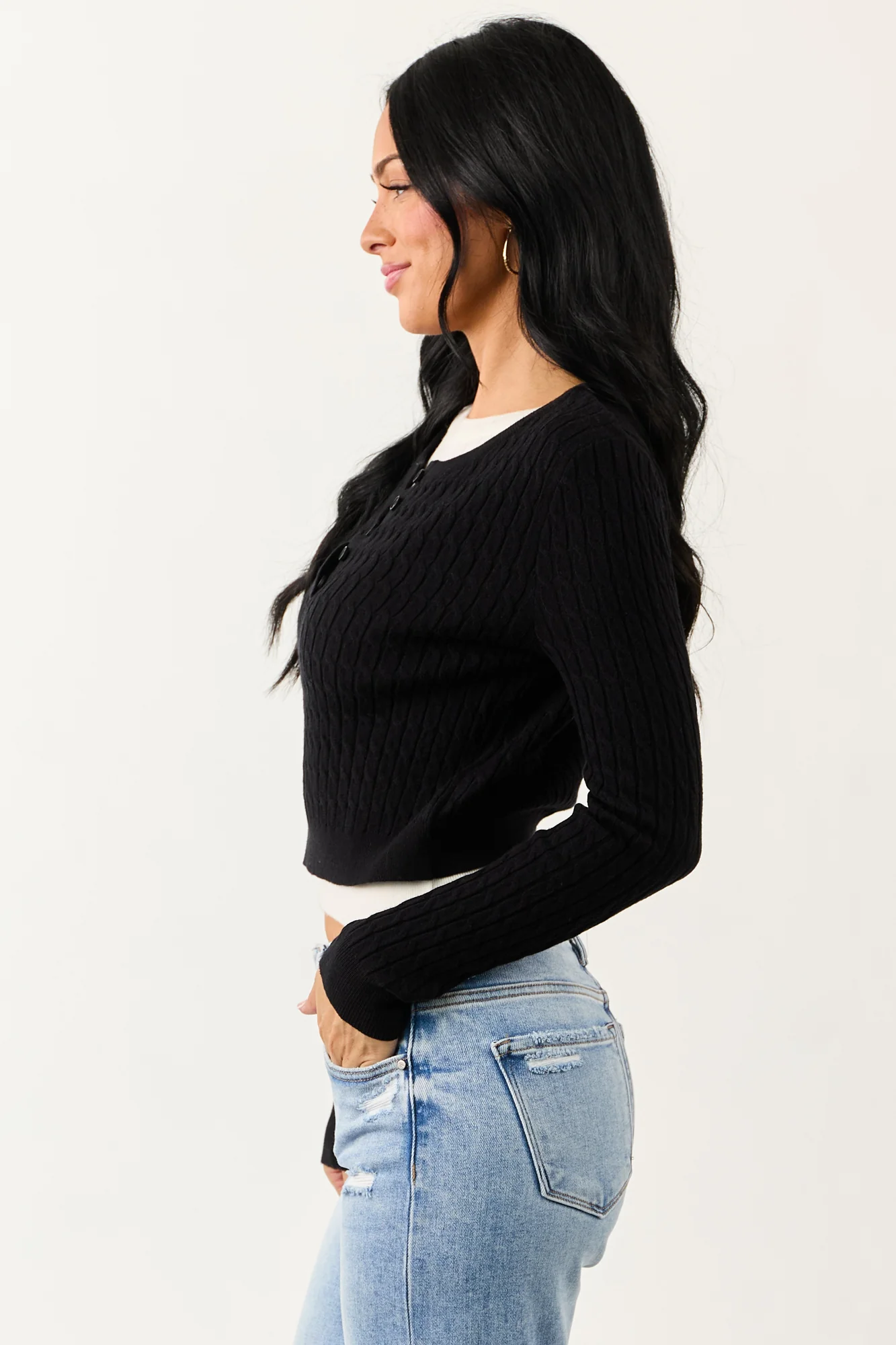 Stay stylish and cozy with our Black Cable Knit Sweater Top . This top features a stretchy cable knit design with a trendy built-in layer for extra warmth. It comes with an ivory contrast layer sewn in for added style. The half button-down front adds a chic touch to this versatile piece. Made of 50% Viscose, 28% Recycled Polyester, and 22% Polyester, this sweater top is perfect for the fall season. Available in sizes Small, Medium, and Large. Model is wearing a size Small. Model’s measurements: Height 59″, Bust 34″, Waist 26″.