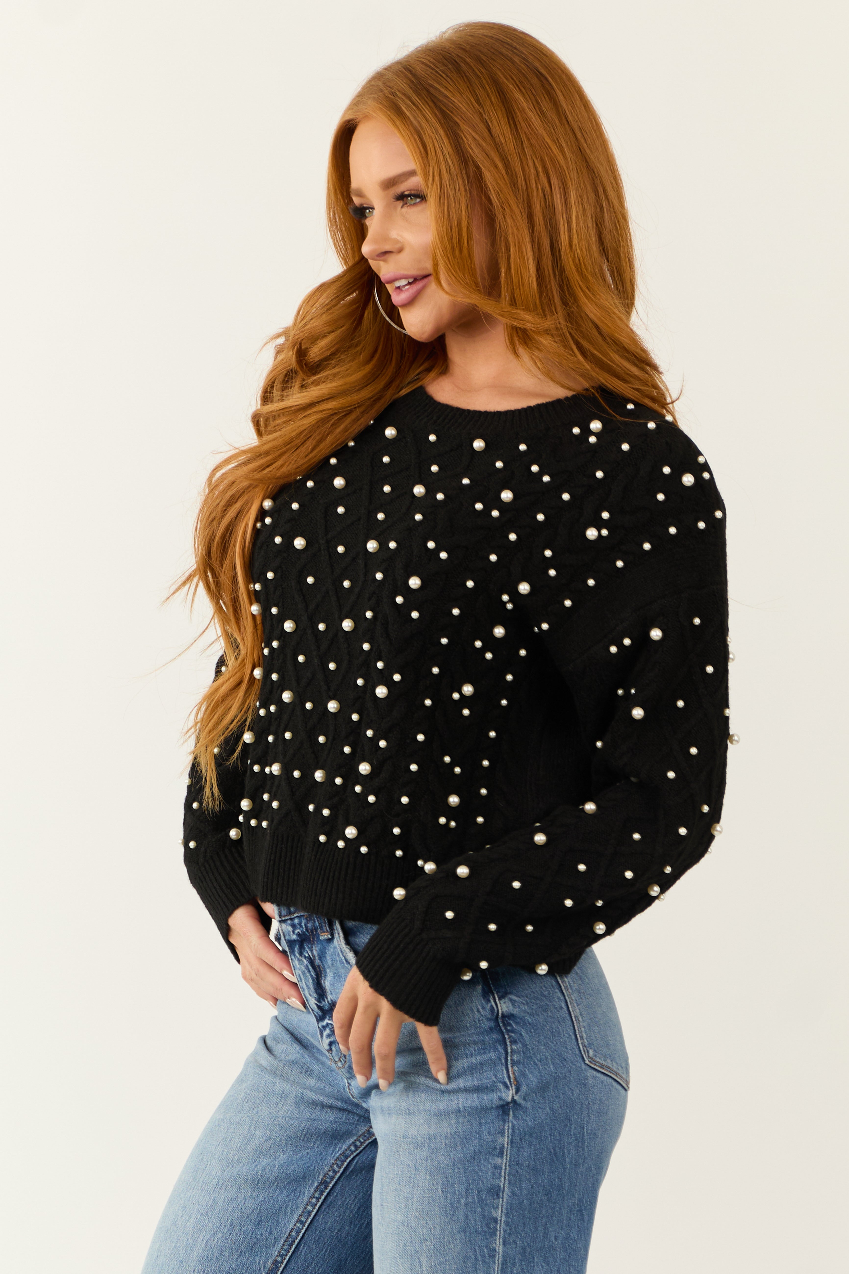 Stay cozy and stylish with our Black Cable Knit Sweater featuring pearl embellishments on the front and sleeves. This oversized sweater offers a stretchy fit, semi-cropped length, and ribbed trim for a chic look. Crafted from 74% Acrylic, 22% Polyester, and 4% Spandex, this sweater is both comfortable and trendy. The long sleeves, drop shoulder, and crew neckline add to its allure. Perfect for casual outings or evening gatherings. Hand wash cold and hang dry for best care. Available in sizes S, M, L, and XL.
