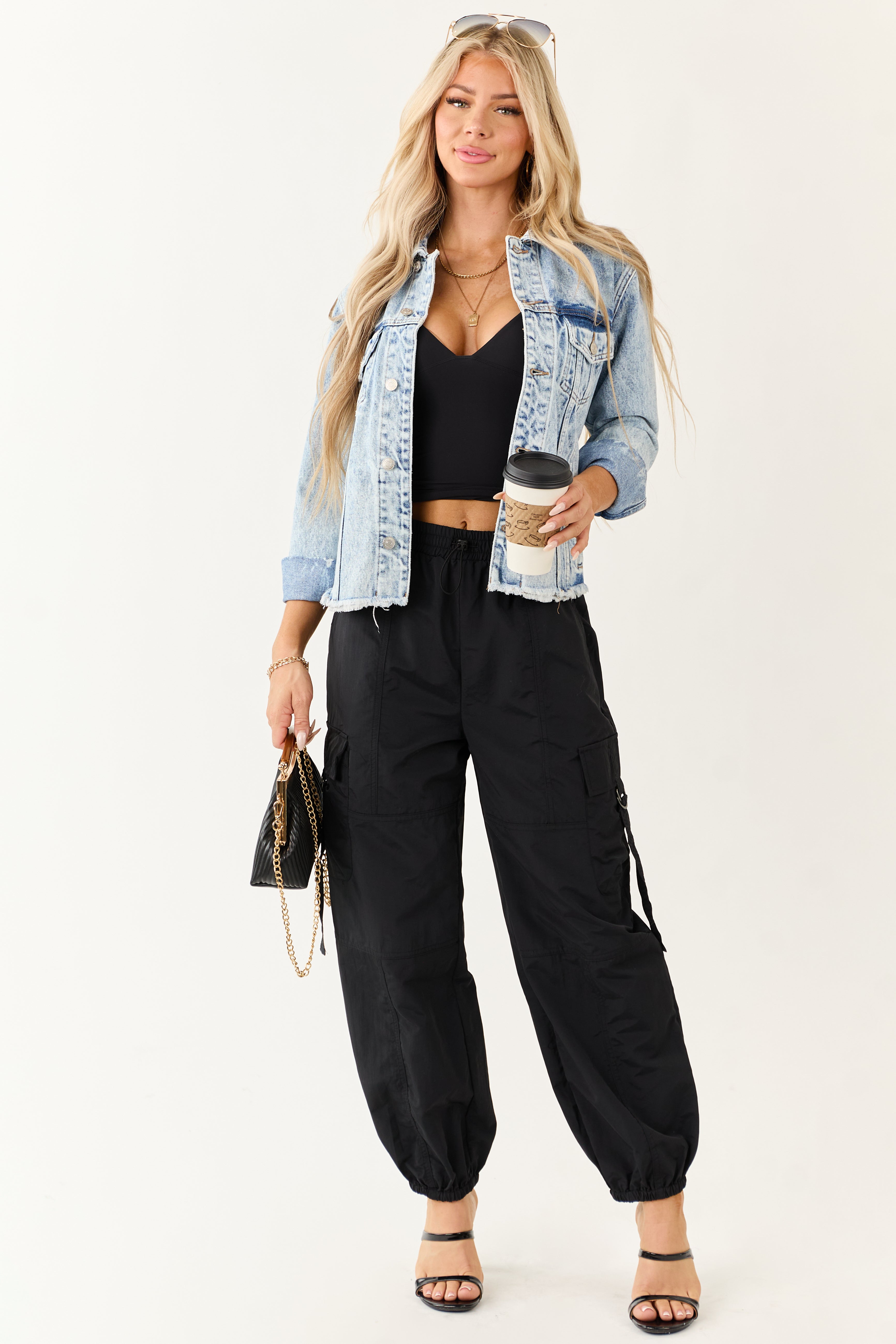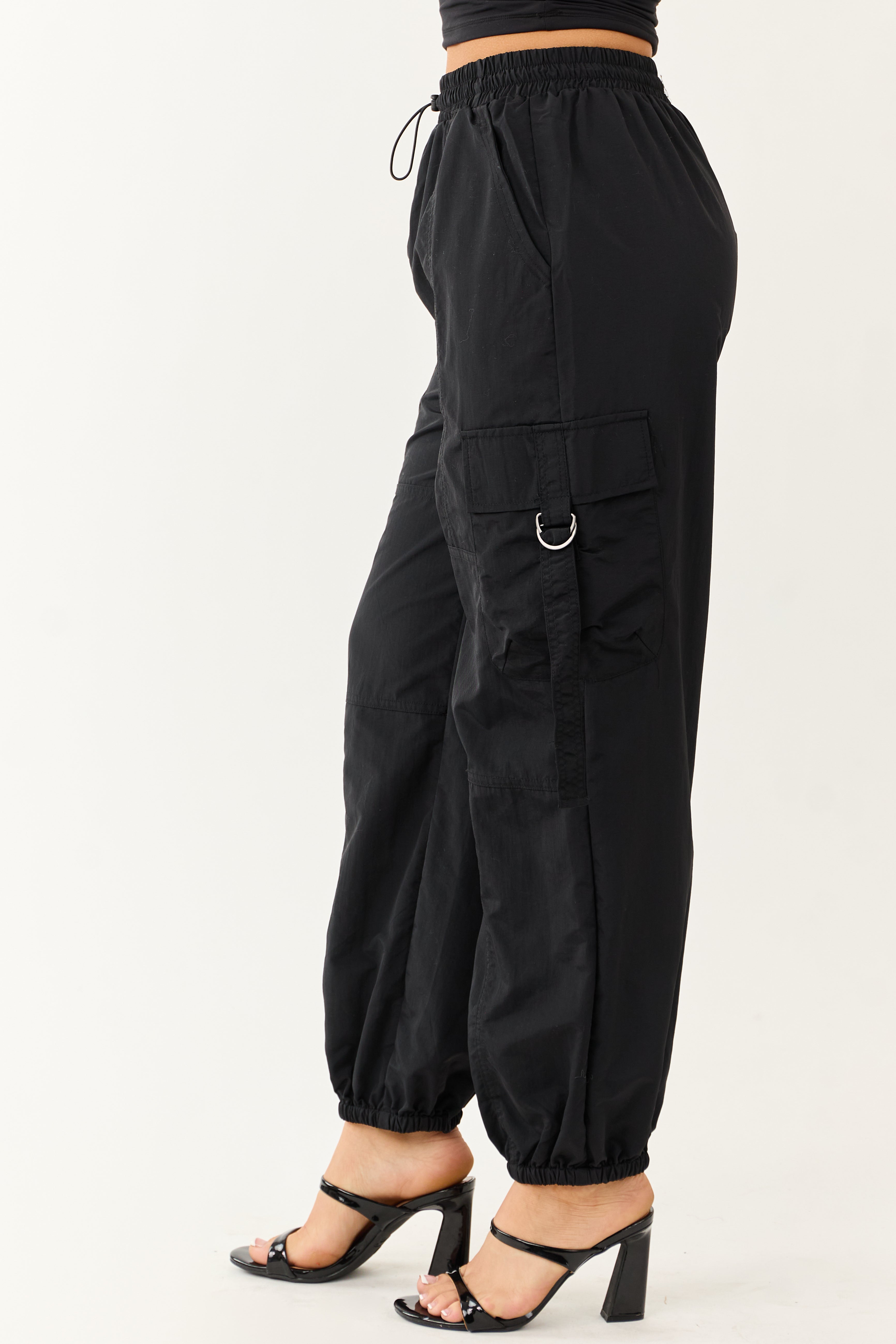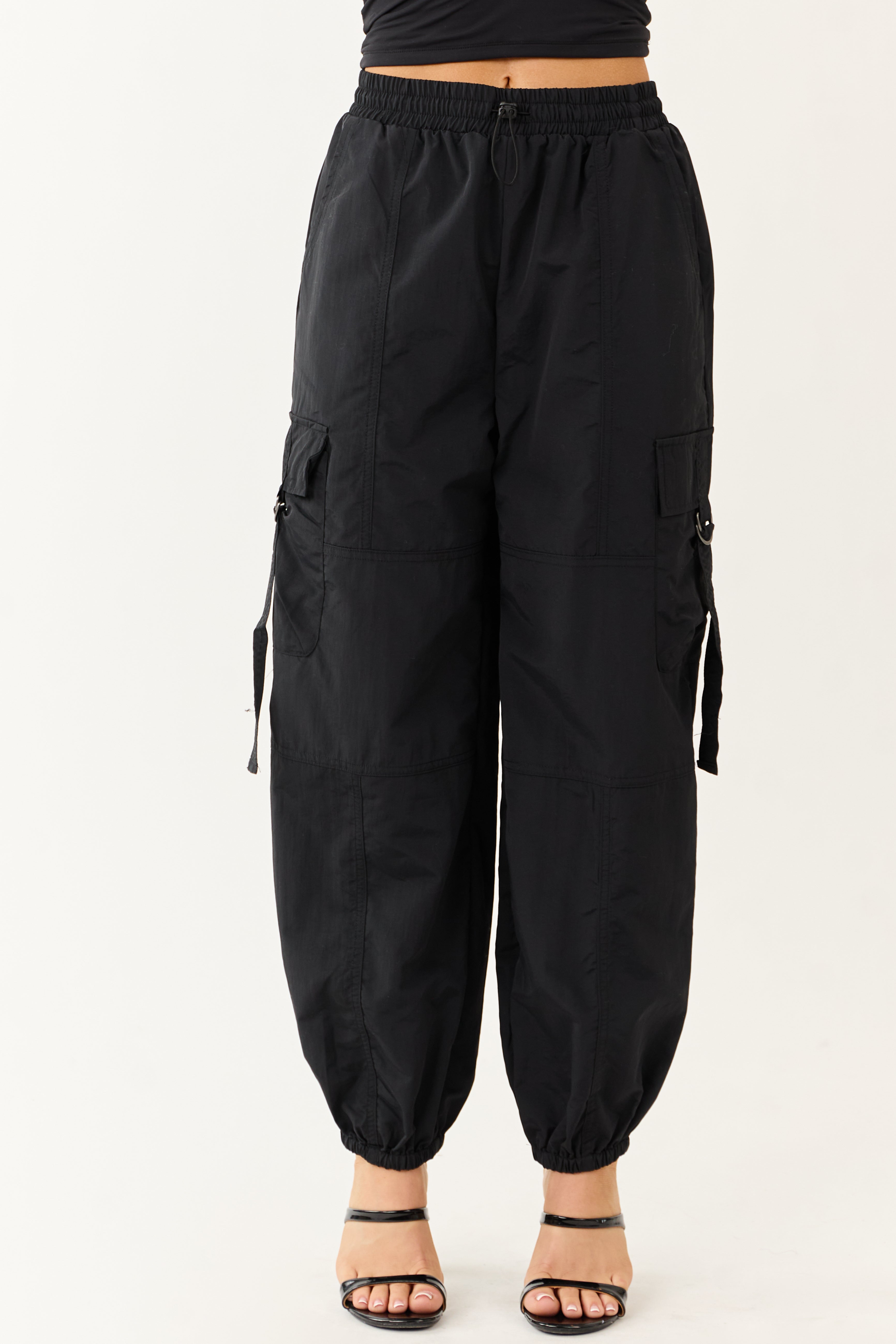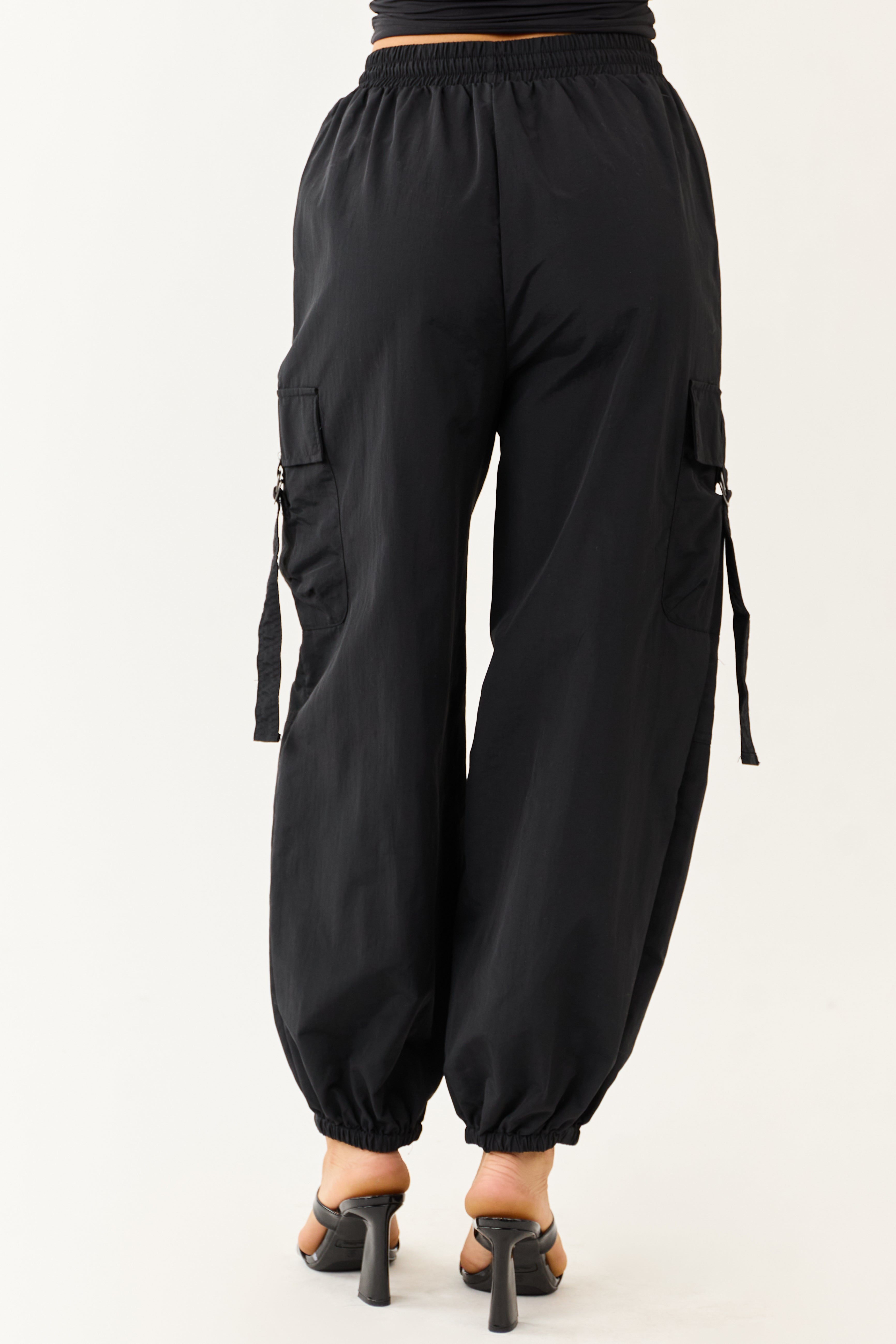 For a trendy and functional addition to your wardrobe, these Black Cargo Utility Jogger Pants are a must-have. Featuring a high-waisted design with a smocked waistband and bungy chord drawstring, these pants offer both style and comfort. The utility strap, side buckle strap cargo pockets, and elastic cuffs add a touch of practicality. Made from 100% Nylon, these jogger pants are durable and easy to maintain. Available in sizes XS to XL, these pants fit true to size and are perfect for any casual occasion.