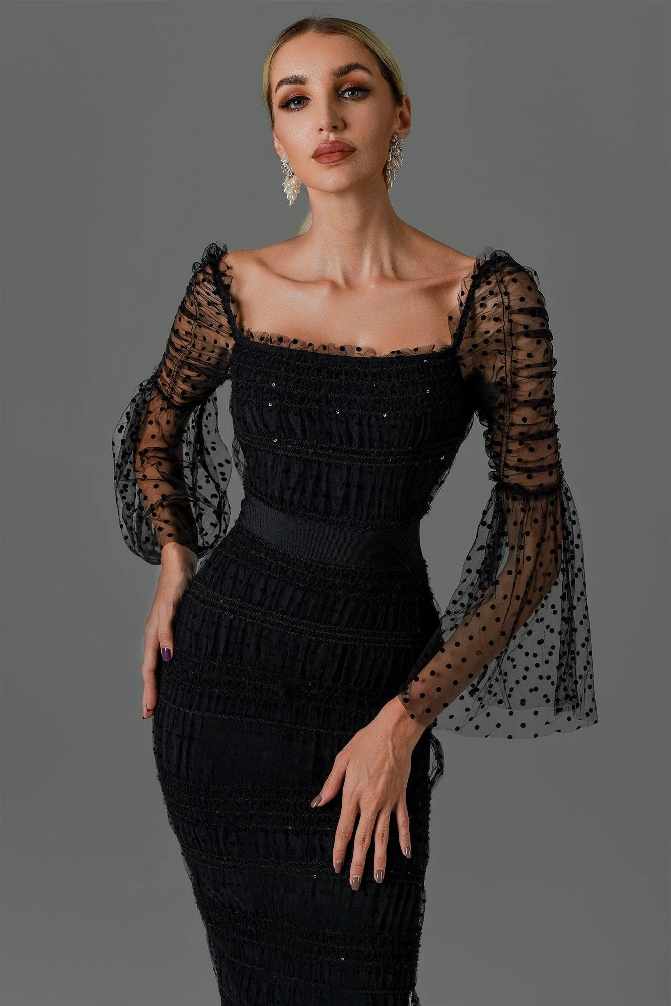 This glamorous Black Casual Long Sleeve Mesh Midi Dress is perfect for showing off your fashion sense at social occasions. Made with low stretch fabric, it comes in a variety of sizes from XS to L. The model is wearing size S with height 70.8″, bust 35.4″, hips 35.4″, and waist 25.1″. Please refer to our size chart for the best fit.