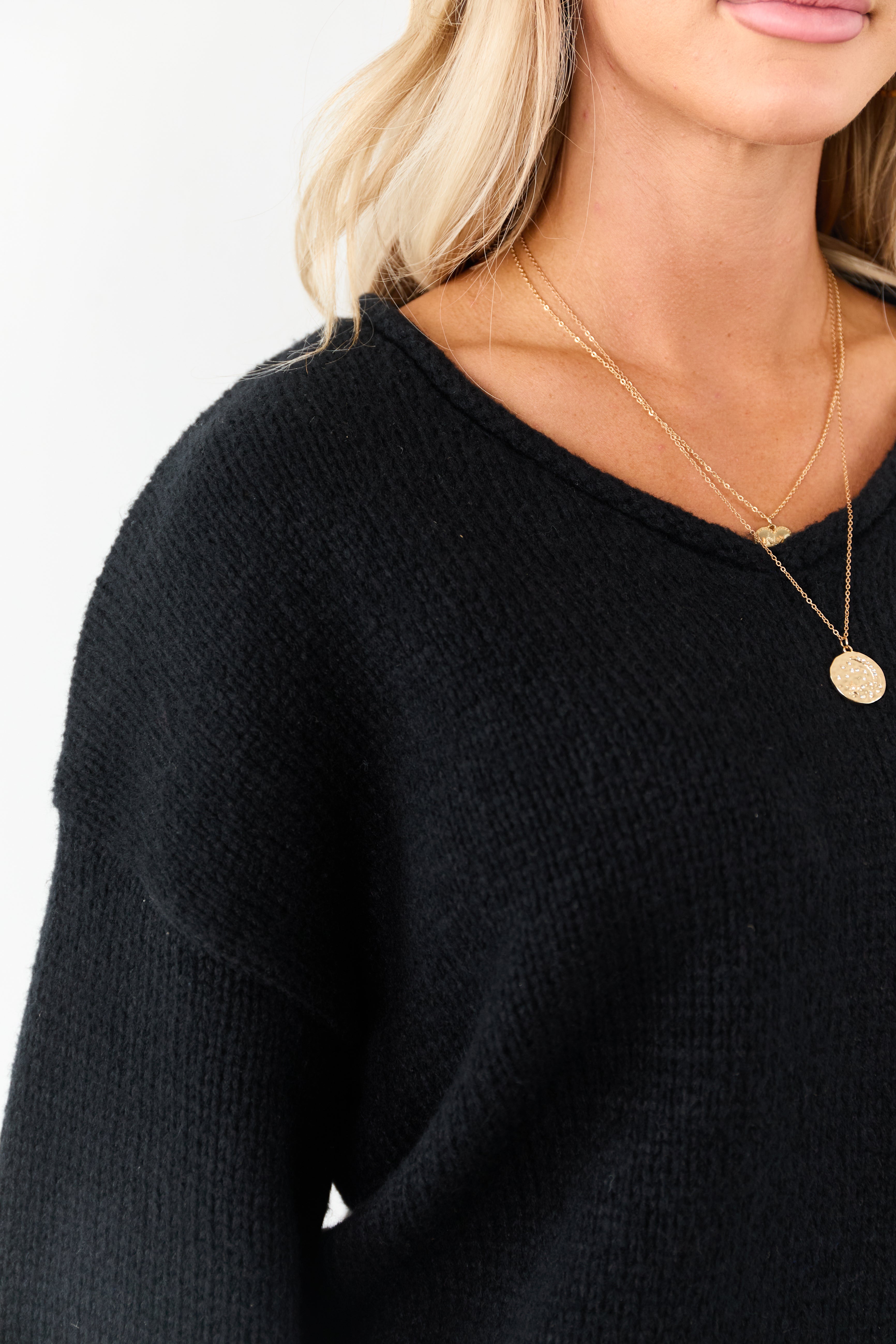 Stay warm and stylish in this black chunky knit V-neck sweater. A must-have for your fall wardrobe, this oversized sweater features a high-low hem, stretchy knit fabric, and rolled trim. Pair it with denim or skirts for a chic layered look. Made of 100% polyester. Available in sizes S, M, and L. Imported.