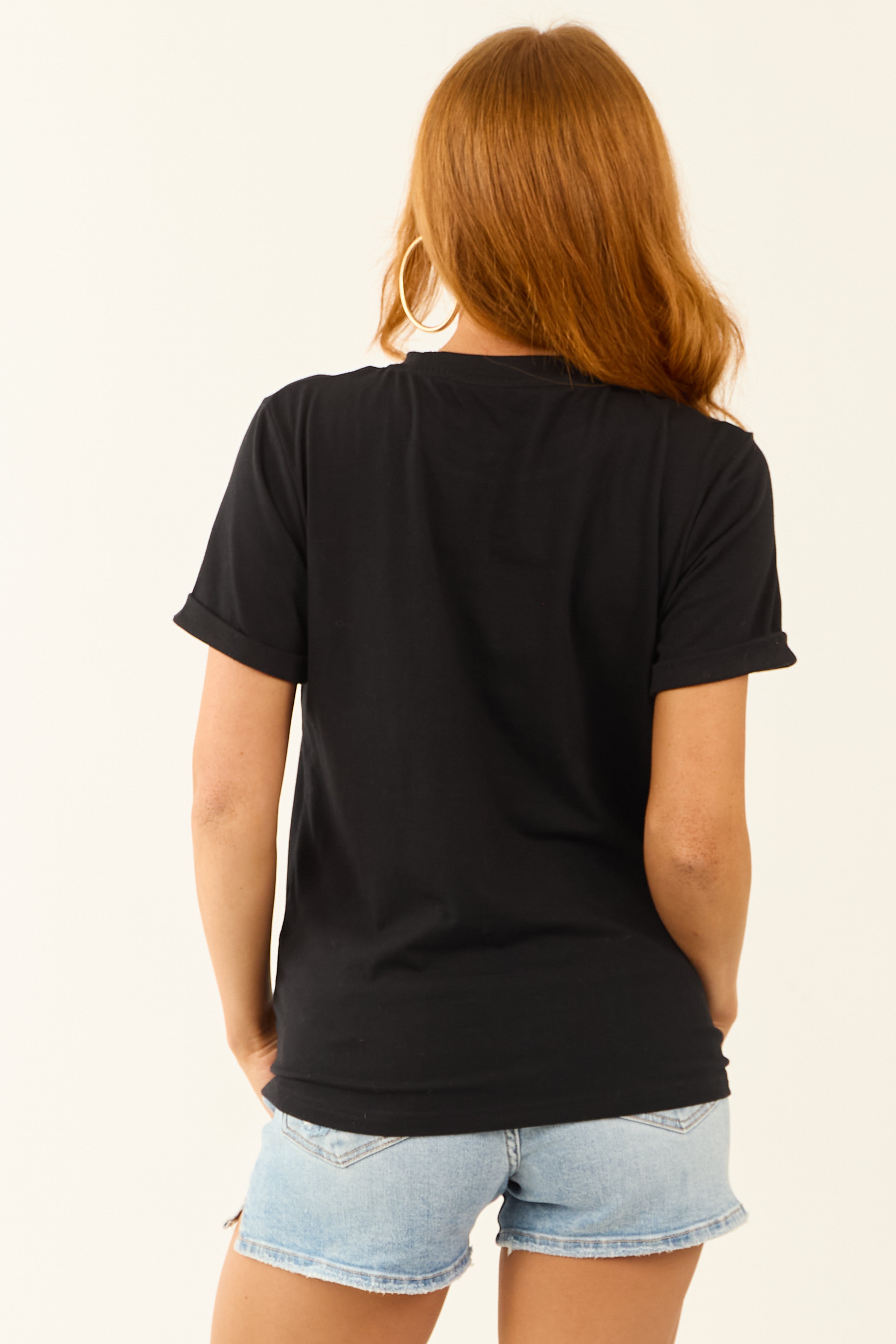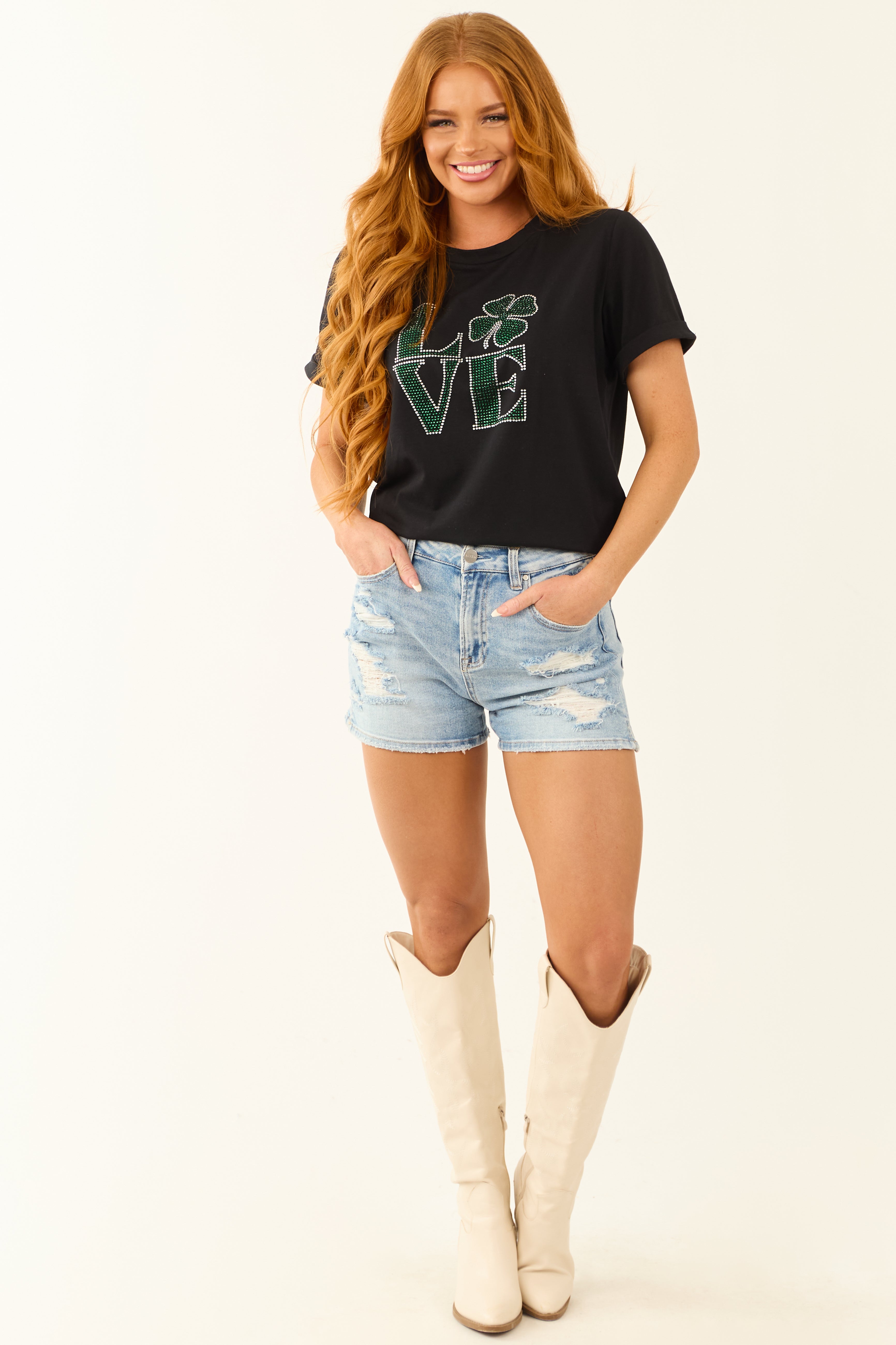 This BlackLoveSt. Patricks Rhinestone Clover Letter Tee is a stretchy knit shirt featuring a stylish graphic design in shades of white and green. Made with a ribbed crew neckline, rolled cuffs, and short sleeves for a trendy look. Crafted from 62% Polyester, 32% Cotton, and 6% Elastane, this tee offers both style and comfort. Machine washable. Available in sizes S, M, and L.