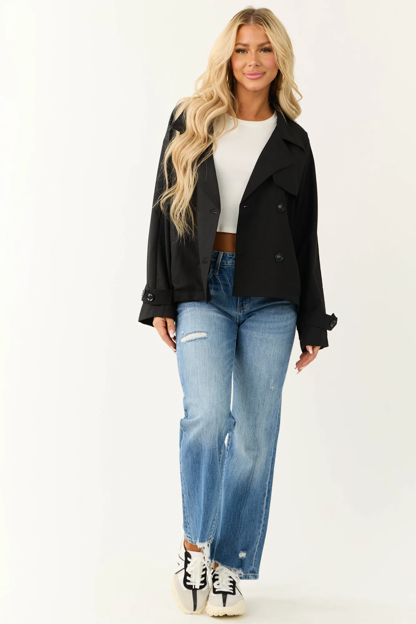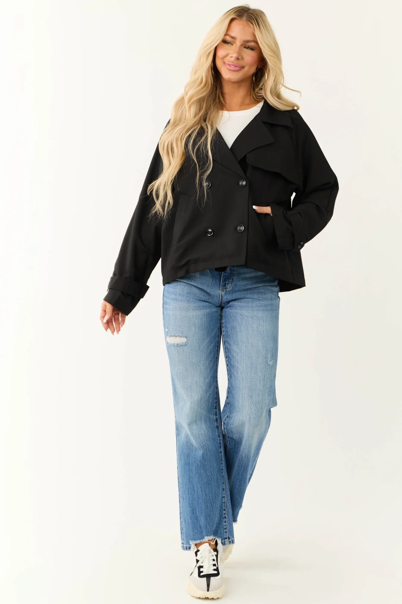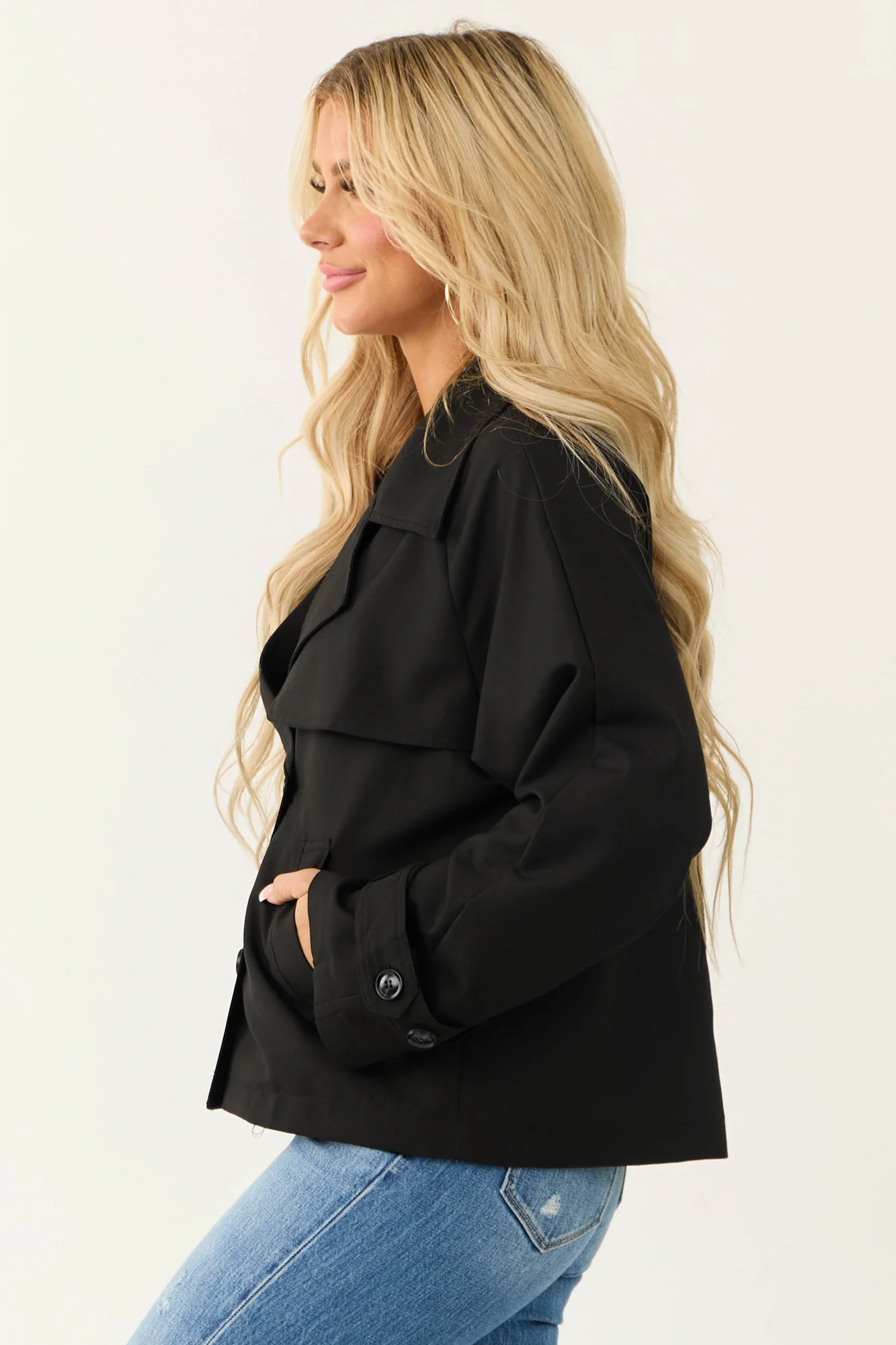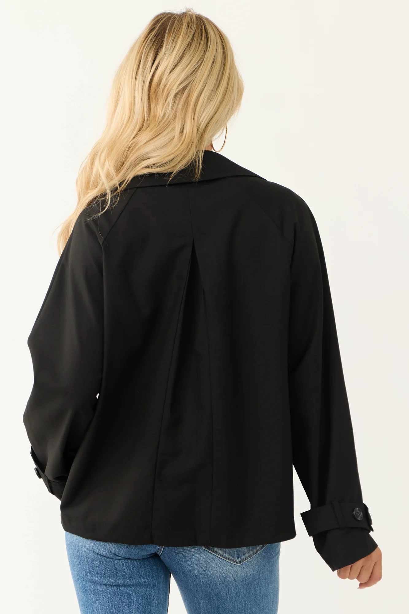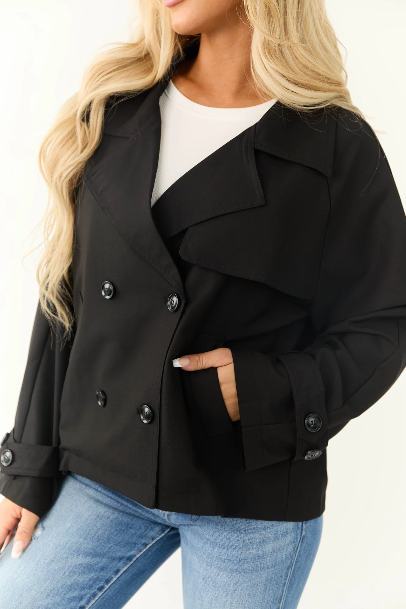 Stay stylish and cozy with our Black Collared Jacket featuring a double-button design. Crafted from non-stretchy woven fabric for a chic look, this jacket comes with side pockets, removable button straps on cuffs, and chest flap detail. Perfect for work or casual outings. Self-made from 80% Polyester, 16% Rayon, 4% Spandex. Imported. Care instructions: Hand wash cold, line dry. Iron on low if needed. Available in sizes S/M and M/L. Model is 58″ tall, wearing size Small. Size chart: S/M – Sleeve: 24″, Bust: 46″; M/L – Sleeve: 24″, Bust: 50″.