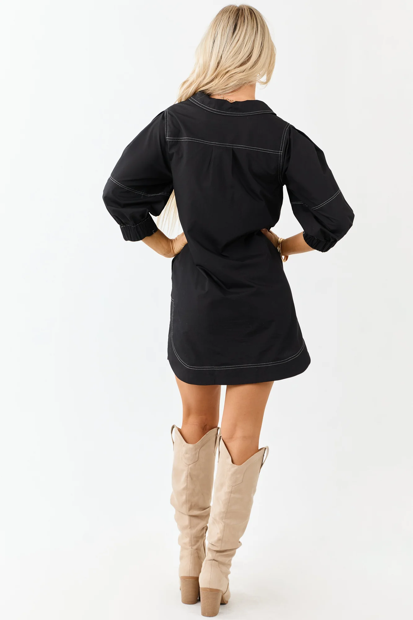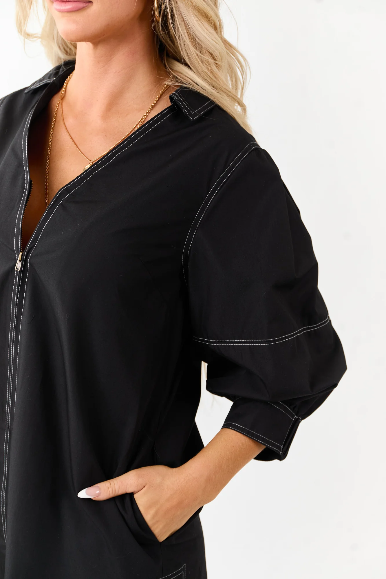 This sophisticated black collared mini dress offers effortless style with modern side hem details and contrasting stitching. Features side slits, elastic cuffs, and is crafted from 80% Polyester and 20% Cotton with a 100% Rayon lining. Perfect for a classy and chic look. Garment specifications for size Small: Bust 40″, Waist 42″, Length 35.5″. Elevate your wardrobe with this versatile piece. Model in size Small – Bust 35″, Waist 26″, Height 57″, Size 3.