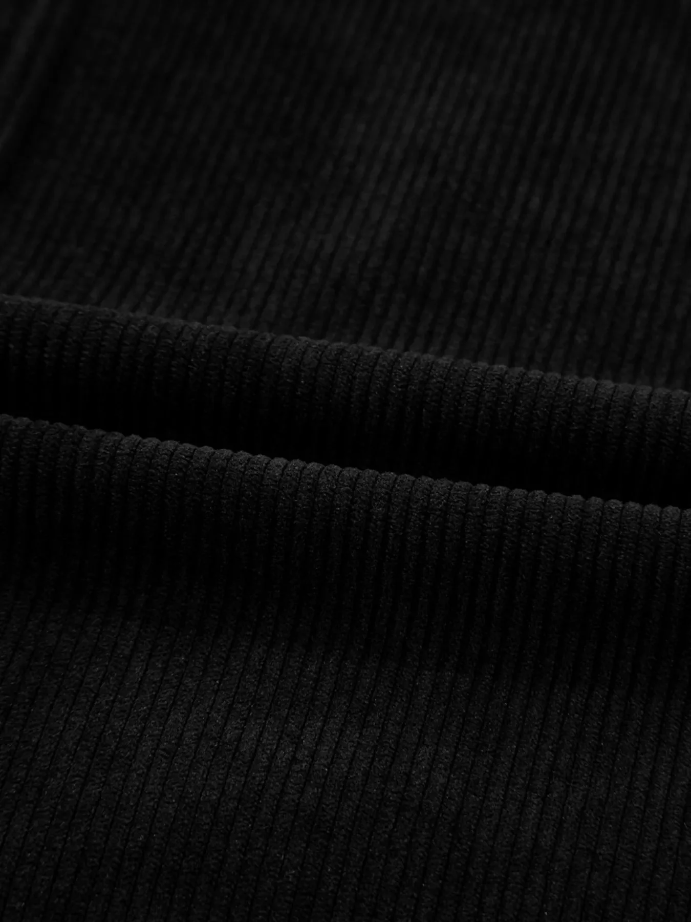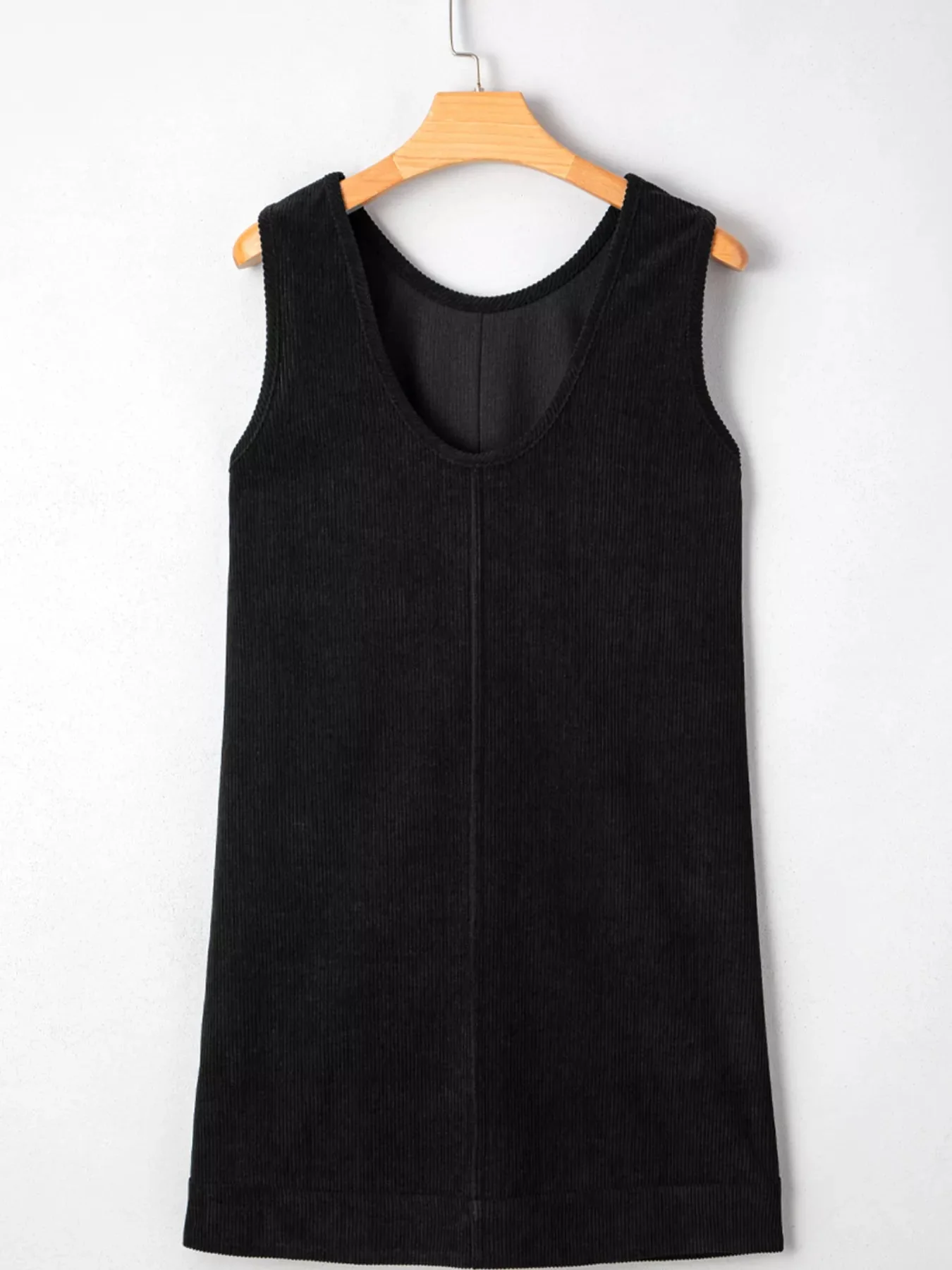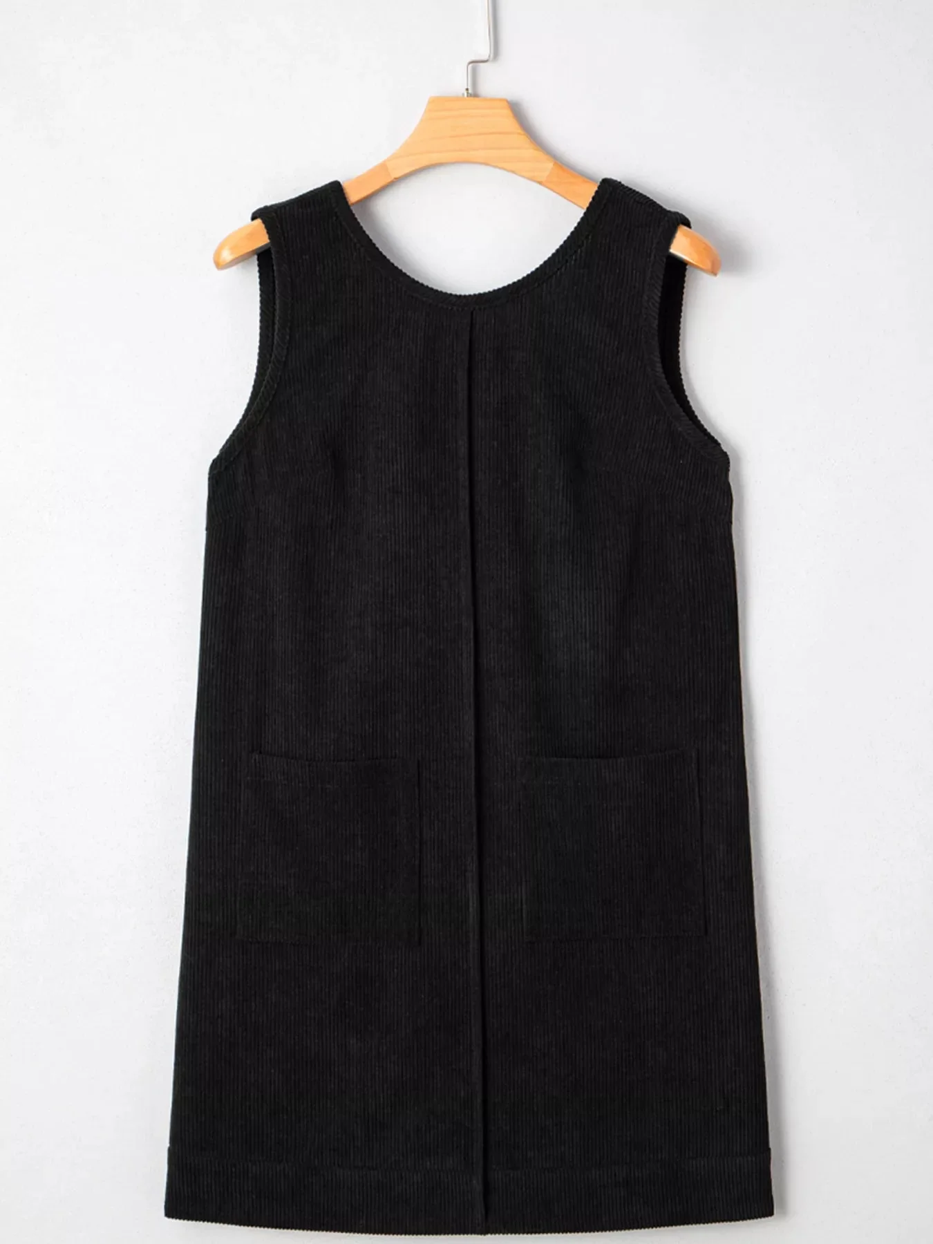 This Black Corduroy Mini Dress features pockets and ribbed stretch fabric, making it slightly stretchy for a comfortable fit. Crafted from 100% polyester, this dress is not lined for a breathable feel. Care instructions: Machine wash cold, tumble dry low. Imported. Measurement details: Length Waist Hip Bust – S: 34.3 35.8 40.9 37, M: 35 38.2 43.3 39.4, L: 35.8 40.6 45.7 41.7, XL: 36.6 43.7 48.8 44.9.