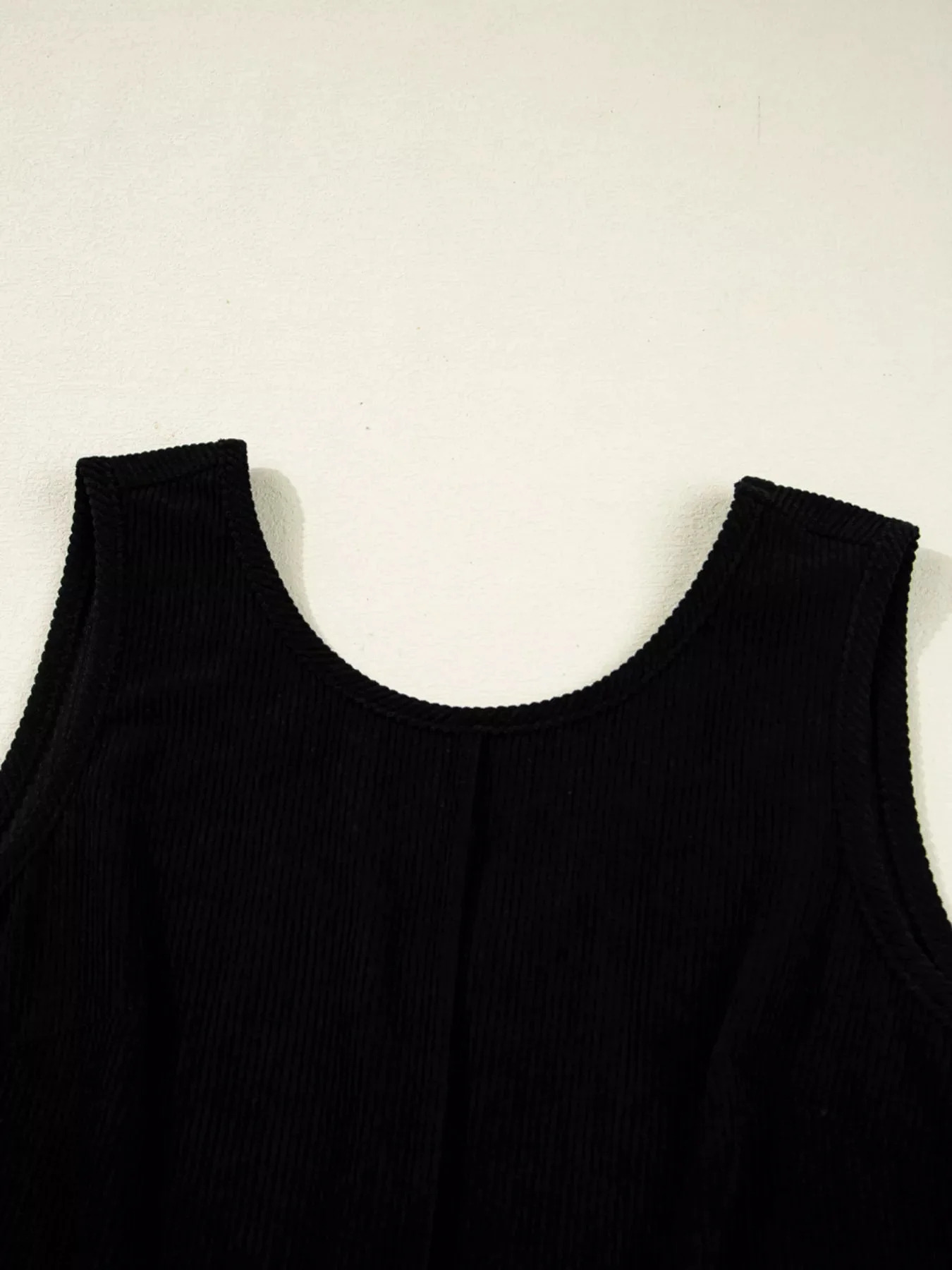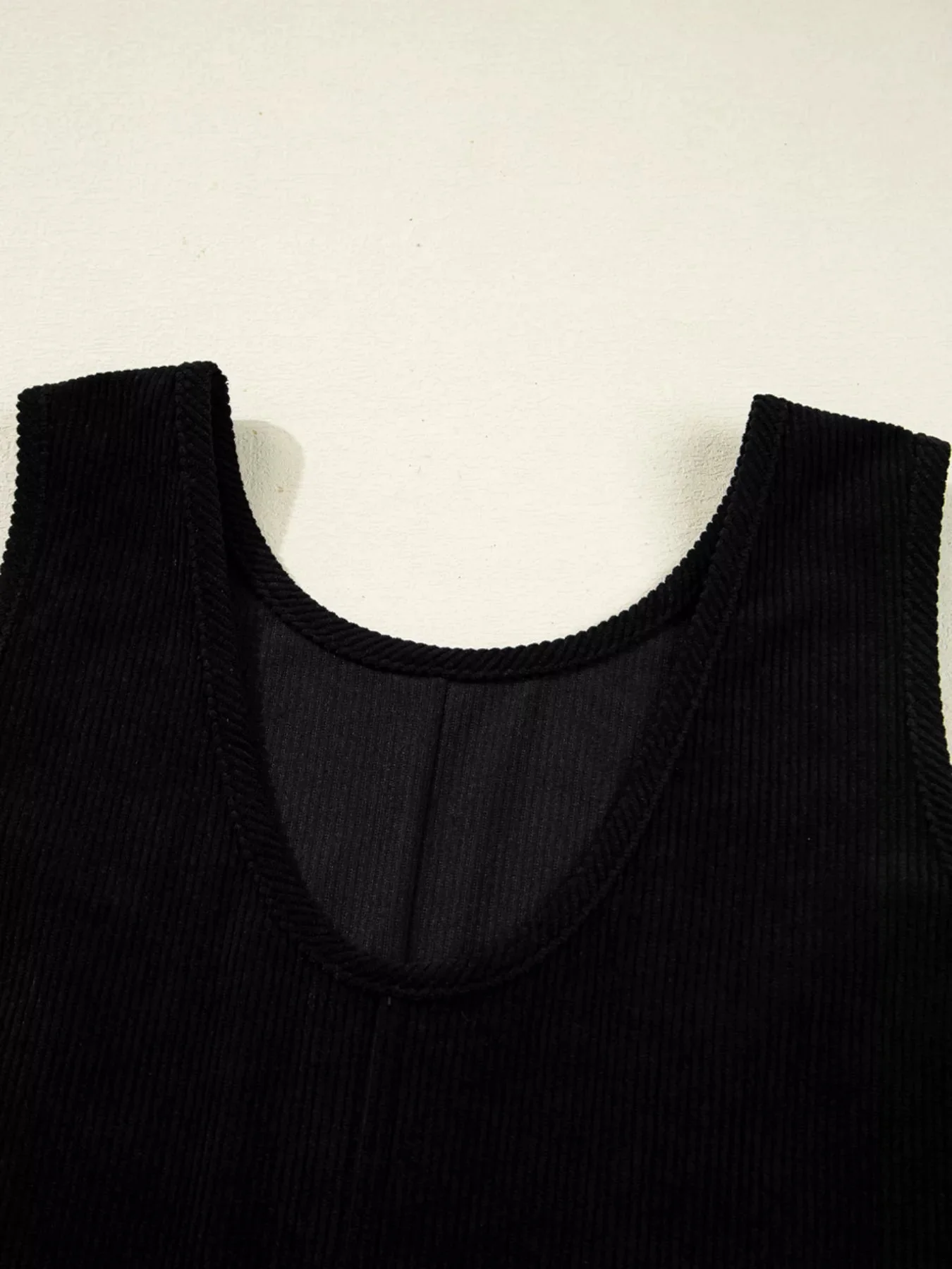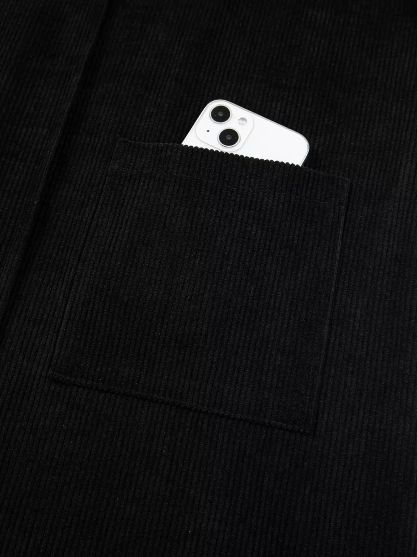 This Black Corduroy Mini Dress features pockets and ribbed stretch fabric, making it slightly stretchy for a comfortable fit. Crafted from 100% polyester, this dress is not lined for a breathable feel. Care instructions: Machine wash cold, tumble dry low. Imported. Measurement details: Length Waist Hip Bust – S: 34.3 35.8 40.9 37, M: 35 38.2 43.3 39.4, L: 35.8 40.6 45.7 41.7, XL: 36.6 43.7 48.8 44.9.