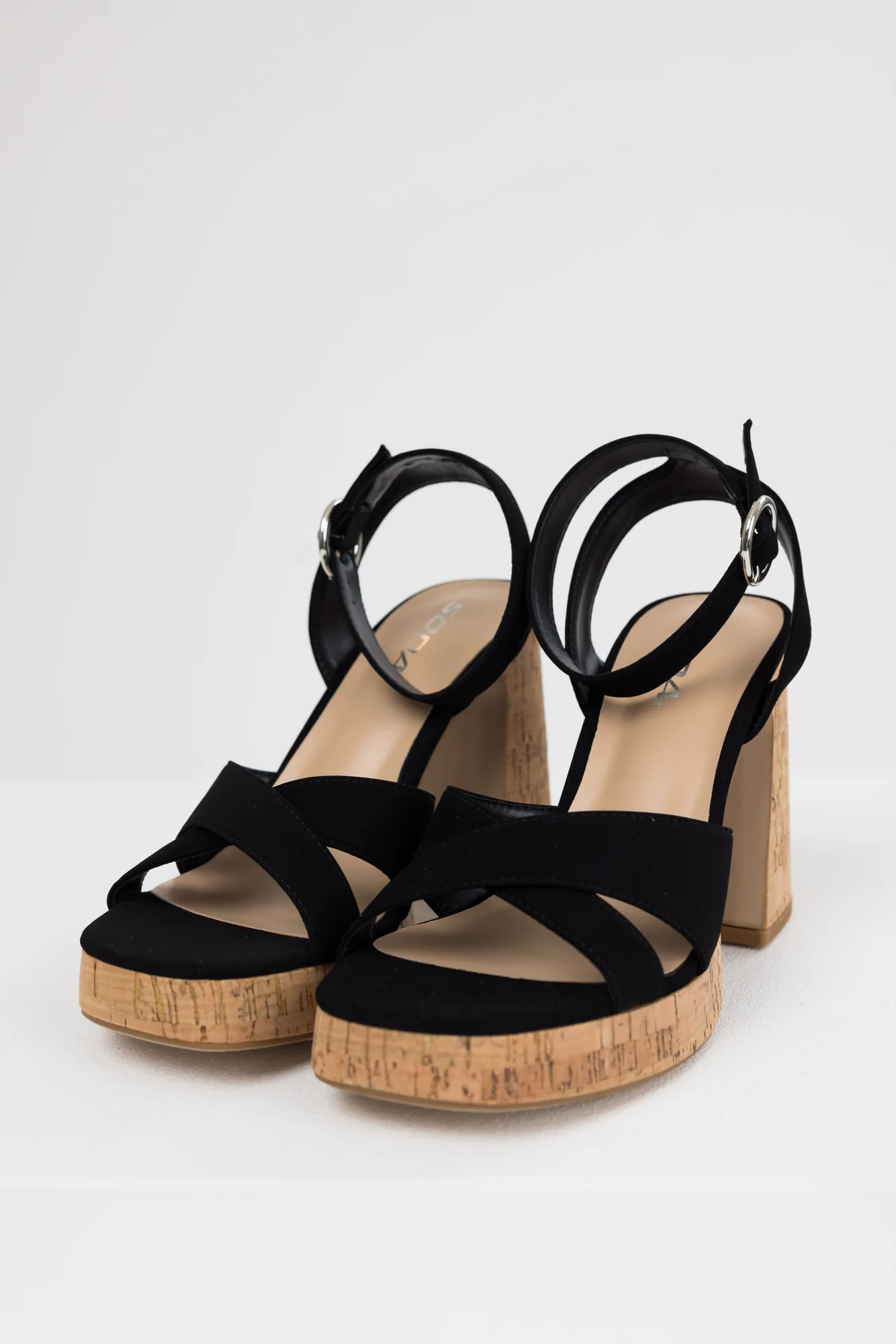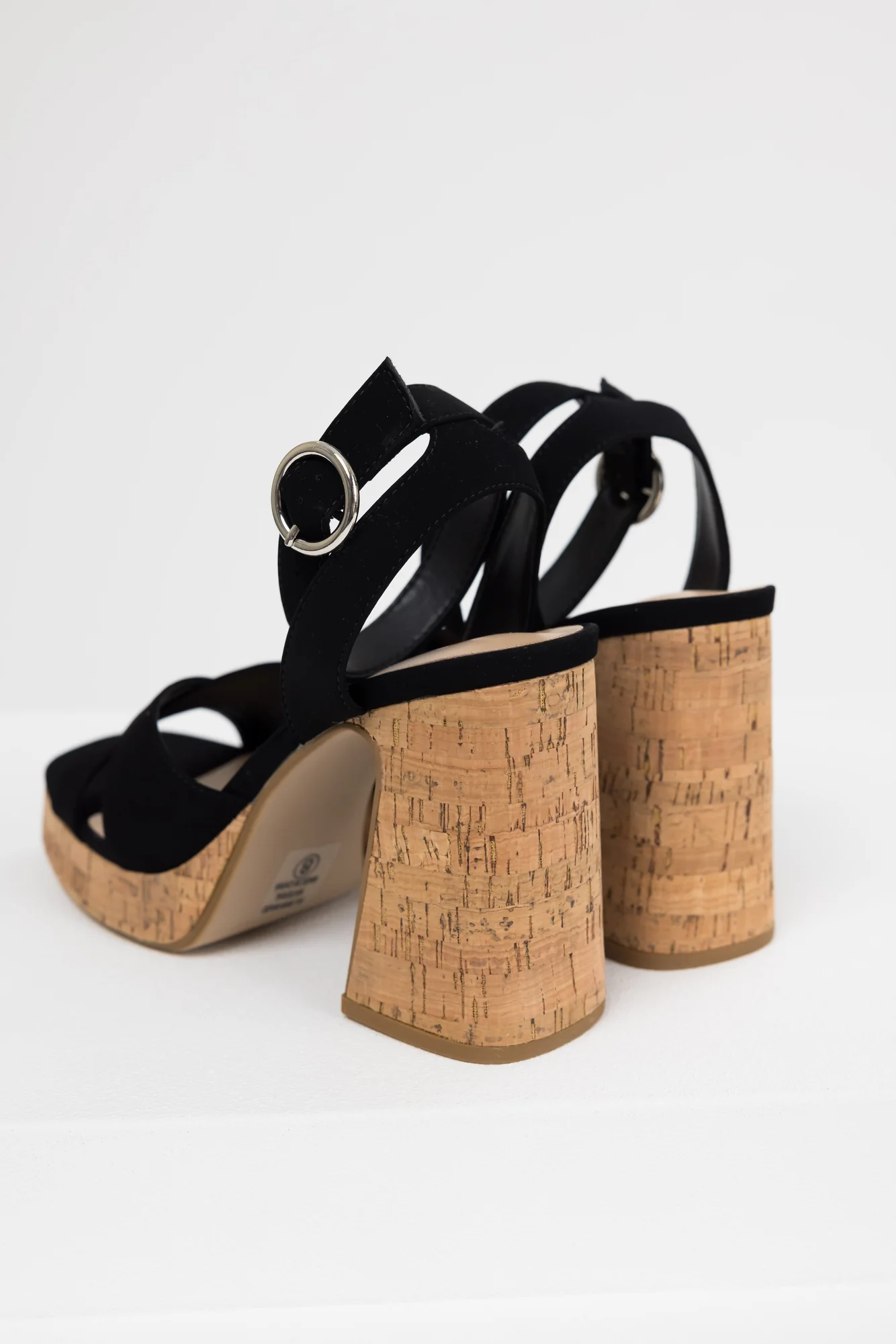 Step up your shoe game with these trendy Black Cork Platform Heels featuring a faux leather cross toe strap, square open toe, 4.25″ block heel, and 0.75″ platform. The adjustable buckle ankle strap adds flair to your outfit. Imported and measured on size 8. Elevate your style effortlessly!