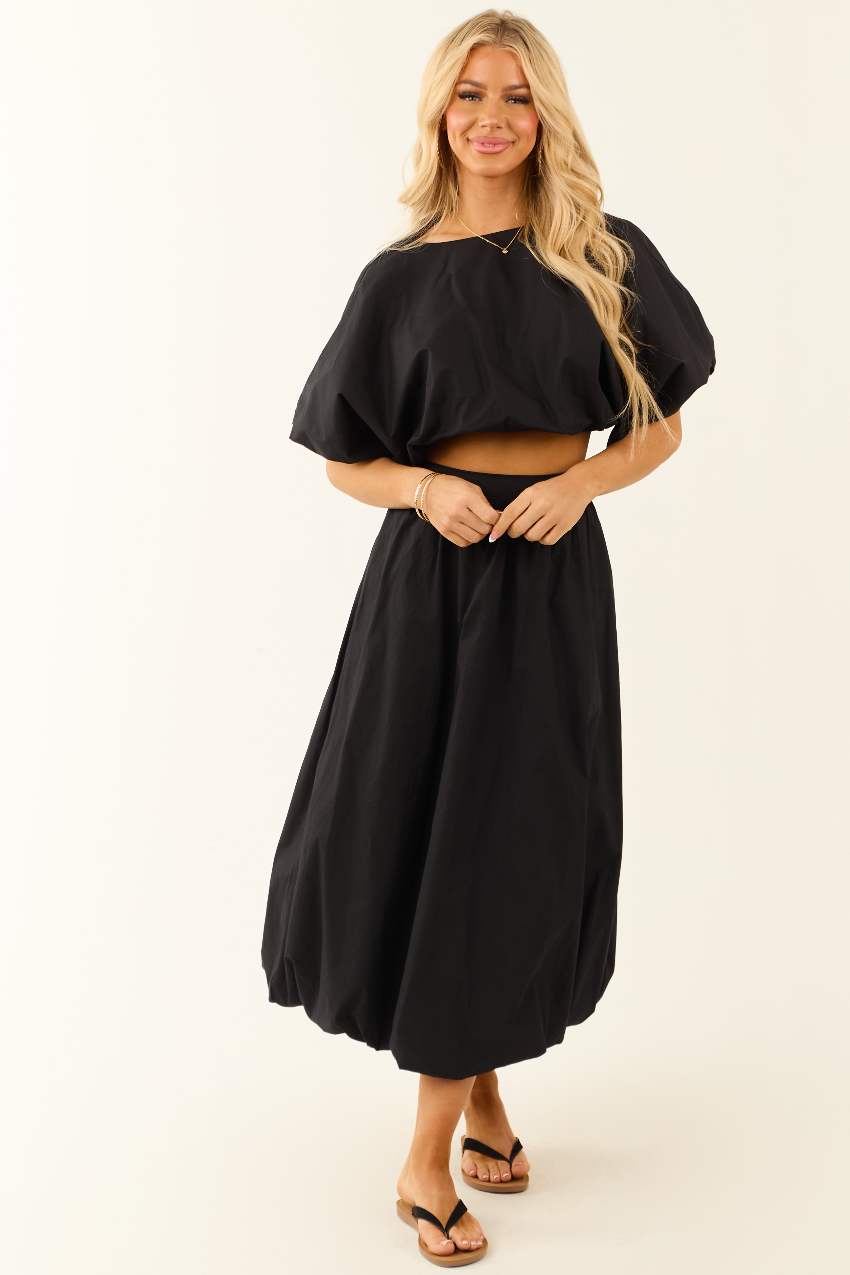 This black cotton poplin skirt set features half dolman sleeves, elastic cuffs and hem, keyhole back with button closure, and a square neckline. The skirt has a side zipper with hook and eye closure, is fully lined, and made of 100% cotton. Lightweight and comfortable, this set is perfect for a casual yet chic look. Hand wash cold, hang dry, and iron low if necessary. Available in sizes Small, Medium, and Large.