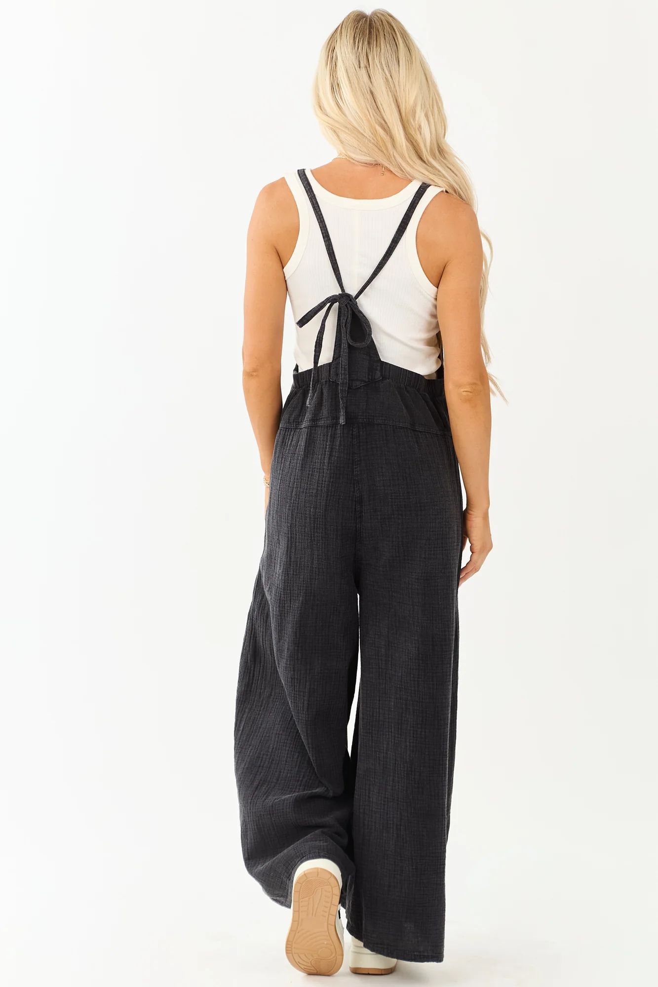 Stay comfortable and stylish all day in this versatile black cotton jumpsuit. Crafted from non-stretchy lightweight cotton, it features adjustable tie straps, an elastic back waistband, front pockets, and a lined torso for added comfort. Perfect for any casual occasion, this jumpsuit is a relaxed fit, forgiving in the waist, and has a wide-leg design. Available in sizes S, M, and L. Model is wearing size Small.