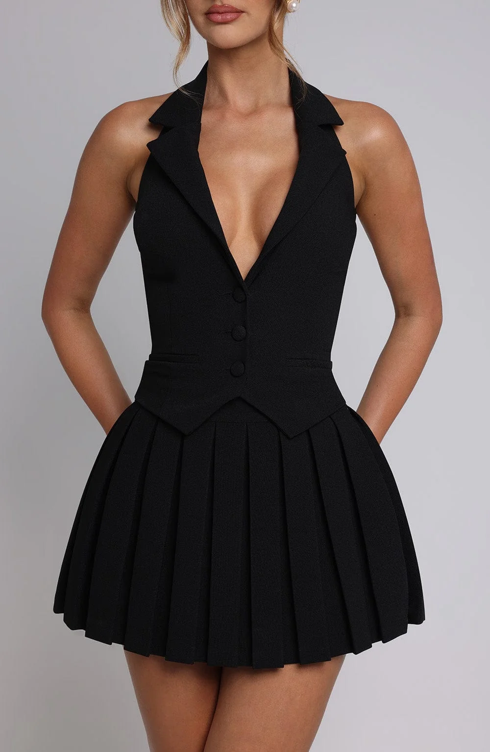 Experience the elegance of our Gretchen mini skirt in premium black crepe fabric. Designed with a mid-rise fit and box pleats, this skirt exudes a chic, tailored vibe. Perfect for any occasion, this mini skirt features an invisible zipper and is unlined for comfort. Complete your look with the Philippa top for a stunning matching outfit. Embrace sophistication with this versatile addition to your wardrobe. Model is shown wearing size XS. Available in multiple sizes.