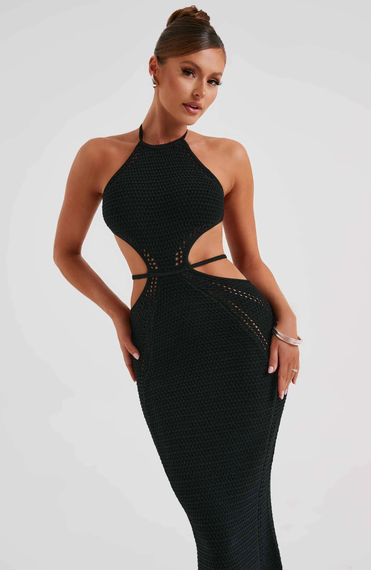 Indulge in effortless cool with our premium black crochet knit maxi dress. The body-hugging fit with halterneck and cut-out waist exudes style. Featuring a backless design with waist tie accentuating your figure. Moulds to your body, ensuring a sleek silhouette. Ideal for various occasions. Made from premium crochet knit fabric. Maxi length. Available in sizes XS, S, M, L, XL, XXL.