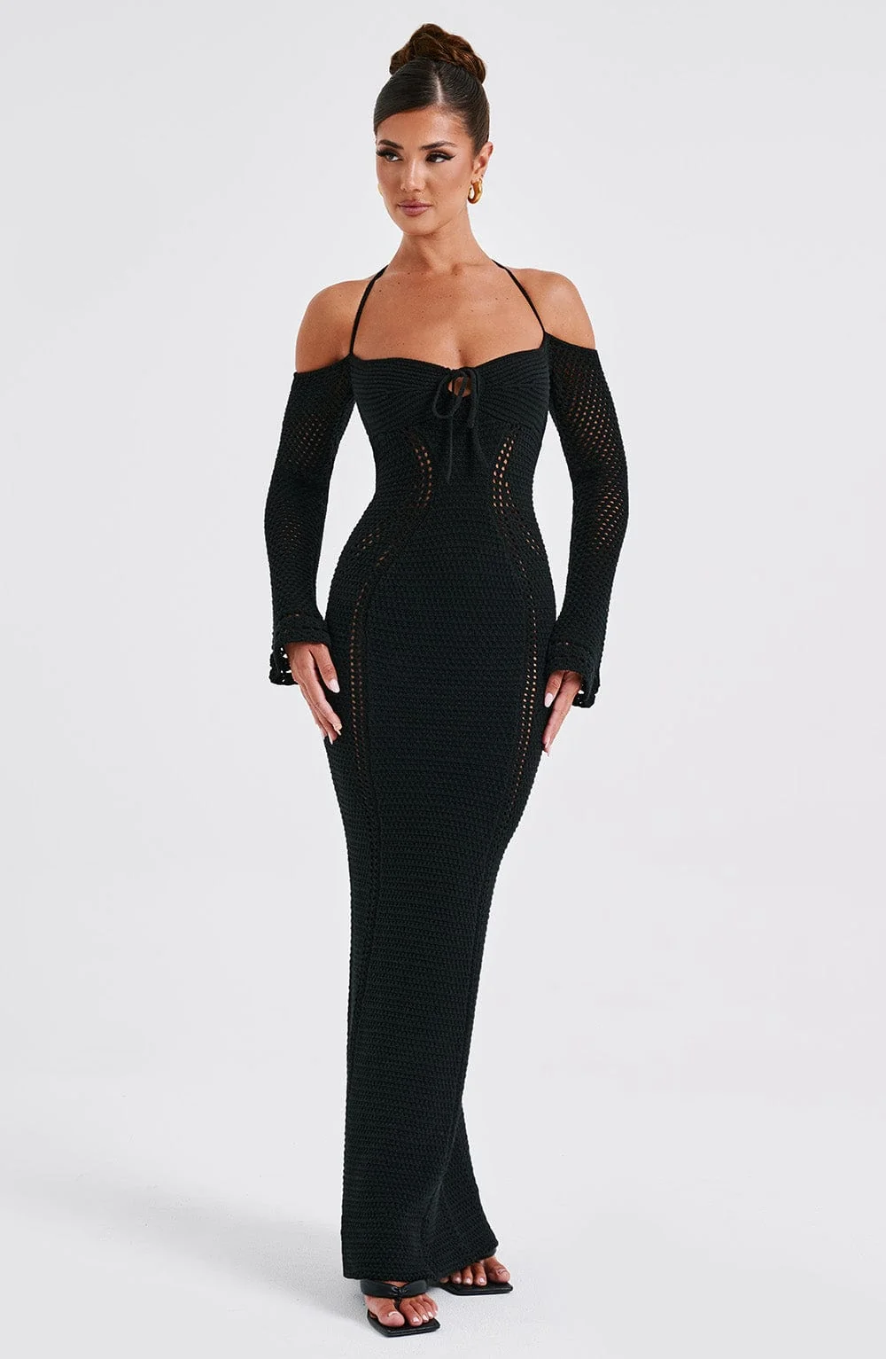 Indulge in the luxurious comfort of our Black Crochet Knit Off-Shoulder Maxi Dress. Crafted from premium crochet knit with a gentle stretch that elegantly conforms to your silhouette. Featuring stylish off-shoulder design, tie detail bust, and long flared sleeves. This maxi dress exudes both sophistication and comfort. Perfect for any occasion, pair with heeled mules for a chic look. Color: Black. Available in sizes XS to XXL.