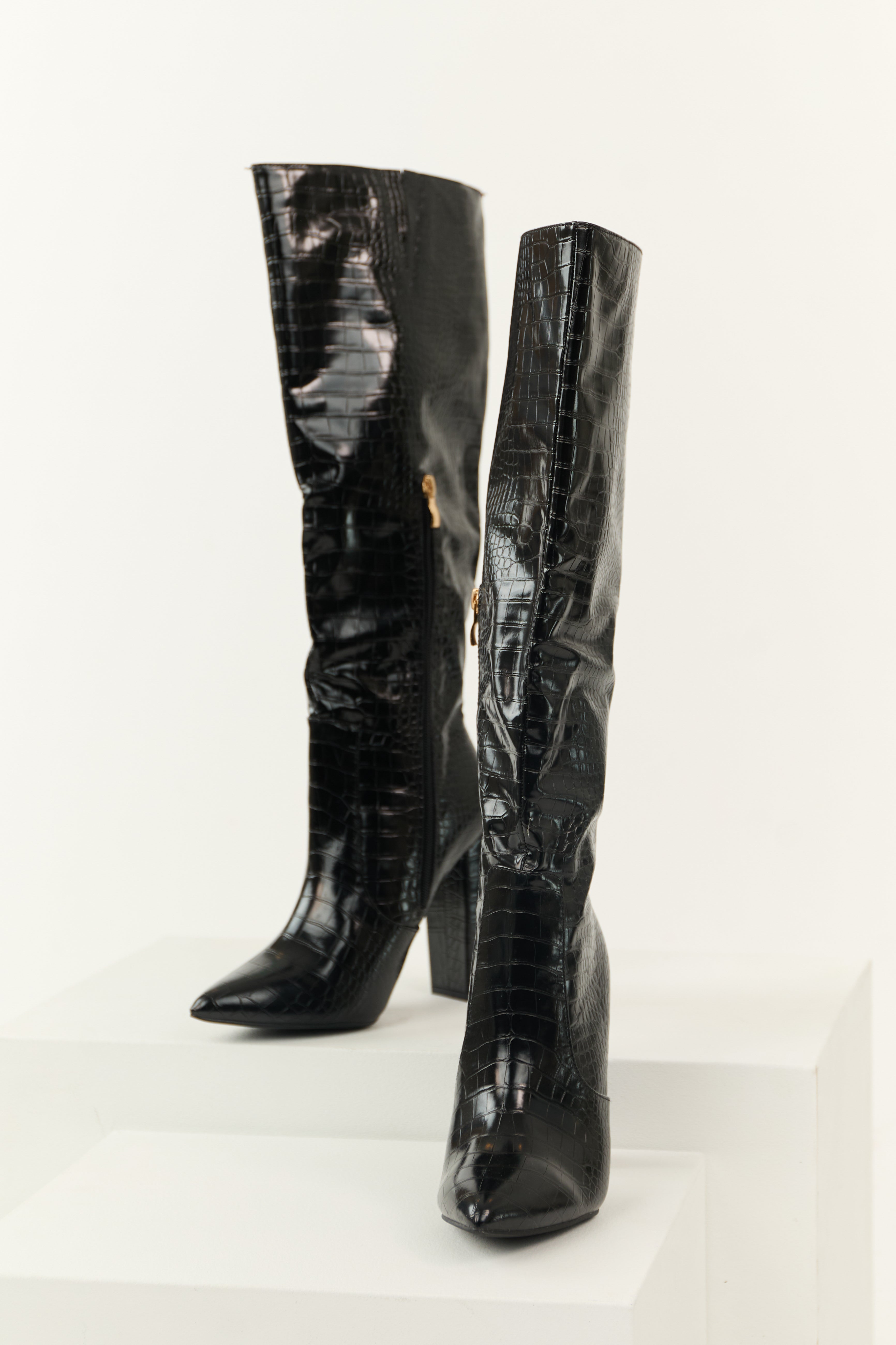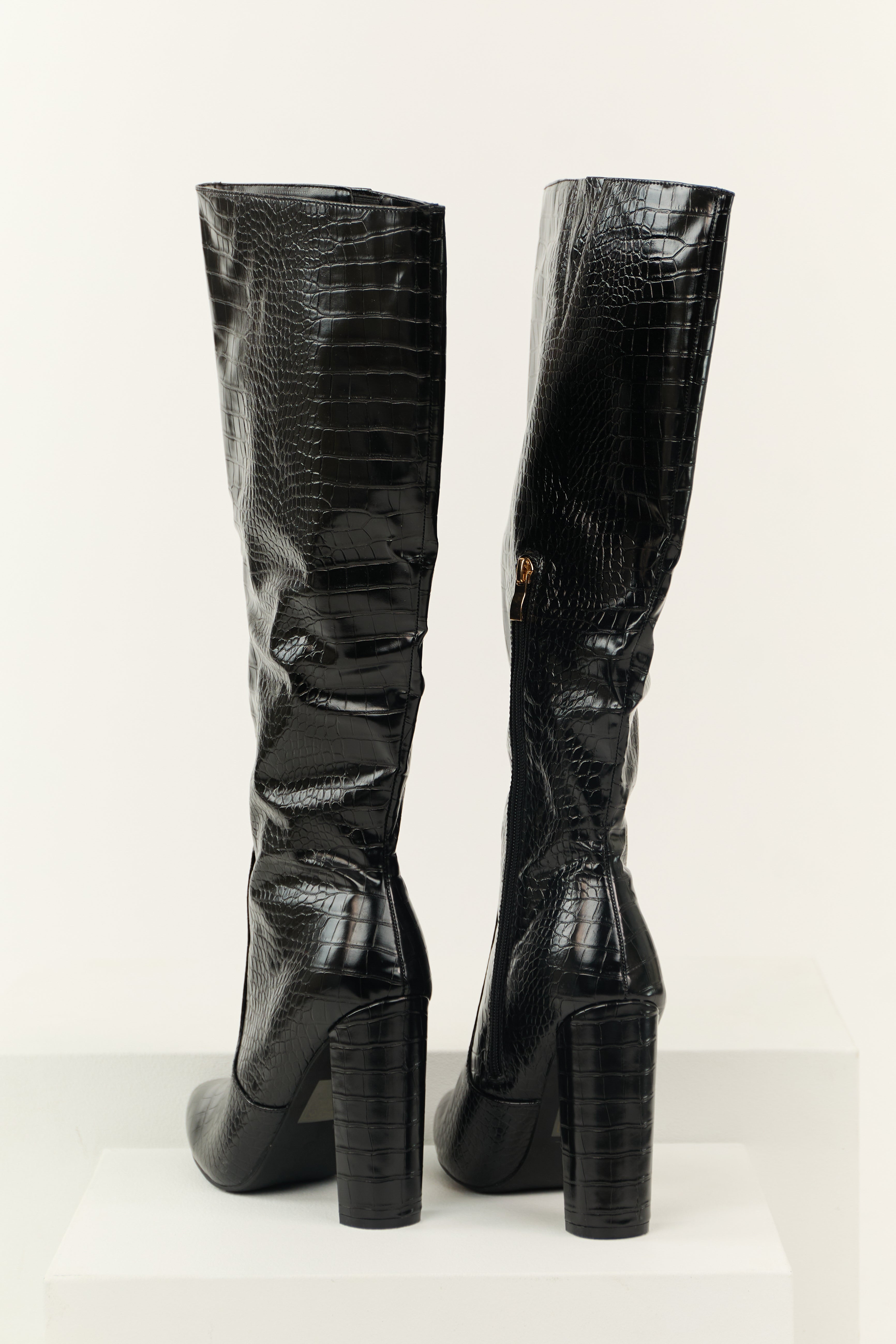 Step up your fashion game with these black faux leather crocodile heeled boots for women. Crafted for style and comfort, these non-stretchy boots feature a side zipper, pointed toe, and a shaft height of 18 inches. With a circumference of 16 inches and a striking 5-inch heel, these imported boots are perfect for a chic night out. Elevate your look with these stylish heeled boots that are designed to impress.